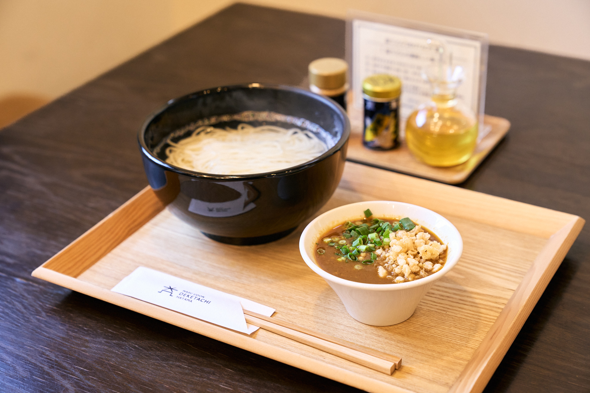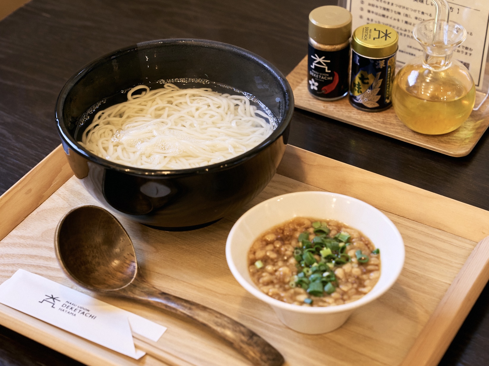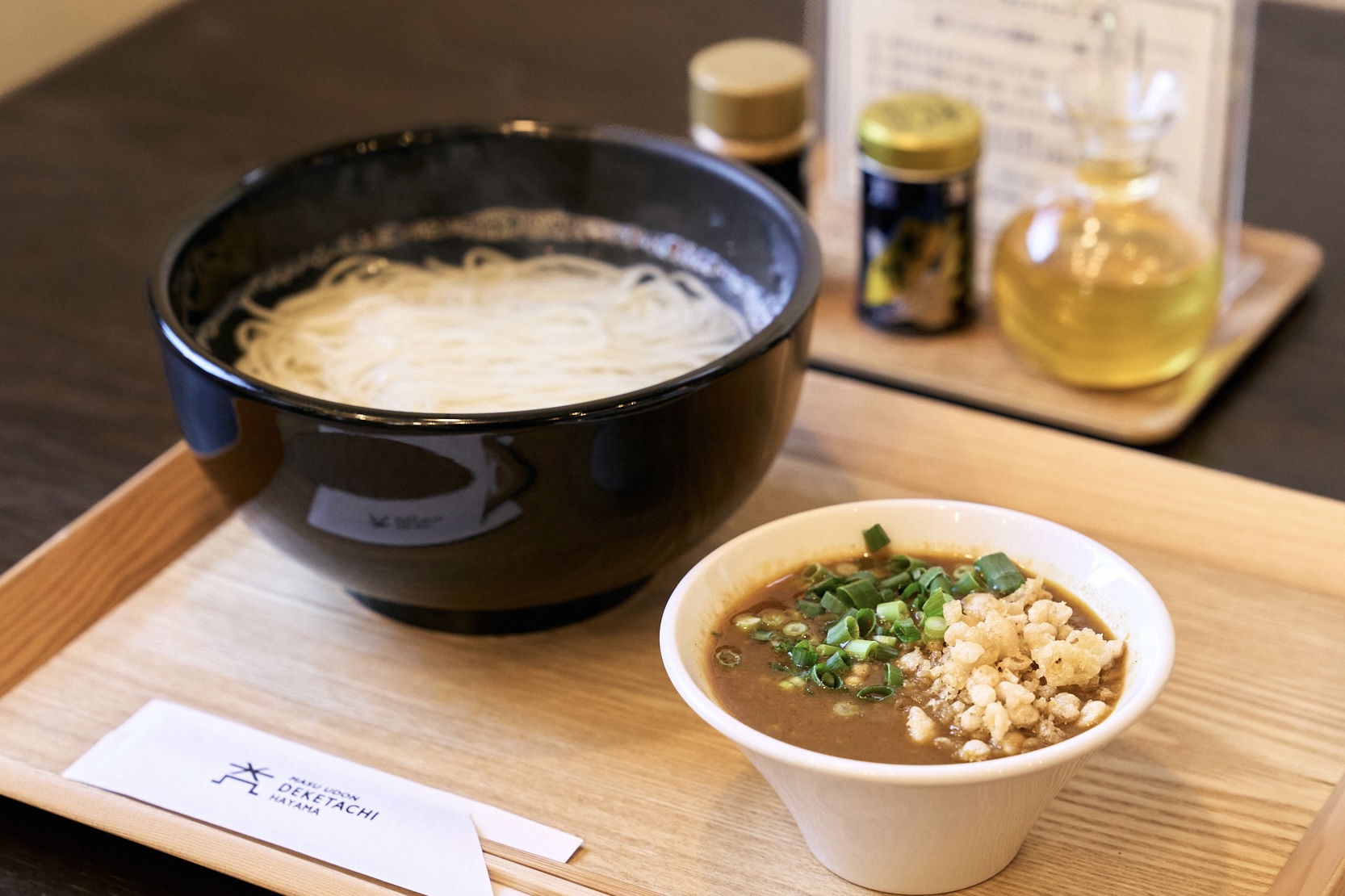 甘辛いつけ汁でいただく細麺うどんは九州スタイル。最初はそのままで、後半は卓上の七味唐辛子や山椒オイルを好きに加えて食べると美味しさ2倍です。
