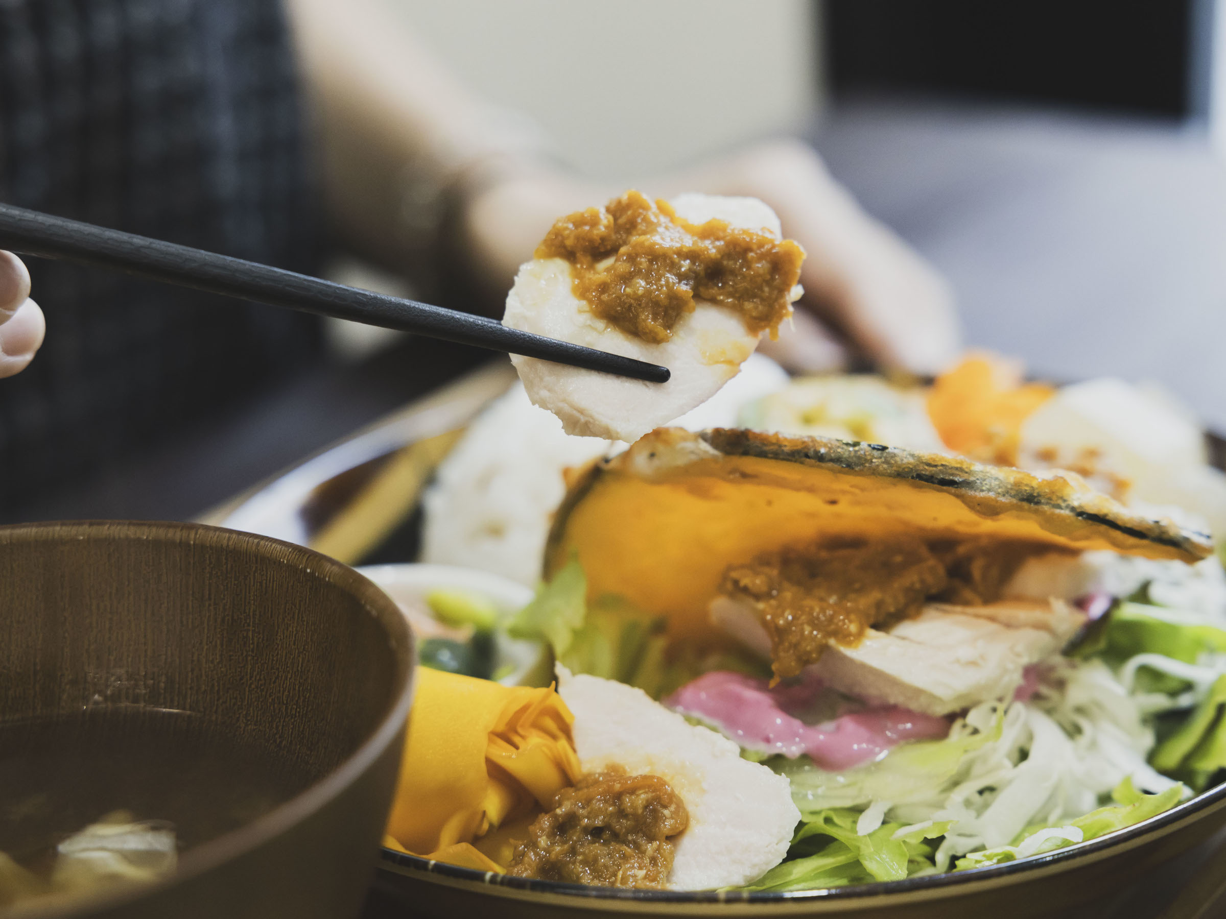走れる体づくりには、ランニング後にもしっかり食事を摂ることが大事!人気の定番メニュー「しっ鶏ハムのみそソースかけ(Aセット)」(1,300円・税込)は、しっとりとした鶏むね肉を使用しており、たんぱく質がたっぷり。疲れたランナーたちの疲労回復を助けます。そして鶏ハムにかかった栄養満点の“食べるソース”にも注目です。