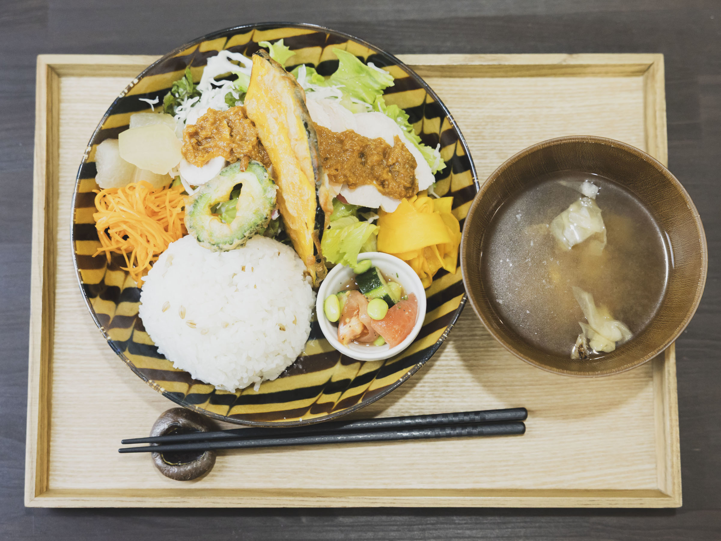 メインの横には、三浦野菜を主役にした色とりどりの副菜がラインナップ。米粉の衣をつけたカボチャとゴーヤのフリッター、ビーツ入りマヨネーズのサラダ、クミン香るにんじんのラペ、コリンキーのピクルス、カリウムたっぷりの冬瓜の煮付けなど、多彩です。スープは麹と野菜の発酵出汁に、干しシイタケの出汁を合わせた“洋風みそ汁”のようなやさしい味わい。