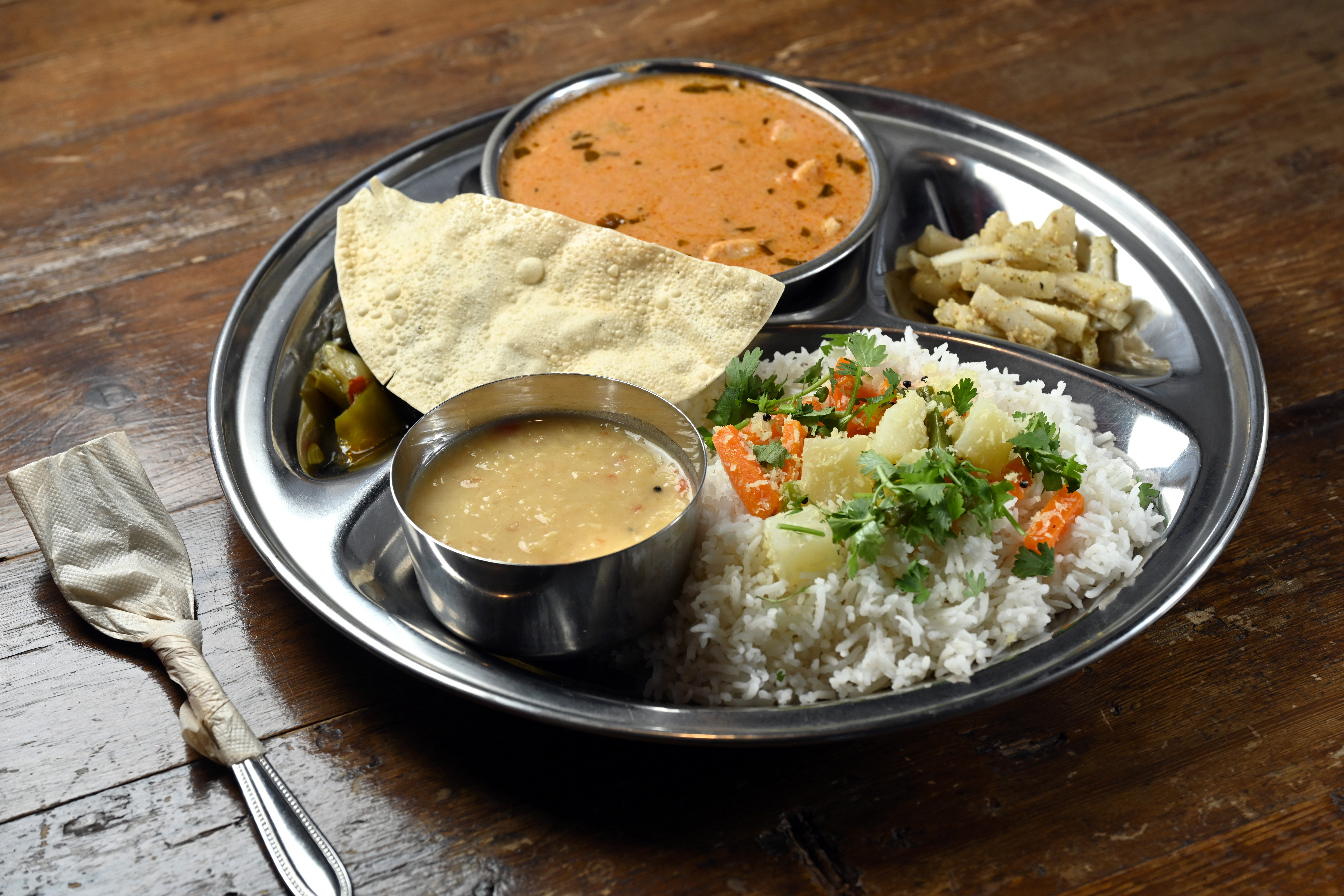 お客さんたちのお目当ては、間借り時代から提供している「バターチキンカレー」(1,530円)。シルバープレートの上に、バターチキンカレー、豆のカレー、副菜、パパドが盛り付けられ、芳しいスパイスの香りとカラフルな彩りに食欲がかきたてられます。