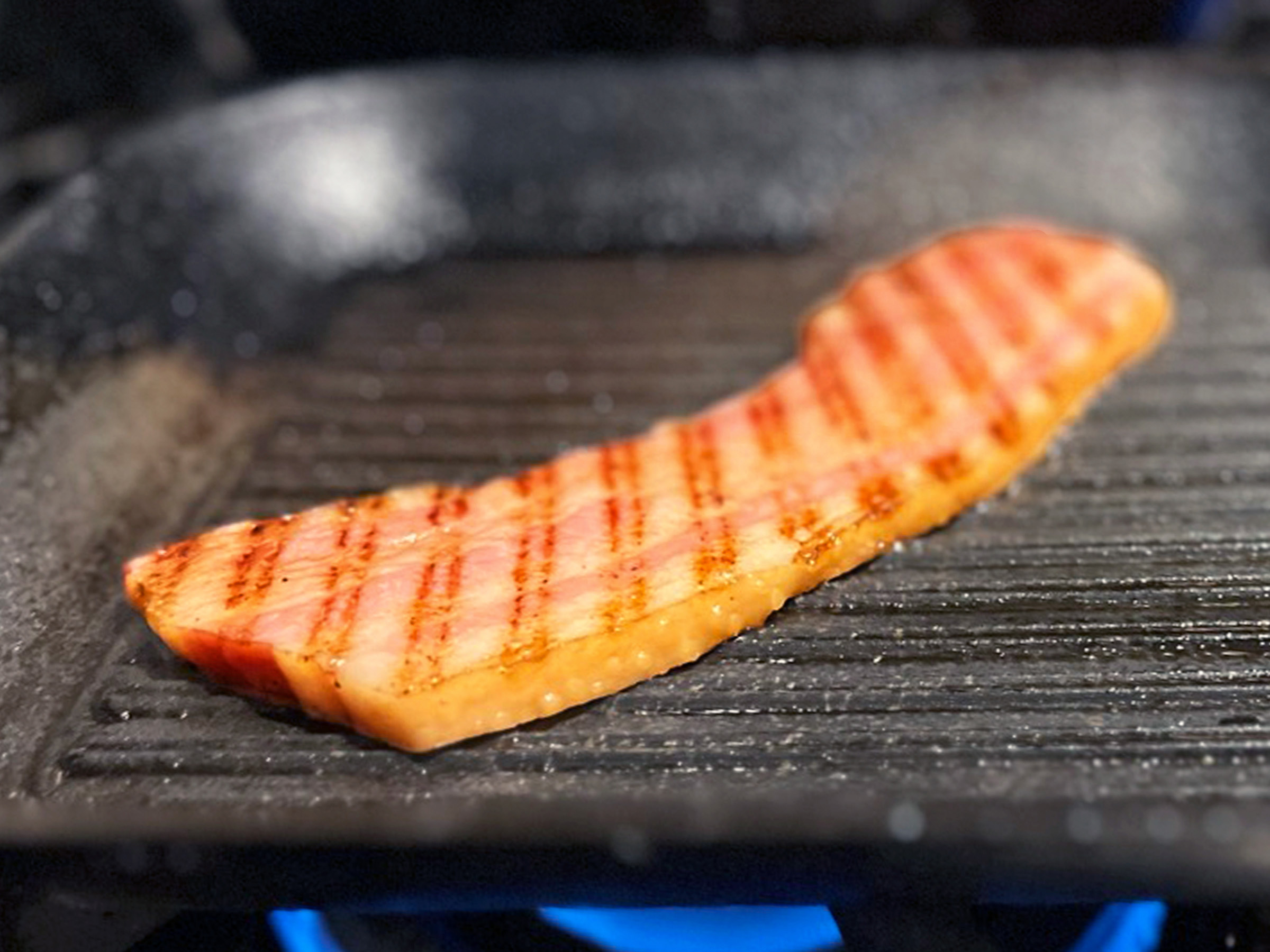 名物の「グリルドベーコンエッグカレー(1500円税込)」は、サラダ・ポテト・ドリンク付きのランチセットで提供。主役は、鉄器で焼き上げた厚切りのベーコンです。
