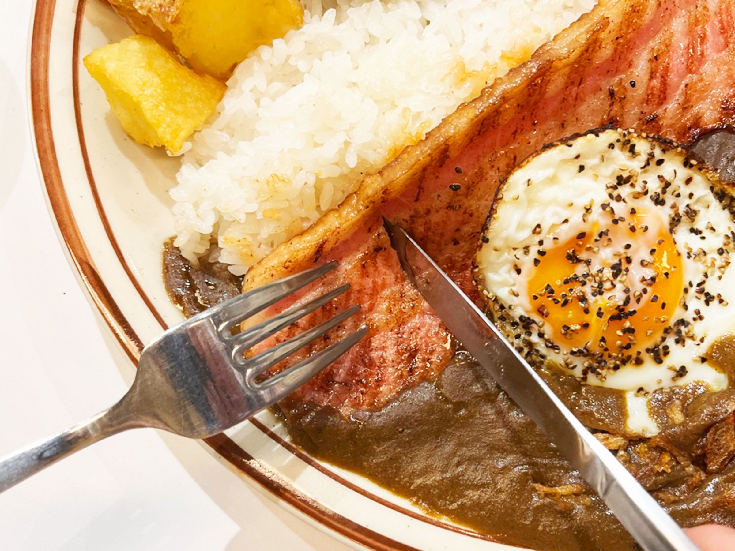 ジュワッと焼かれた肉厚ベーコンが、パリッと香ばしい音とともに香り立ち、ワンプレートの中央で存在感を放つ。添えられた目玉焼きが、スパイス香る牛すじブイヨンのカレーに加わり、さらに食欲をそそります。