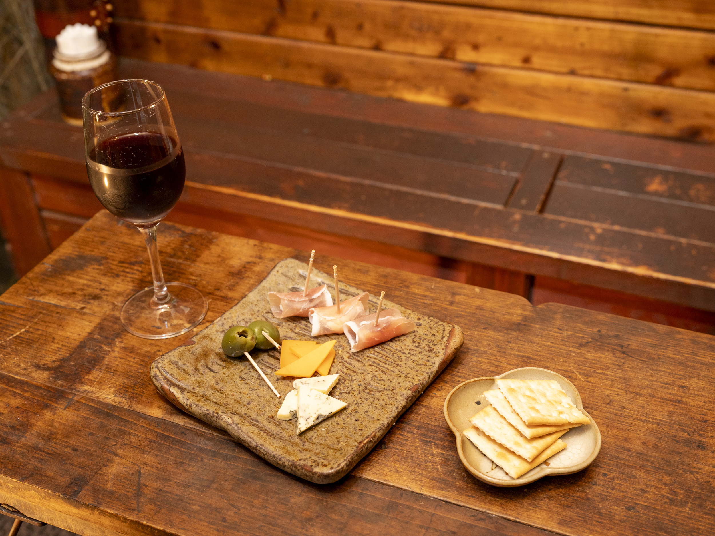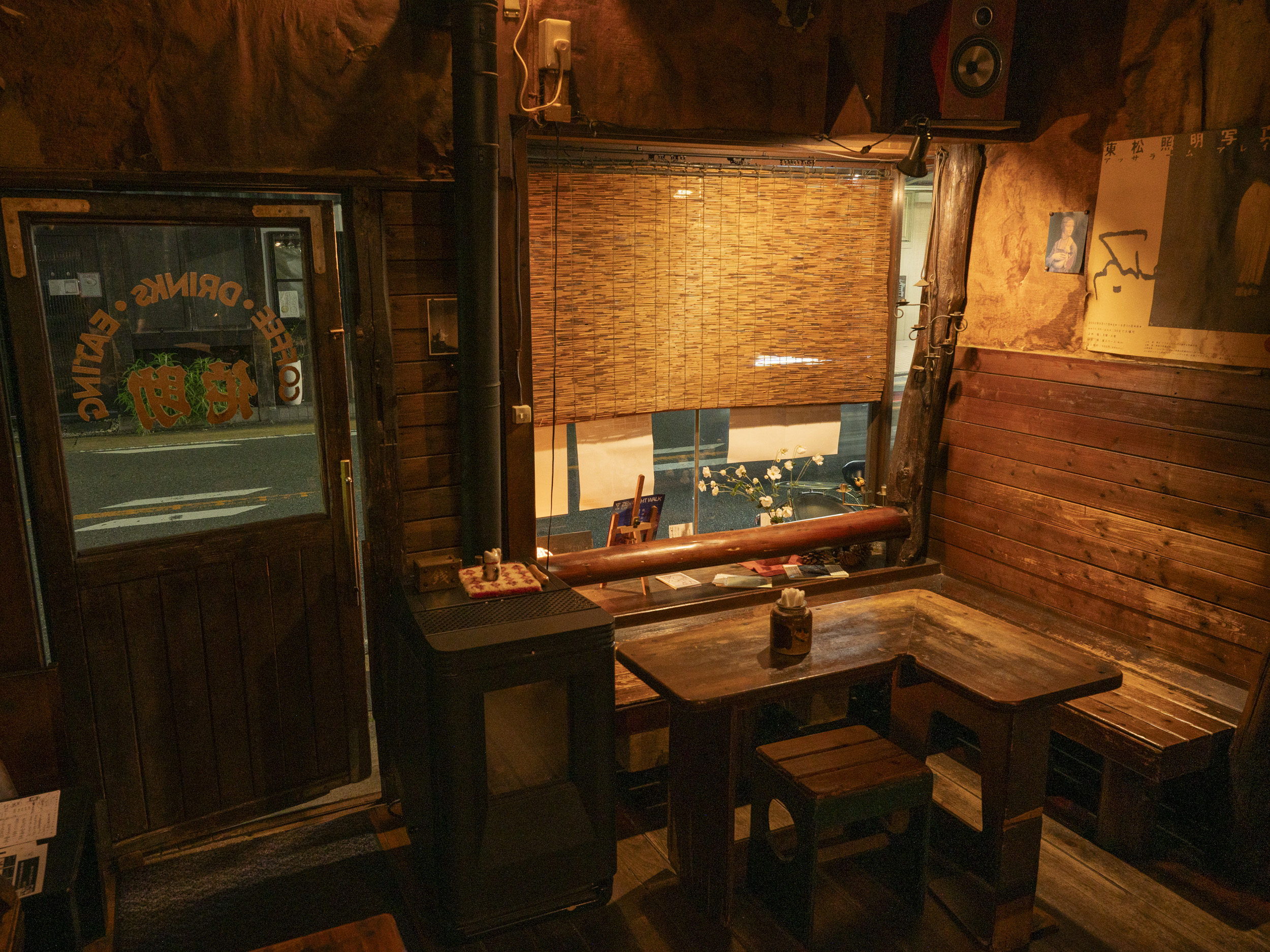 冬には入り口近くの薪ストーブに火が入ります。テーブルと椅子は木製で統一され、席数はおよそ30席。イベント開催時には入り口付近の出窓付近が舞台となります。