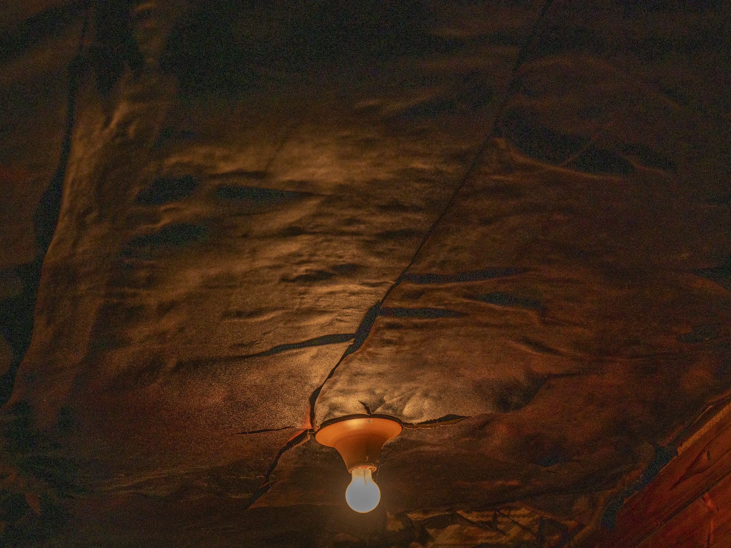 天井には、黒い皮のようなものが貼ってあります。「最初からあったね。牛の皮らしいよ。もう50年になるのかな」