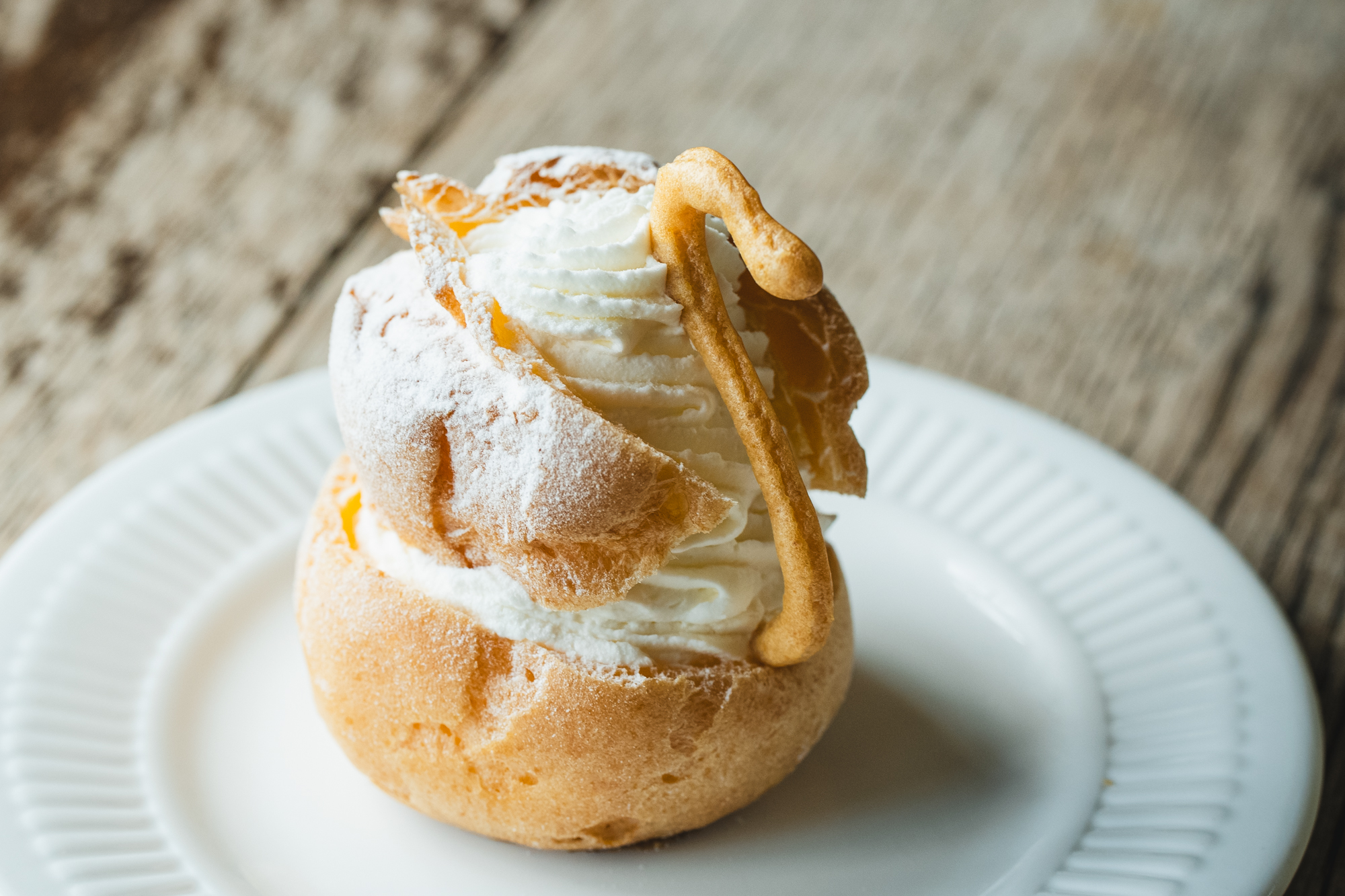 形を崩すのがもったいない気持ちに駆られますが、羽で生クリームを掬って生地と一緒に味わうのがおすすめの食べ方だそうです。