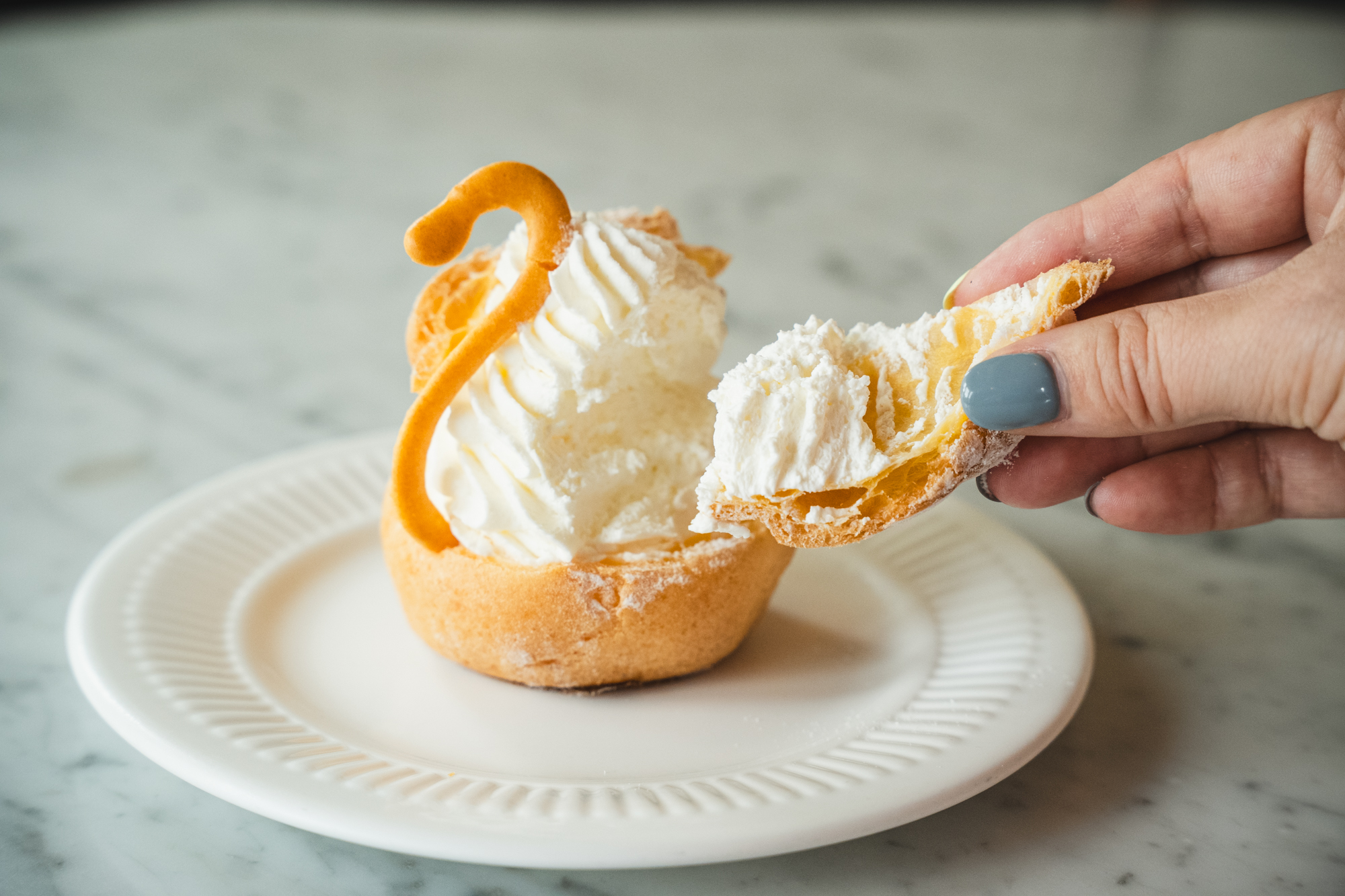 一般的なシュークリームはカスタードクリームを使うことが多いですが、スワンシューはホイップのみ。乳脂肪分のパーセンテージが違う生クリームを4種類ブレンドし、軽い口当たりでミルク感がしっかりとした味わいに仕上げています。そのため、見た目よりもすっきりとした甘さに。