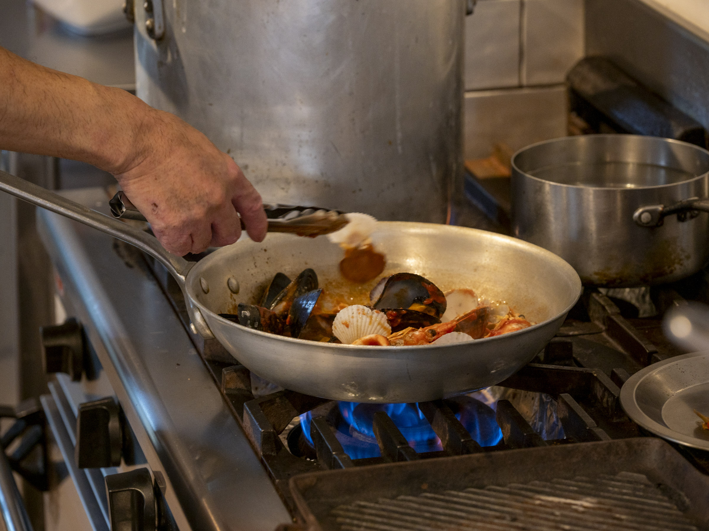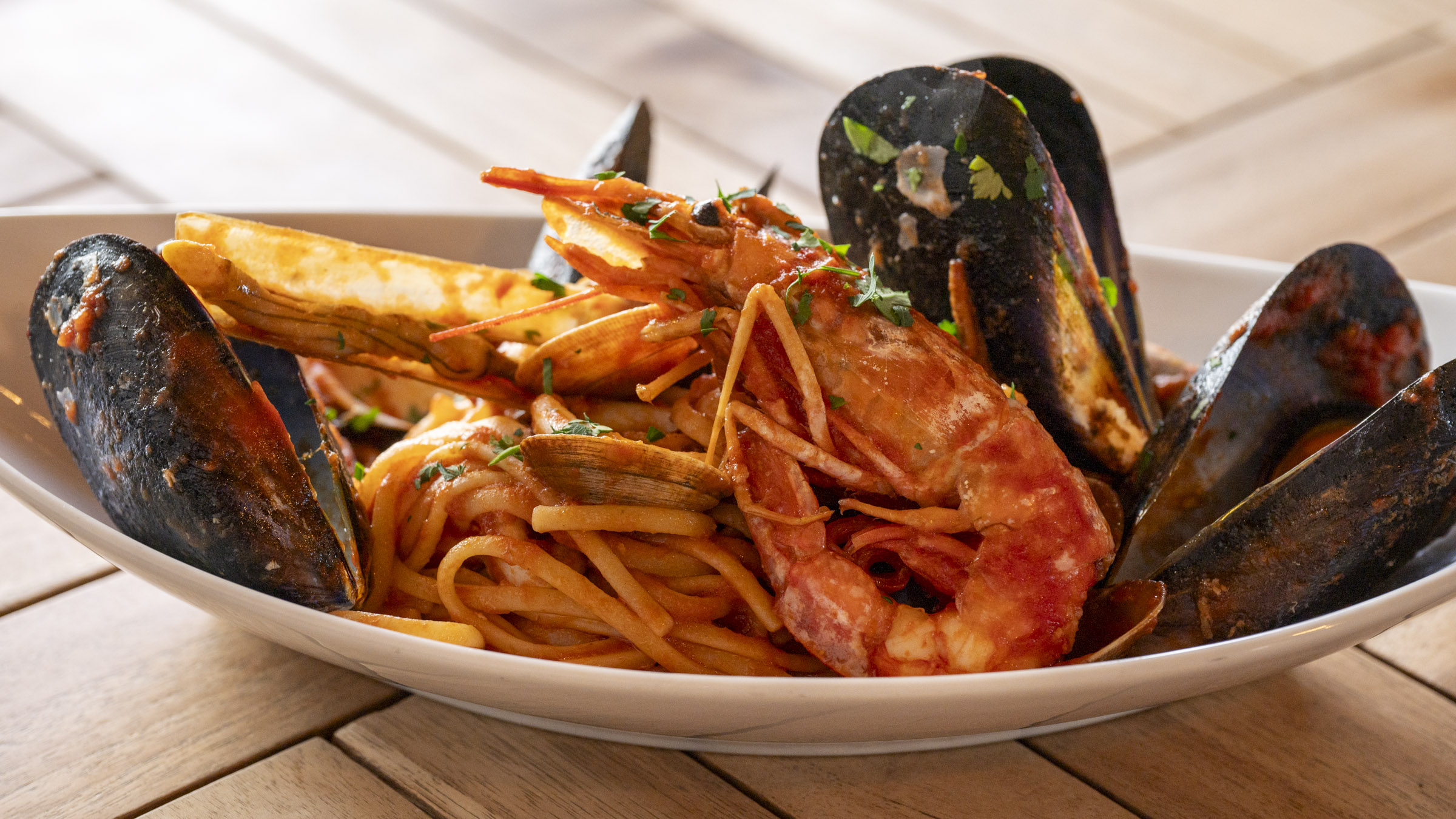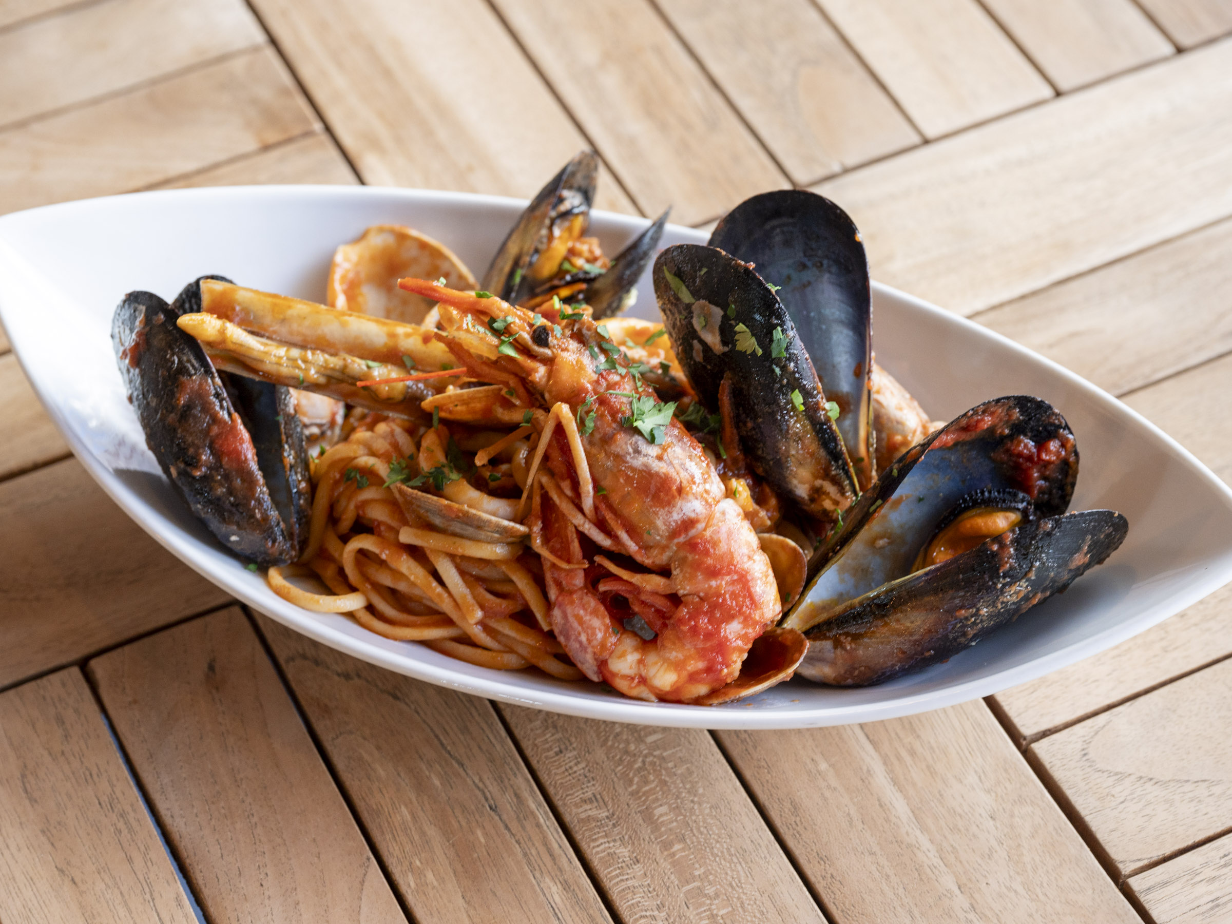 出来上がったペスカトーレには、エビやムール貝、イカなどがゴロゴロと。この日手に入ったマテ貝も。使用しているパスタはリングイネというイタリアの伝統的なロングパスタです。