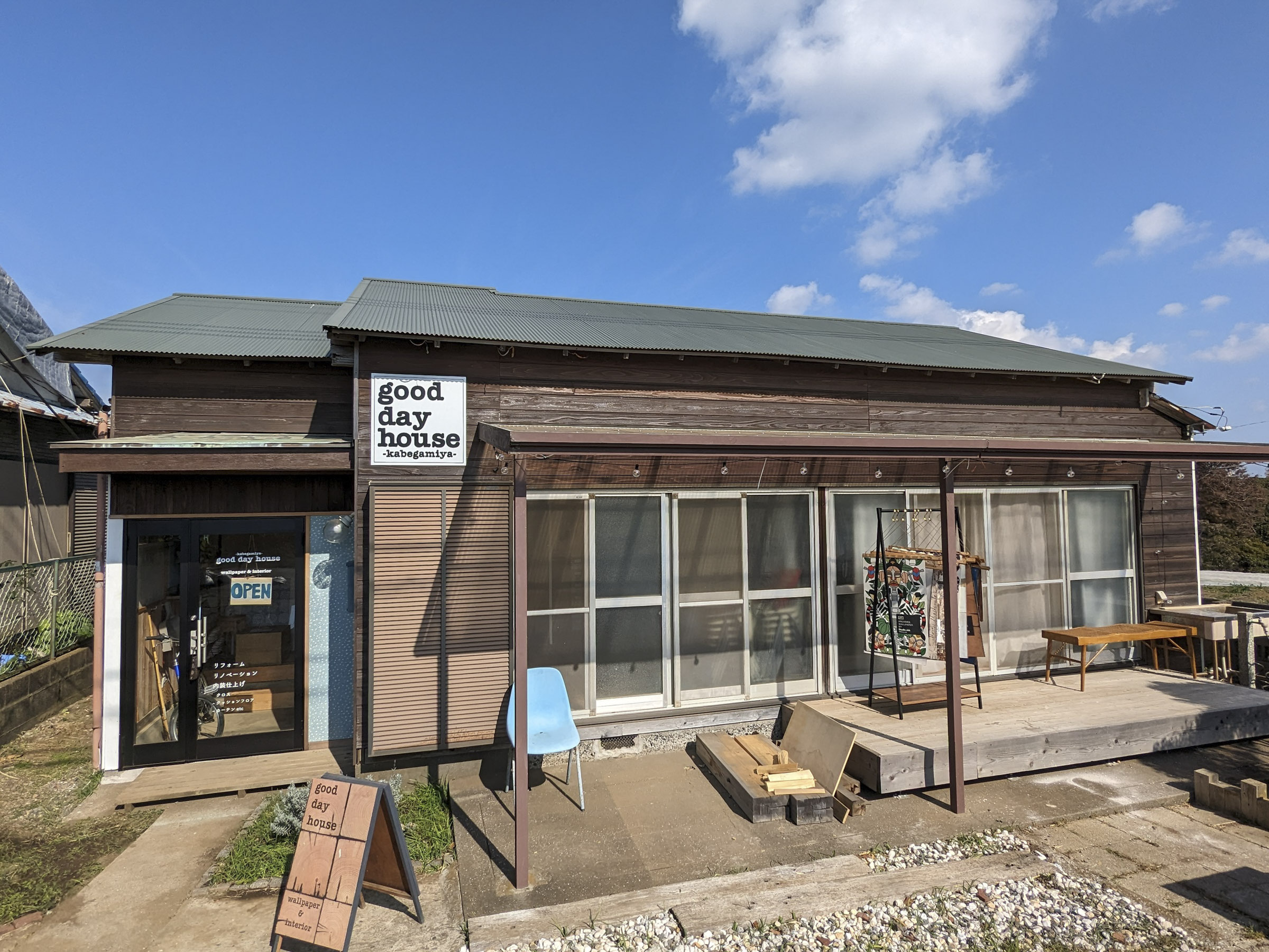 国道134号線、下宮田交差点近くの農道脇に、輸入壁紙&インテリアの施工と販売・リノベーションを手がける「壁紙屋good day house」のスタジオショールームがあります。
