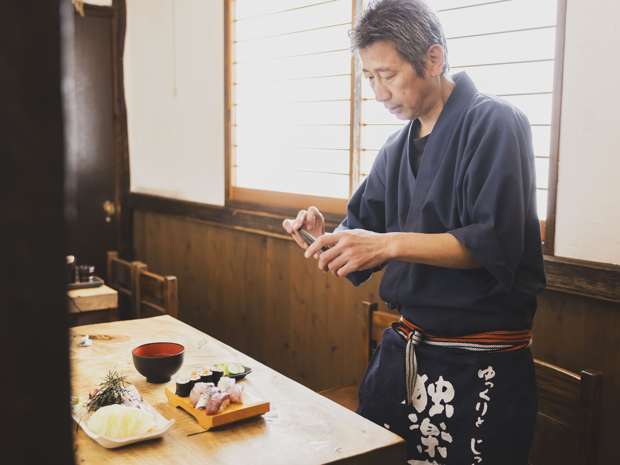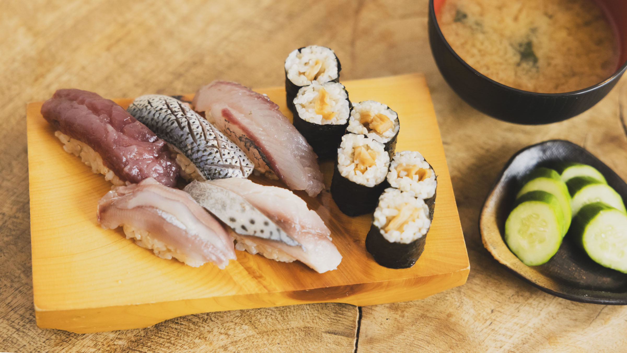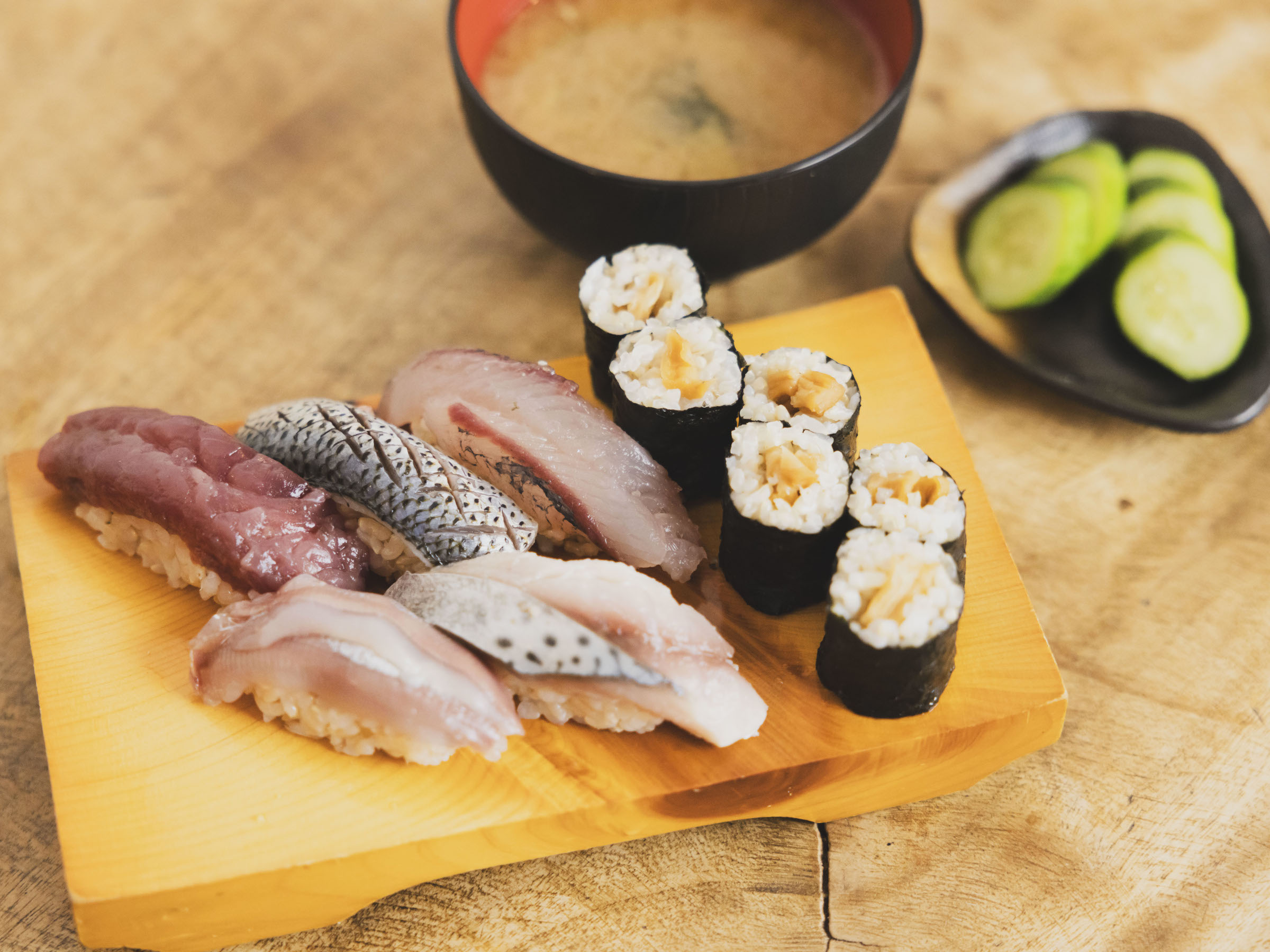取材した日のネタは、(写真左上からZ字順に)ソウダガツオ、コノシロ、トビウオ、ウルメイワシ、しめ鯖に、三浦産の割り干し大根を使ったはりはり漬けの巻物。ソウダガツオもトビウオも脂がのっているためか、トロのようなねっとりとした食感に思わず唸ってしまいました。