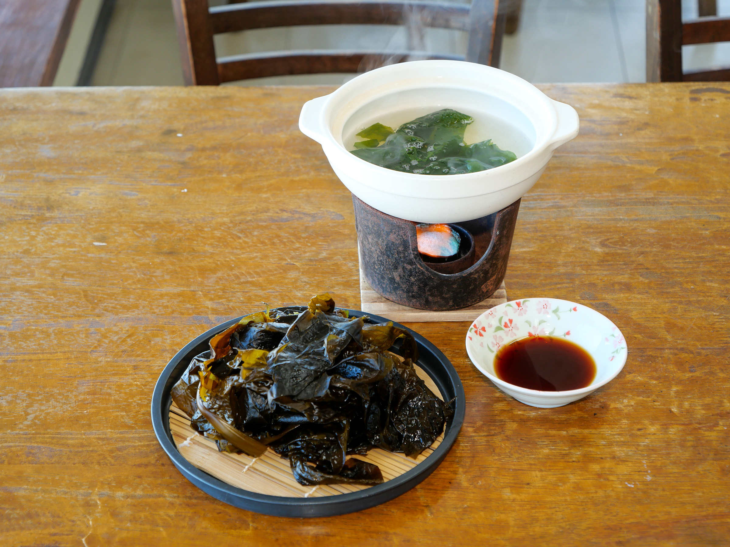 この日は、お刺身がアジ、イナダ、マグロ。タチウオの焼き魚、野菜のかき揚げ、そして同店の名物である生ワカメのしゃぶしゃぶでした。生ワカメのしゃぶしゃぶは冬季限定メニューです。