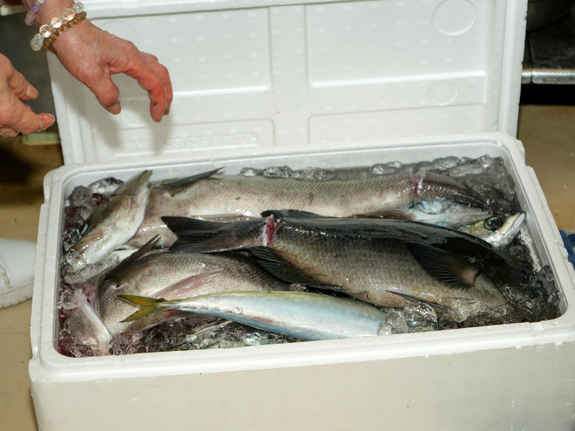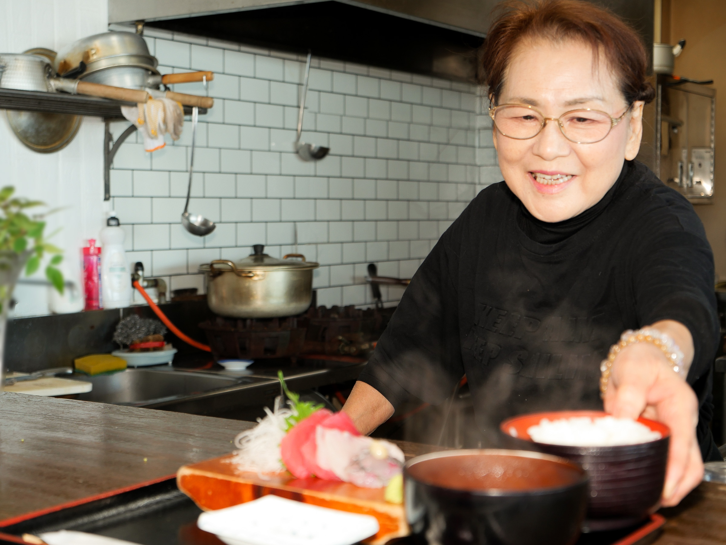 「タチウオは1本釣りなので傷が入ってないの。キラキラしてるでしょ? 上のほうを焼き魚、下はお刺身にして。魚が嫌いなひ孫も『ばぁばのタチウオはおいしいね』ってよく食べるのよ」と、店主の岩野光子さんは目を細めます。