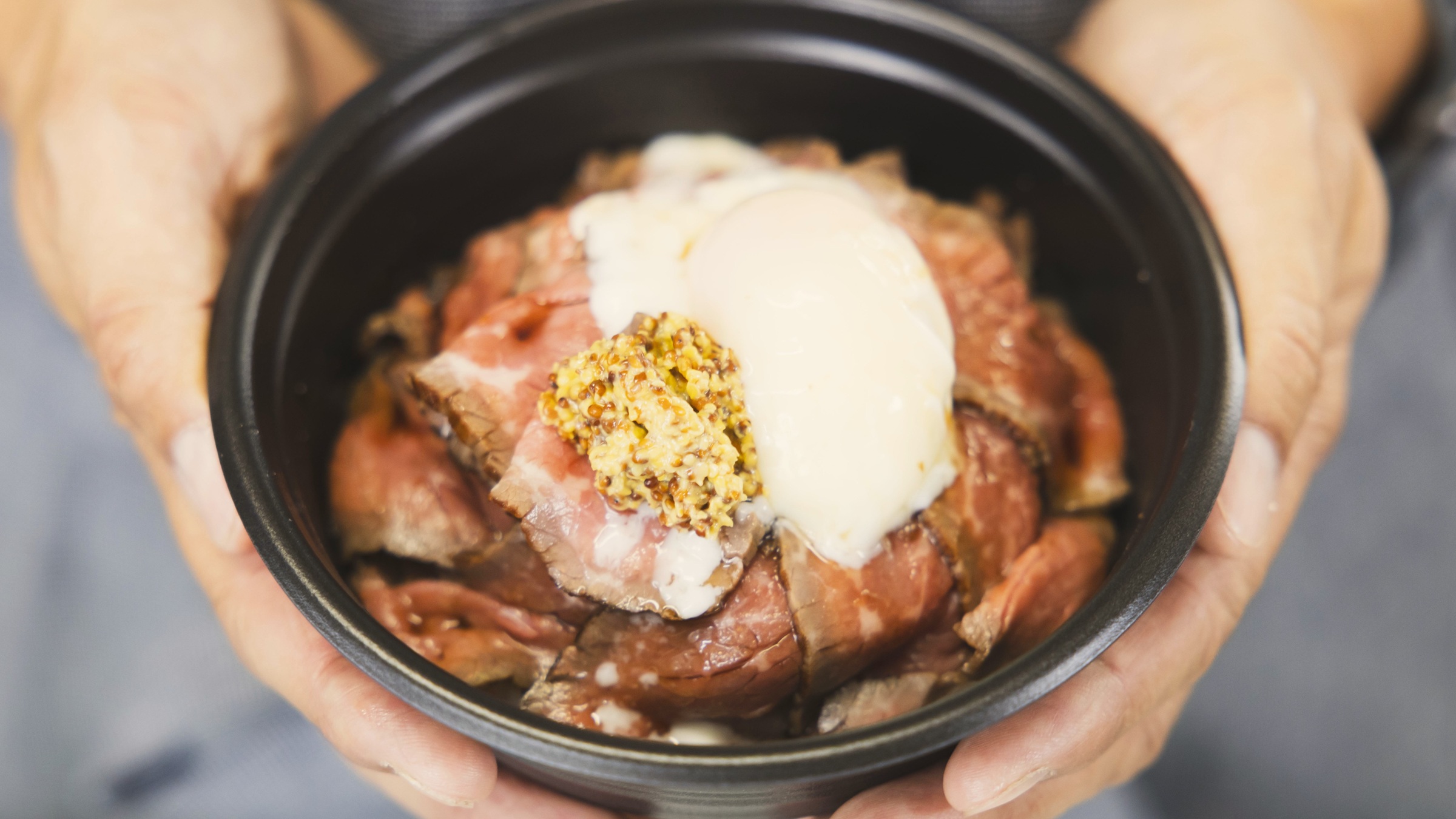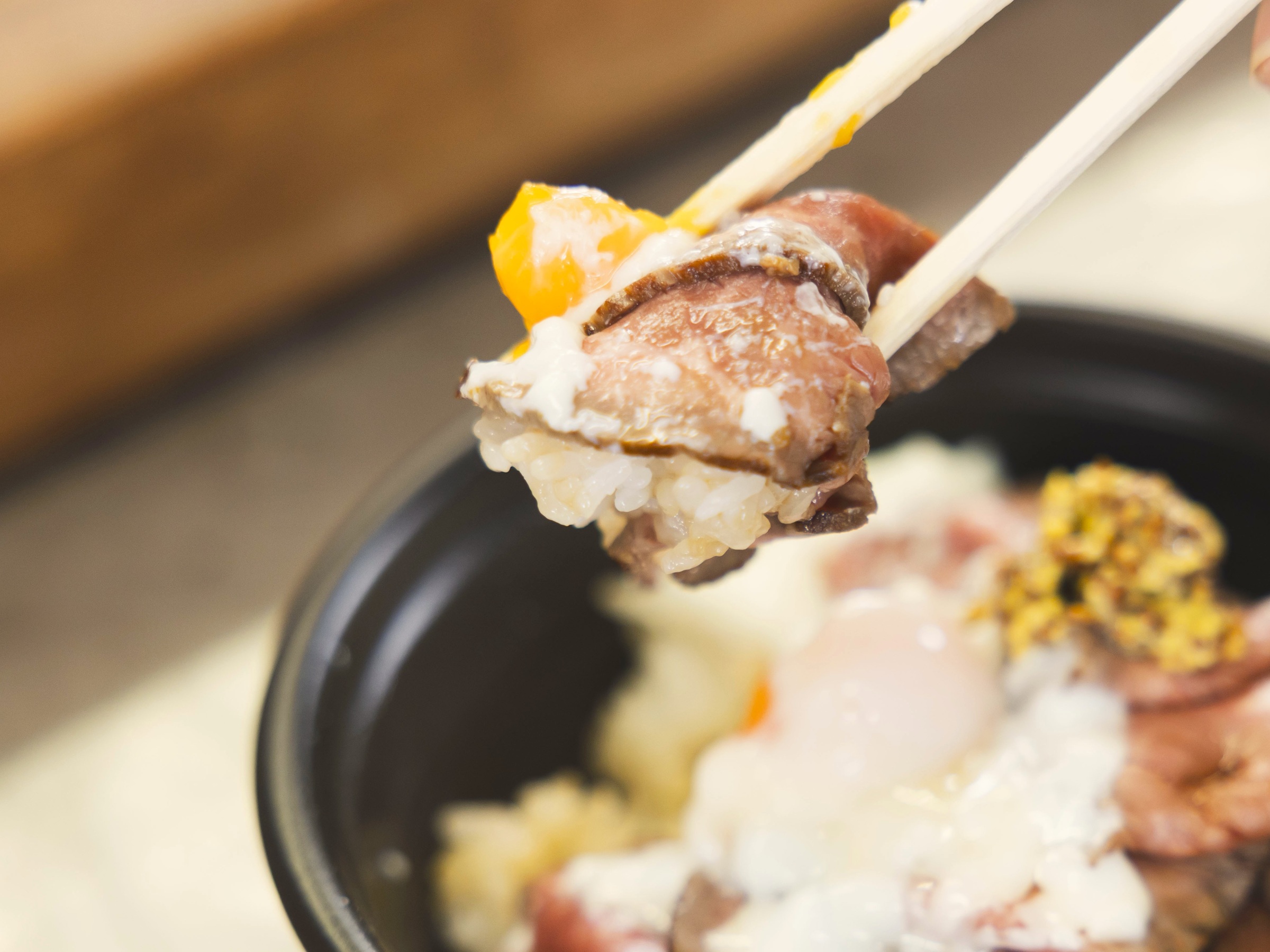 丁寧にスライスされた牛肉は、照りのあるしょうゆベースの甘いタレと粒マスタードに絡めると絶品! 柔らかな肉は口の中でほどけるように、米と混ざり合います。さらに温玉を崩せば、ねっとりとした黄身が牛肉に絡んで箸が止まらなくなります。