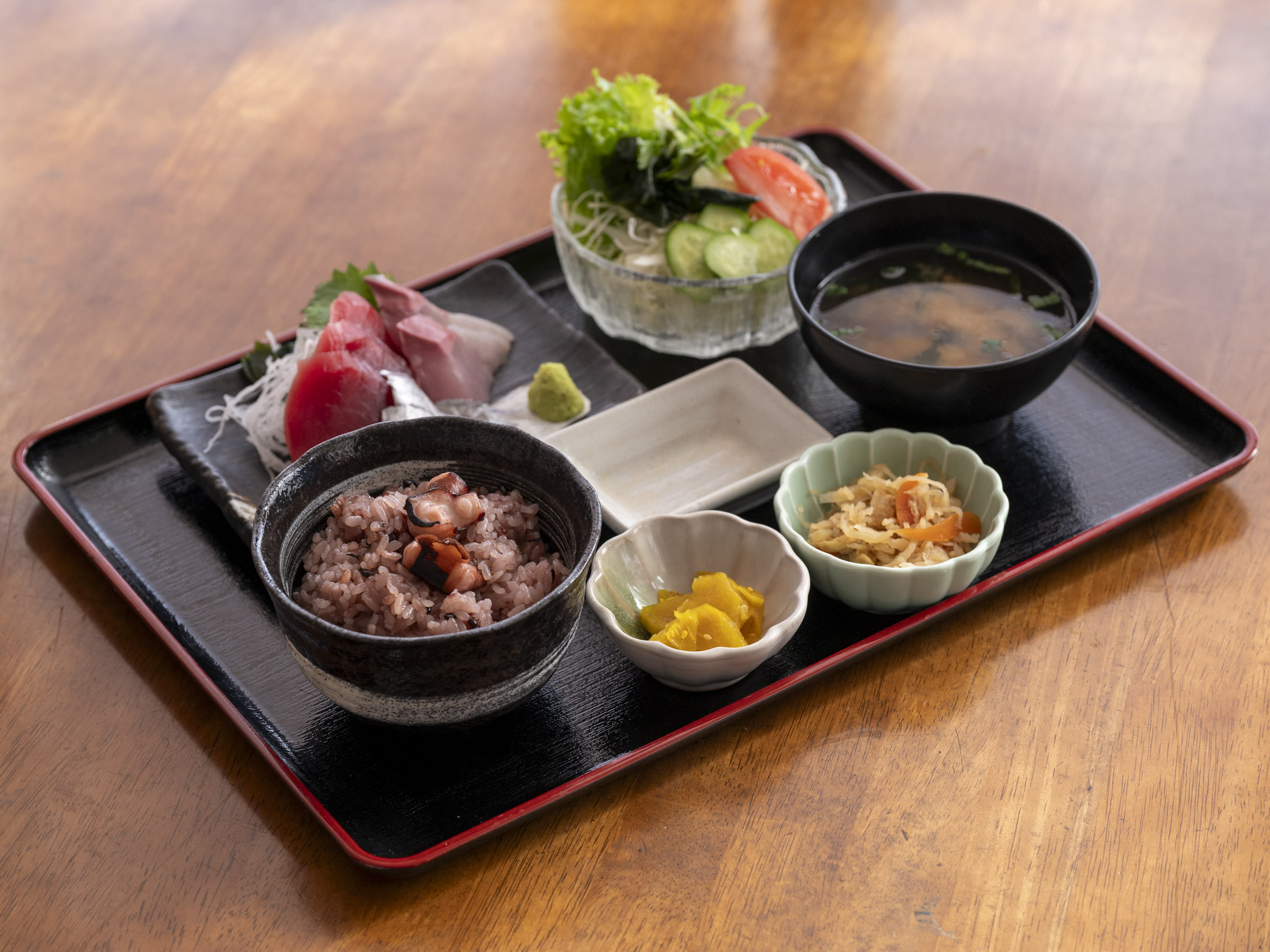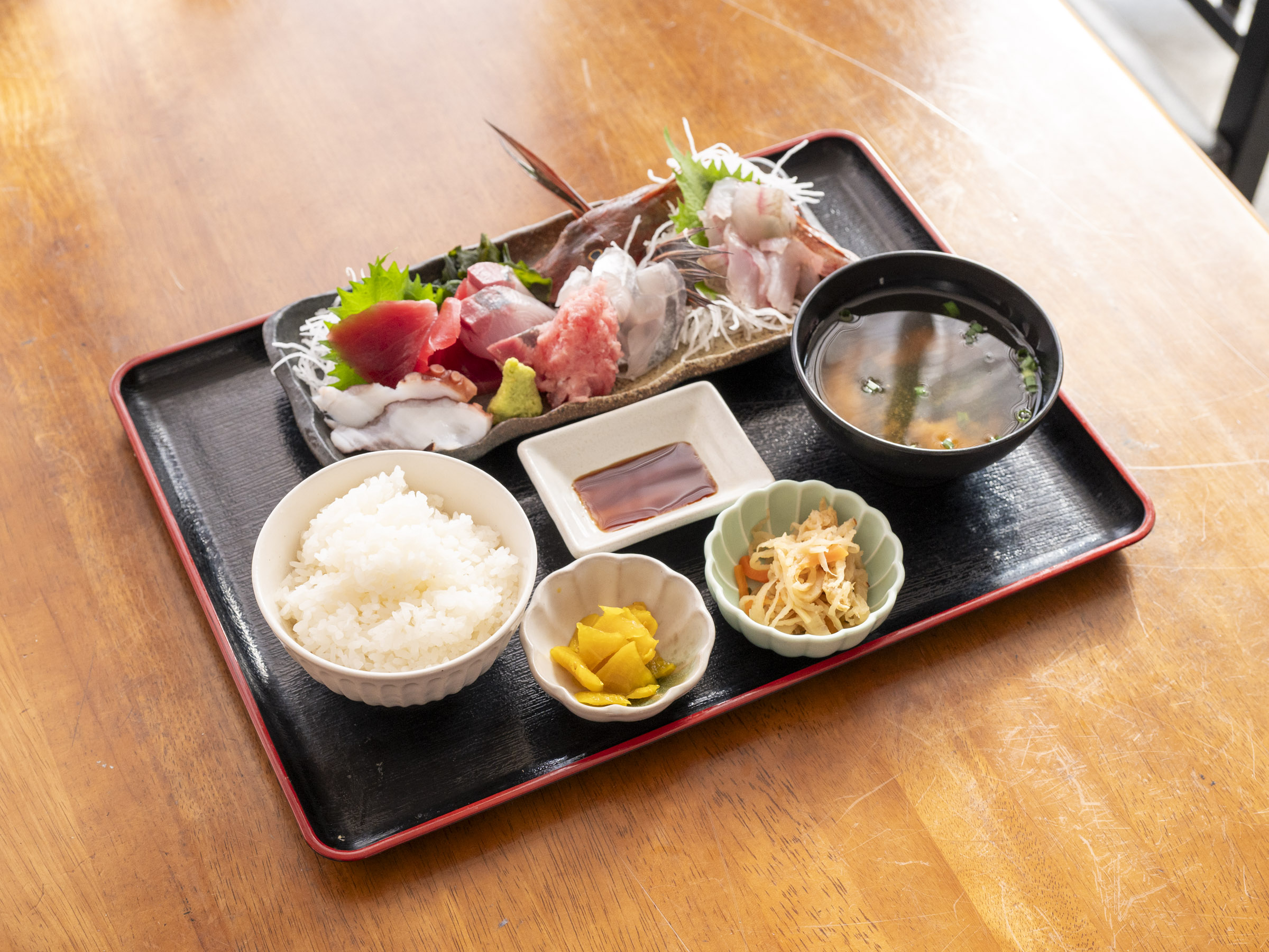 看板メニューは、採れたての地魚5種を盛り込んだ「刺身定食」(1,480円)。鮮度・ボリュームともに大満足のランチに、地元ファンが増え続けています。