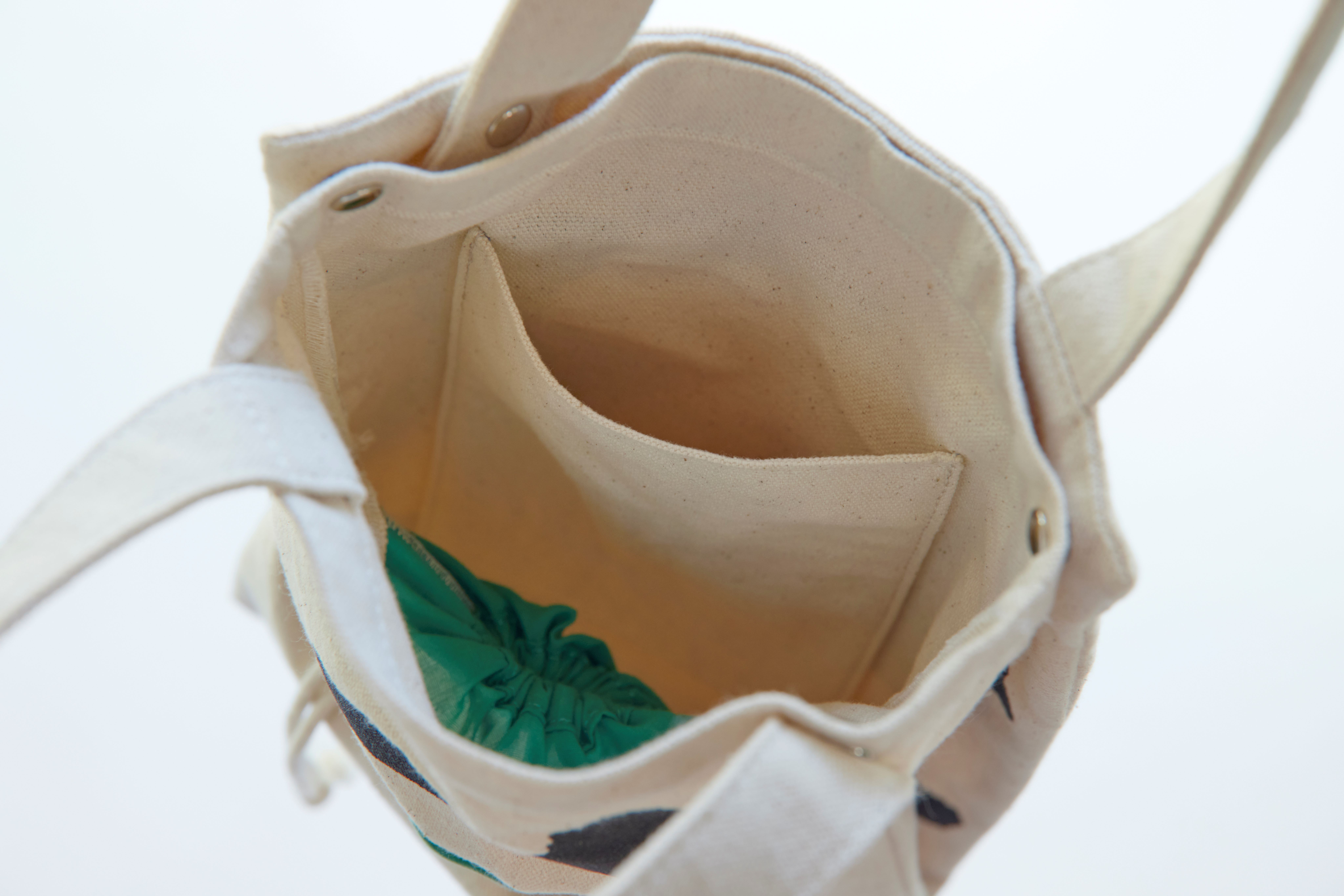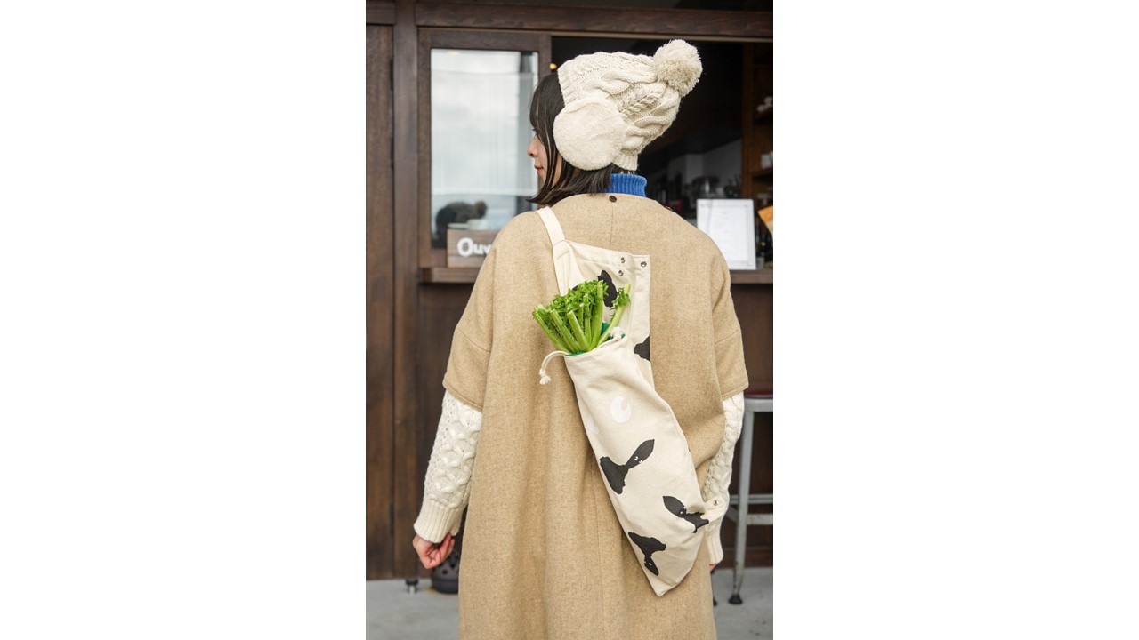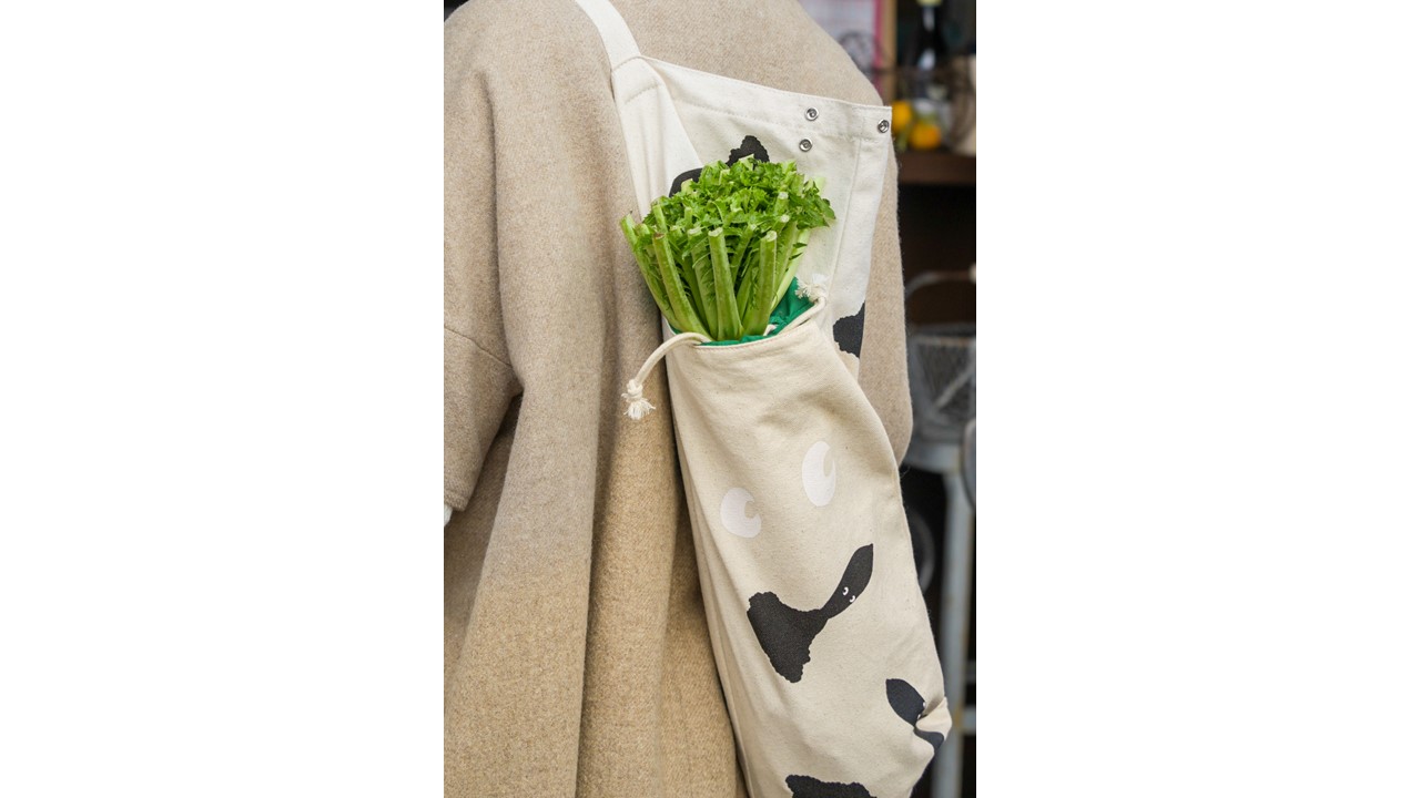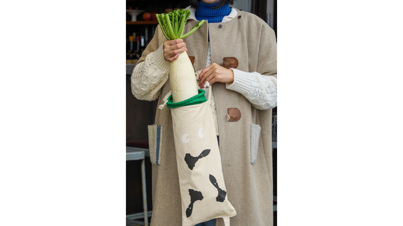 毎日の暮らしの中で楽しめるように、折りたたんでスナップボタンを留めると、可愛い大根モチーフのミニトートに変身します