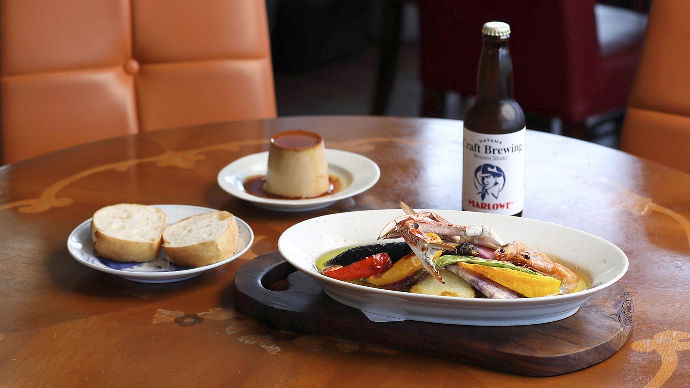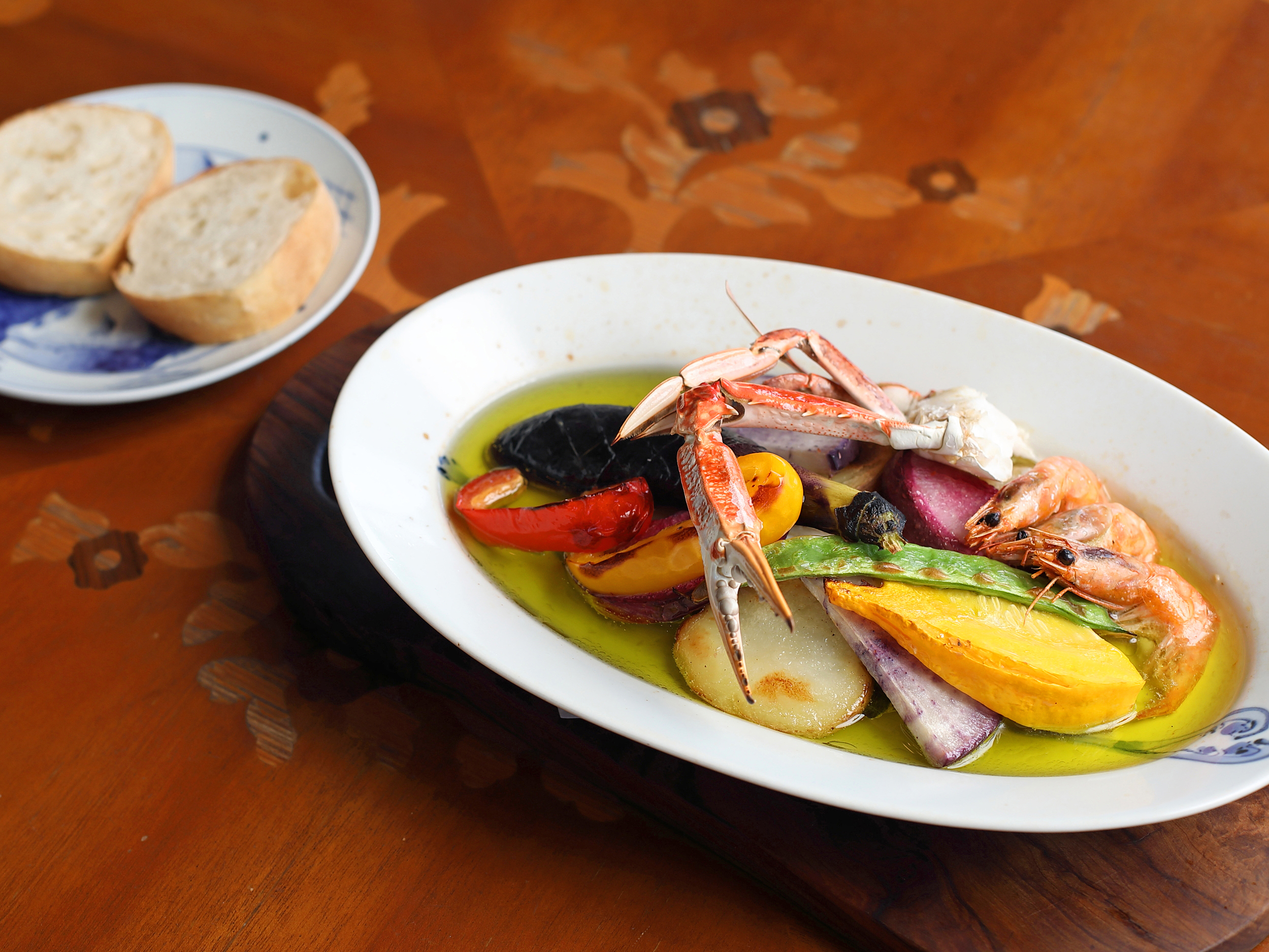 名物メニューは「贅沢・大皿・前の海の地魚アヒージョ・パン付」(3,410円・ドリンク付き)。ネーミングのとおり地元の漁師さんが獲れたての魚を届けてくれるそう。
