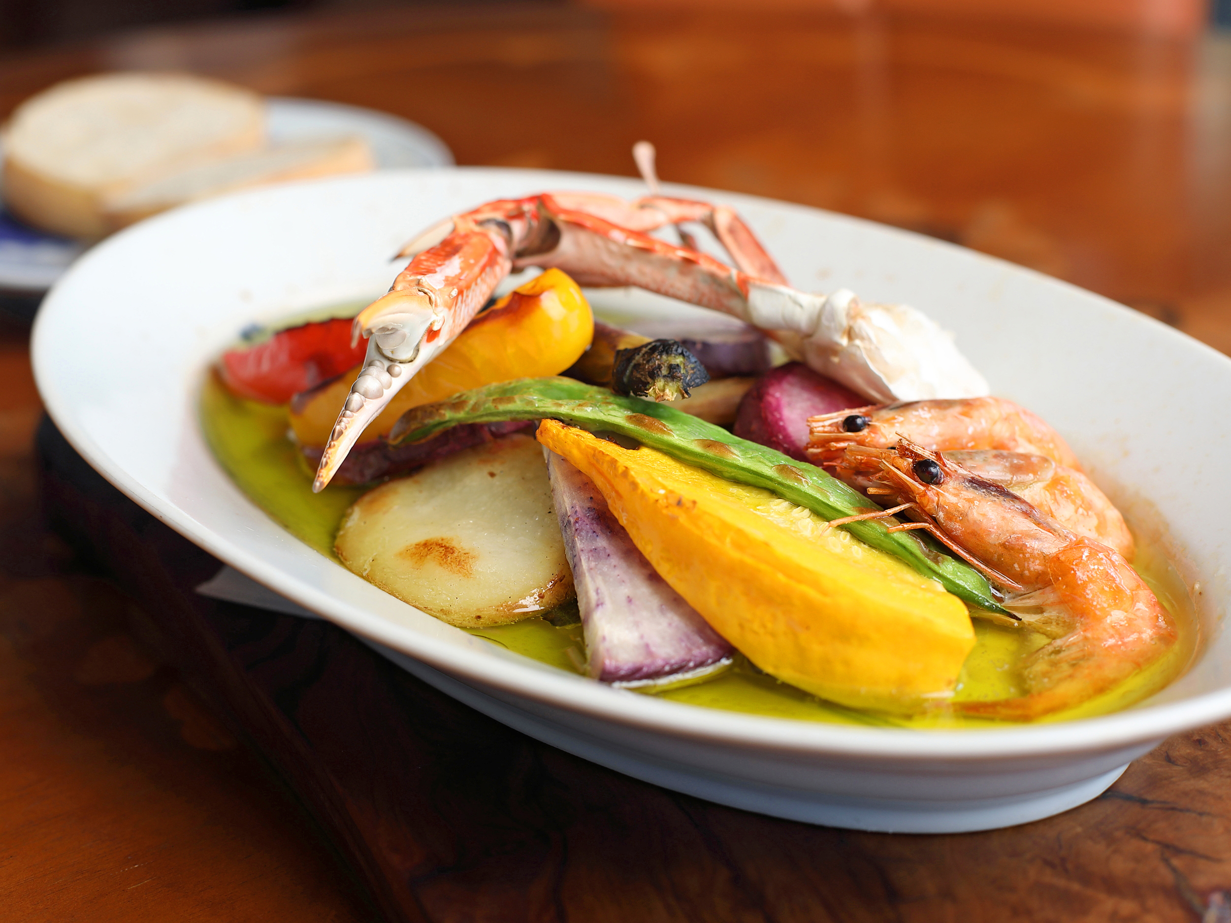 「港のマーロウ」として存在感を放つマーロウ葉山マリーナ店には、目の前の海で採れた地魚をつかった「贅沢・大皿・前の海の地魚アヒージョ」がおすすめ。鮮やかな見た目と風味豊かな味わいが特長です。