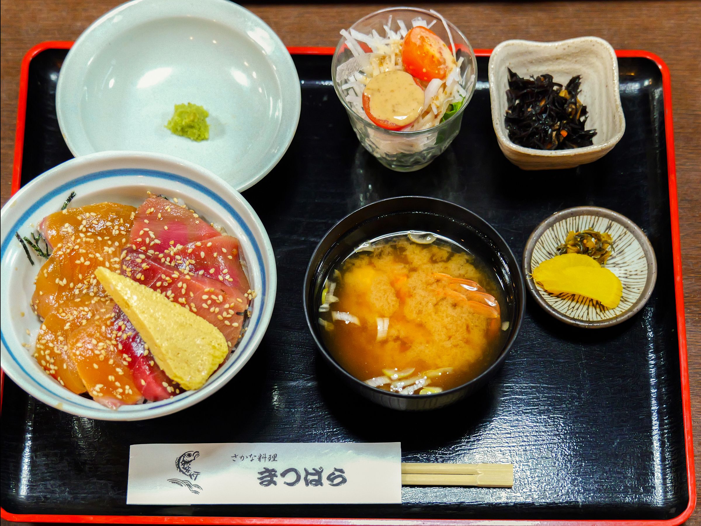付け合わせは、サラダ(この日は大根サラダ)、小鉢(ひじきの炒め煮)、カニの味噌汁、香の物。丼のフタの裏にわさびがついていてビックリ!