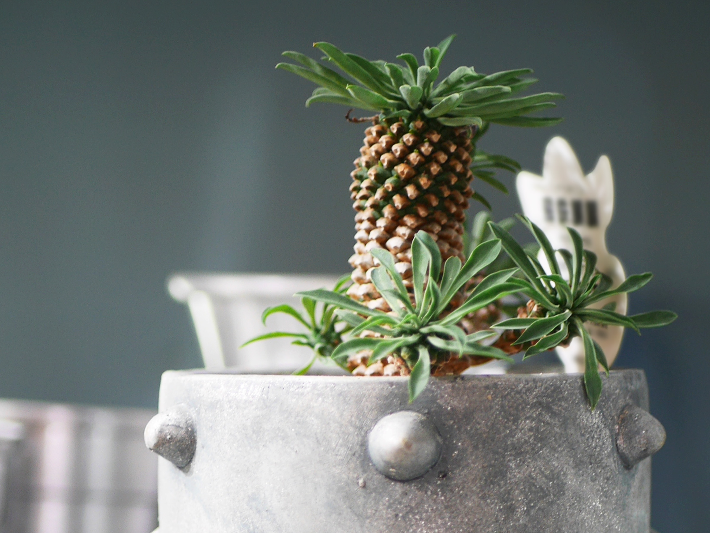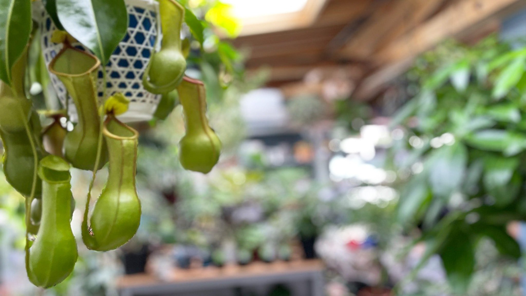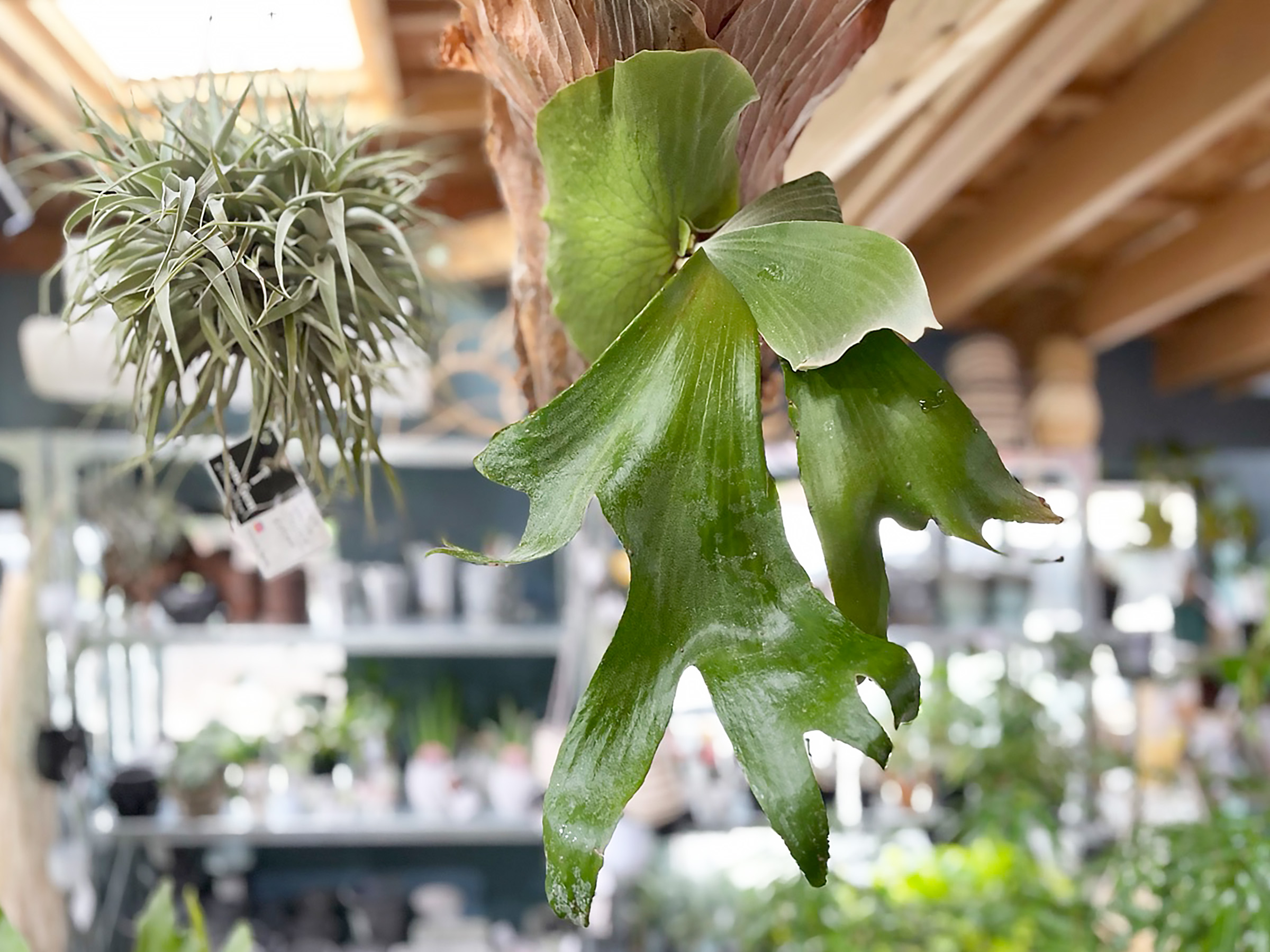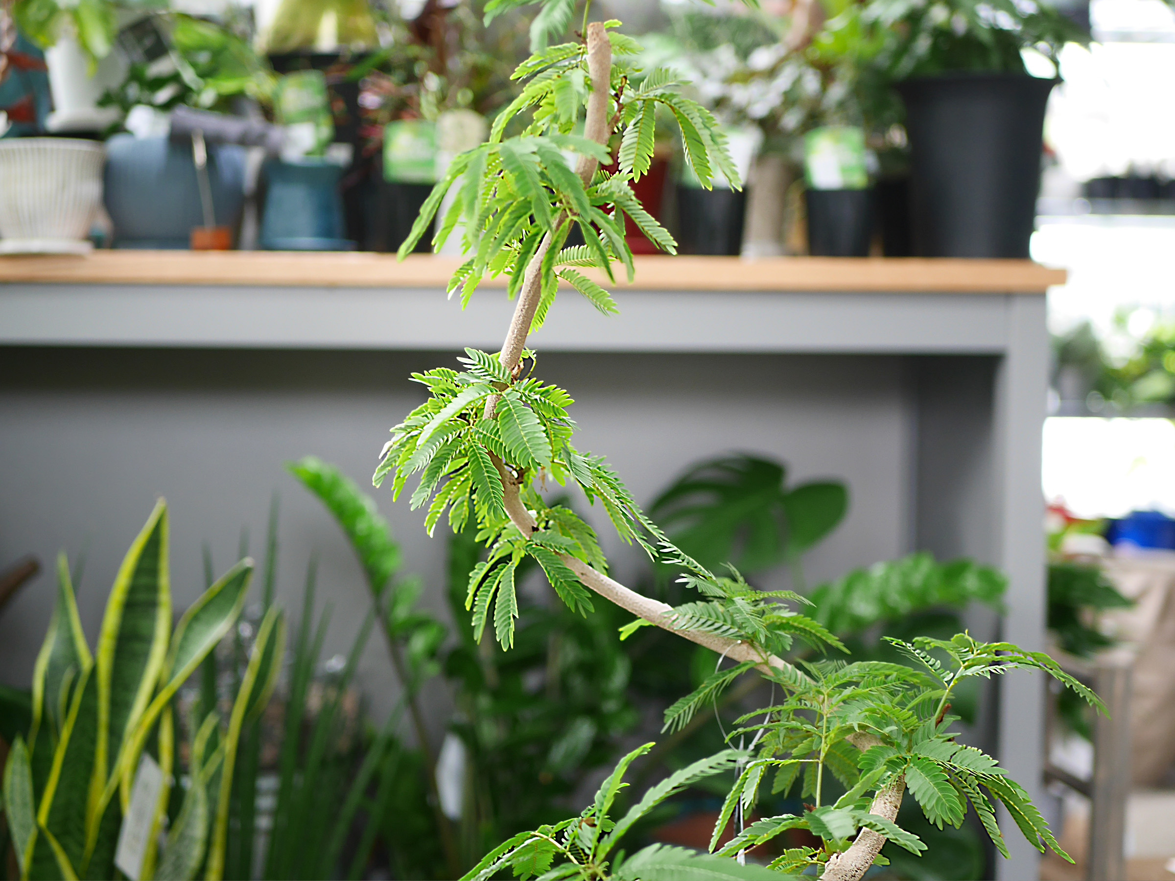 白い斑がインテリアを洗練させる「斑入りモンステラ(ホワイトモンスター)」や、すぐに完売するパイナップルのような愛らしい姿の「ソテツキリン(パイナップルコーン)」。さらに、昼に葉を広げ夜に閉じる"就眠運動”とエレガントな樹形が女性に人気の「エバーフレッシュ」、大型エアプランツや盆栽仕立てのシダなど、個性豊かな品種が揃い、見ていて飽きません。