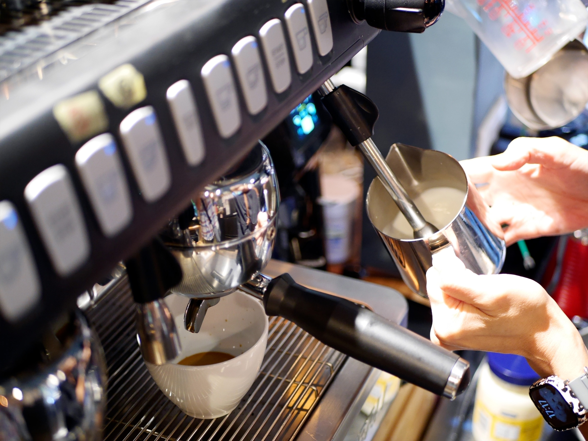 スイーツとの相性ぴったりなのが、焙煎にこだわったバリスタの亜紀さんが淹れる「カフェラテ(450円税込)」。エスプレッソの深い香りと、スチームミルクのクリーミーな味わいが人気。カフェを目当てに訪れる常連も増えています。