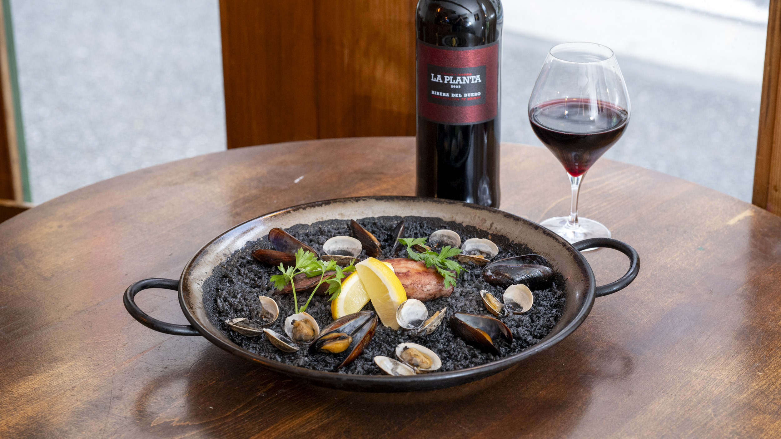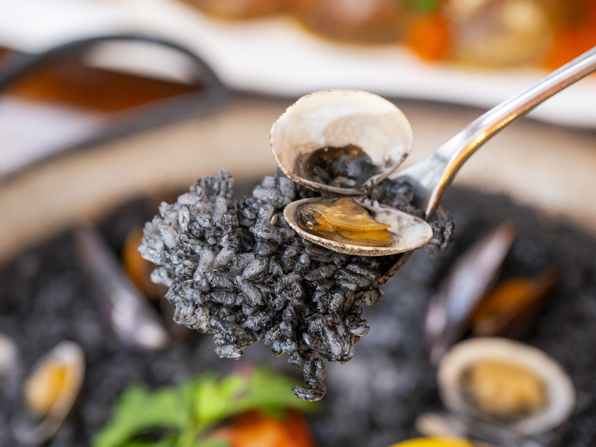 パエリア鍋に盛られたアサリ・ムール貝と、黒いご飯の中心に鎮座するオーブンでグリルされたイカ。磯の香りと塩気が交わり、そこに貝の旨味がブレンドされる美味しいパエリアです。