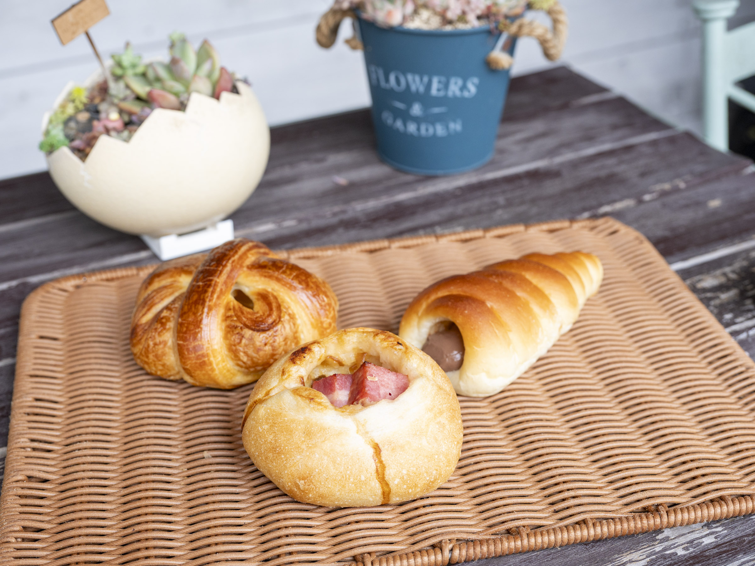 裕子さんに選んでいただいたオススメパンは「はちバターフランス」(220円・写真下)、「蜂小屋クロワッサン」(300円・写真右)、「大納言クリームチーズ」(320円・写真上)の3種。