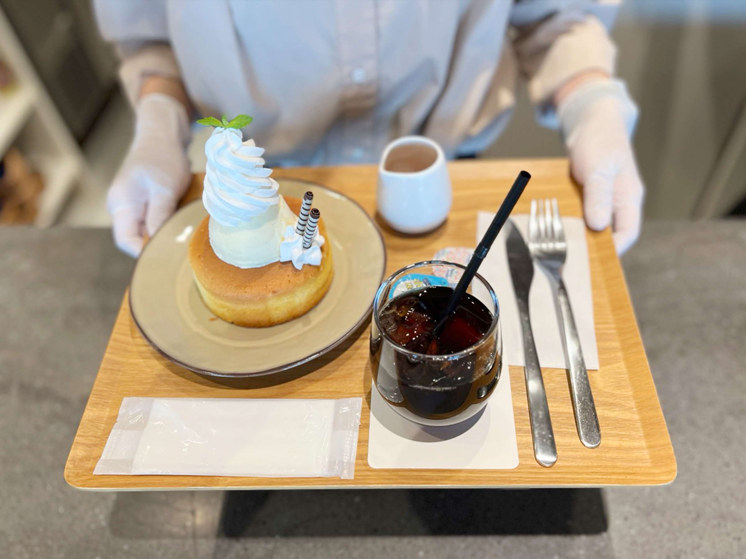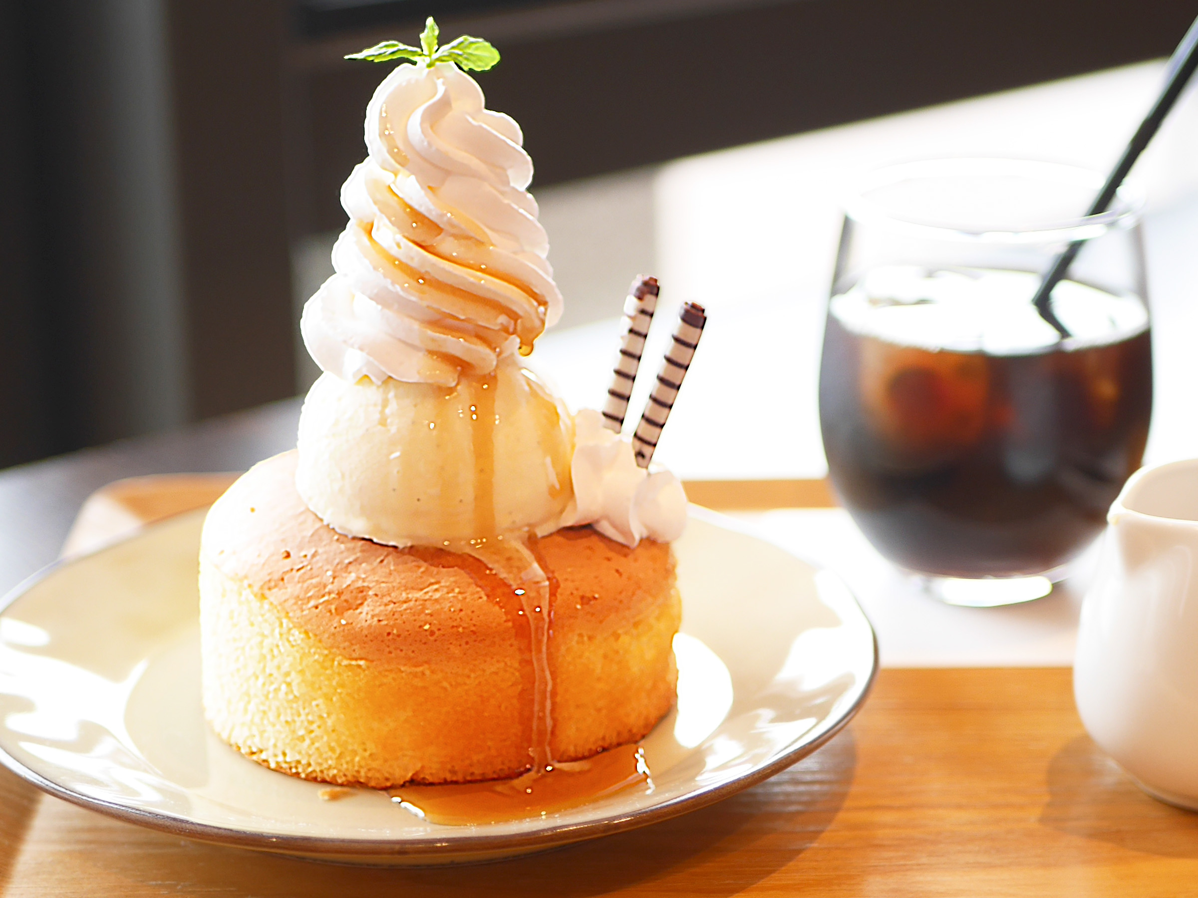 ホットケーキの素朴な温かさ、アイスのひんやりとした口溶け、ホイップのミルキーな甘さが重なり、口の中でリッチに溶け合います。深煎り「アイスコーヒー(440円税込)」との組み合わせは甘さを引き締め、大人の余韻を残すスイーツタイムに。