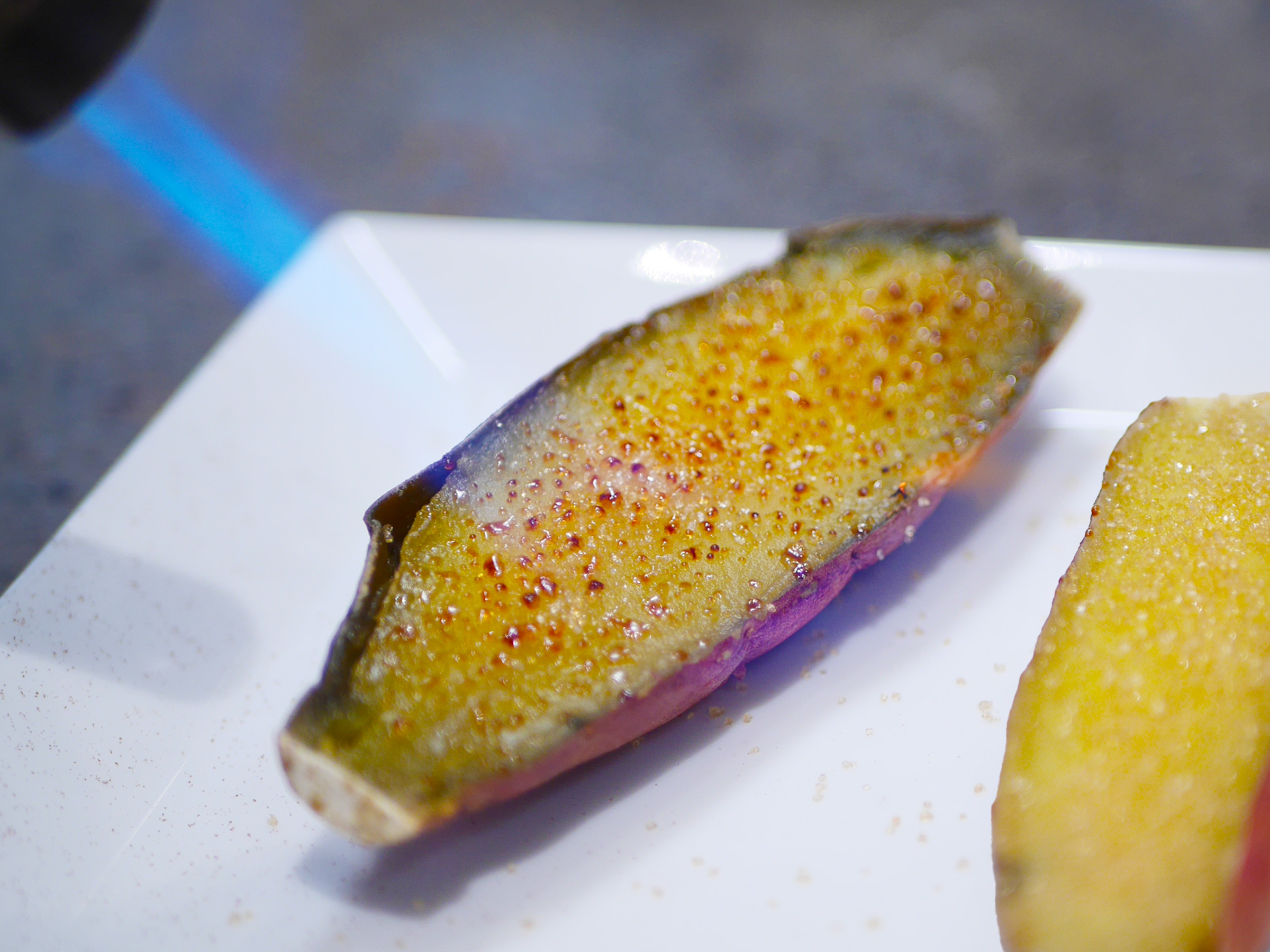 半分にカットした焼き芋の上には、フランス産ブラウンシュガー「ラ・ペルーシュ カソナード」をまぶして香ばしくブリュレ。ハチミツやキャラメルを思わせる豊かな香りが広がり、焼き芋の甘さに奥行きを生みます。