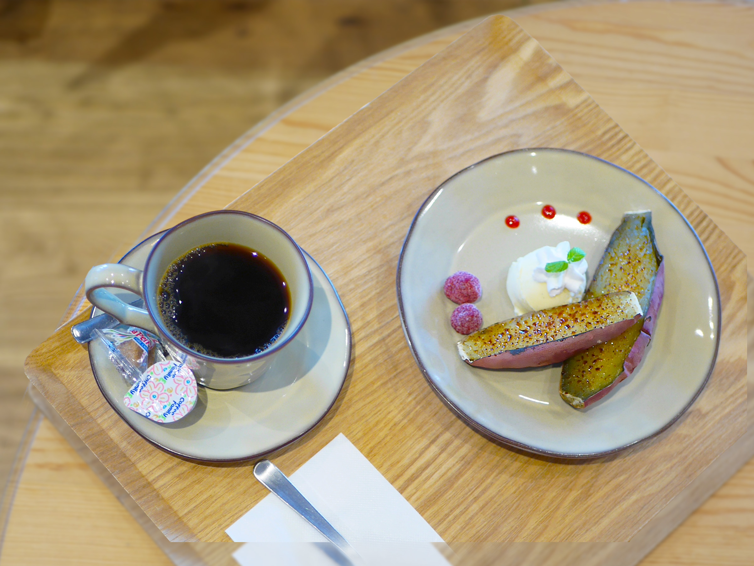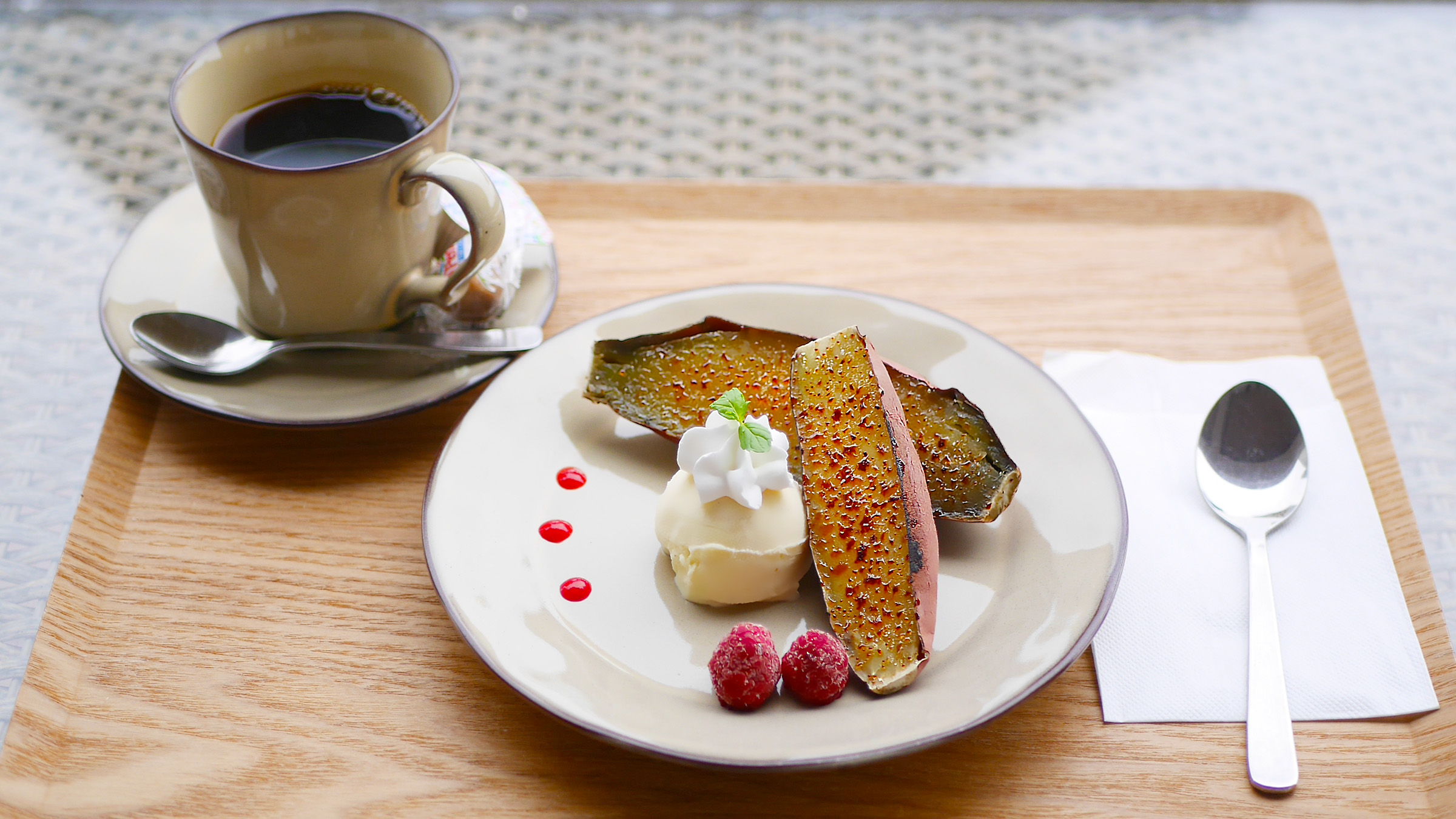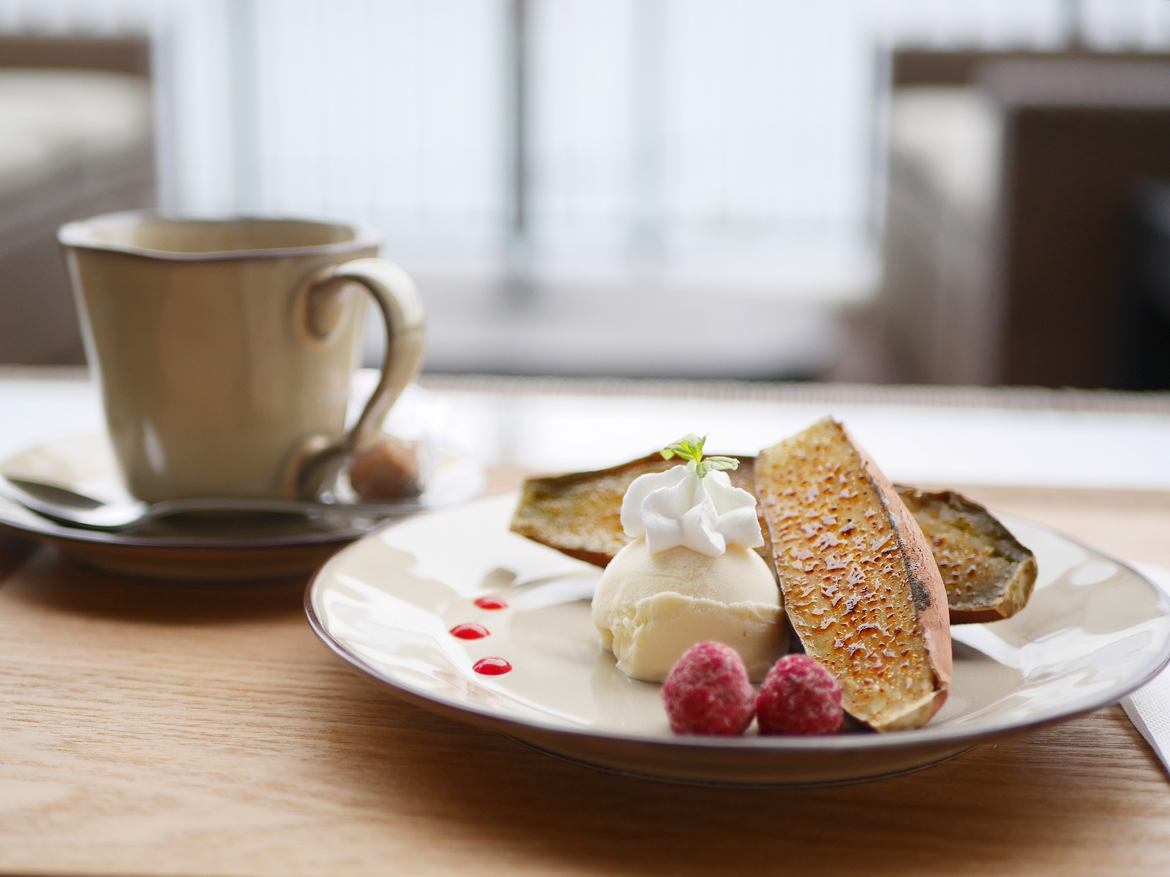 バニラアイスやホイップクリーム、ラズベリーの酸味が加わることで、懐かしさと贅沢さが同居する味わいに。控えめなサイズ感で、ランチ後にも軽やかに楽しめます。丁寧に淹れた中深煎りの「ホットコーヒー(440円税込)」のまろやかな苦味がブリュレの香ばしさと調和し、すっきりと心地よい余韻を残します。