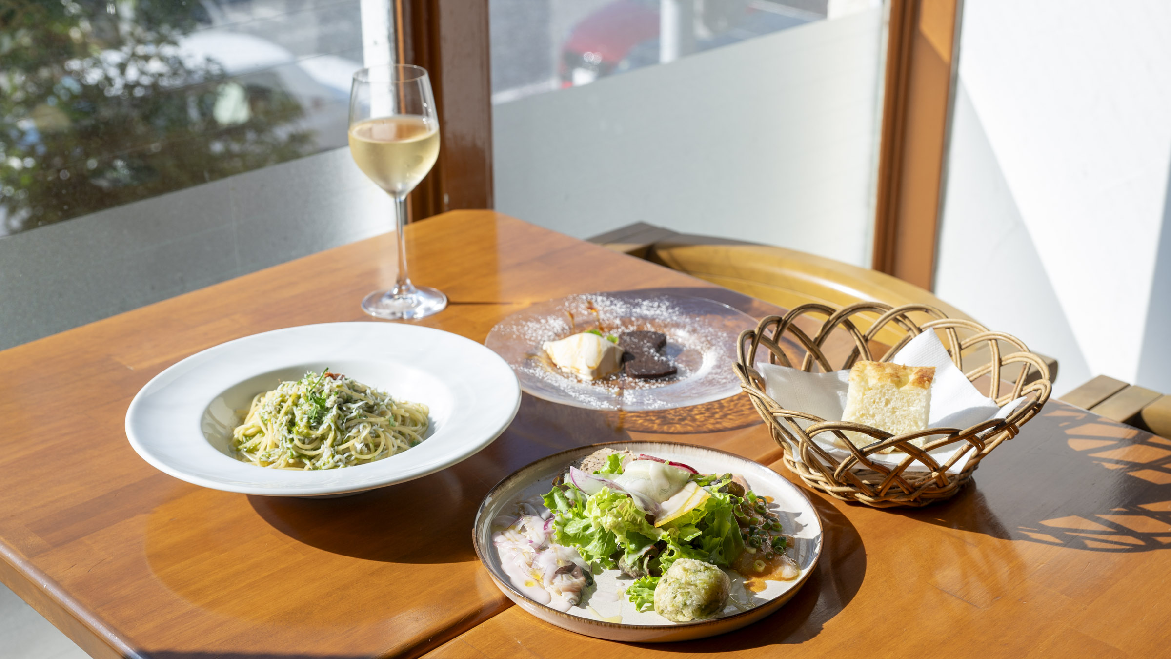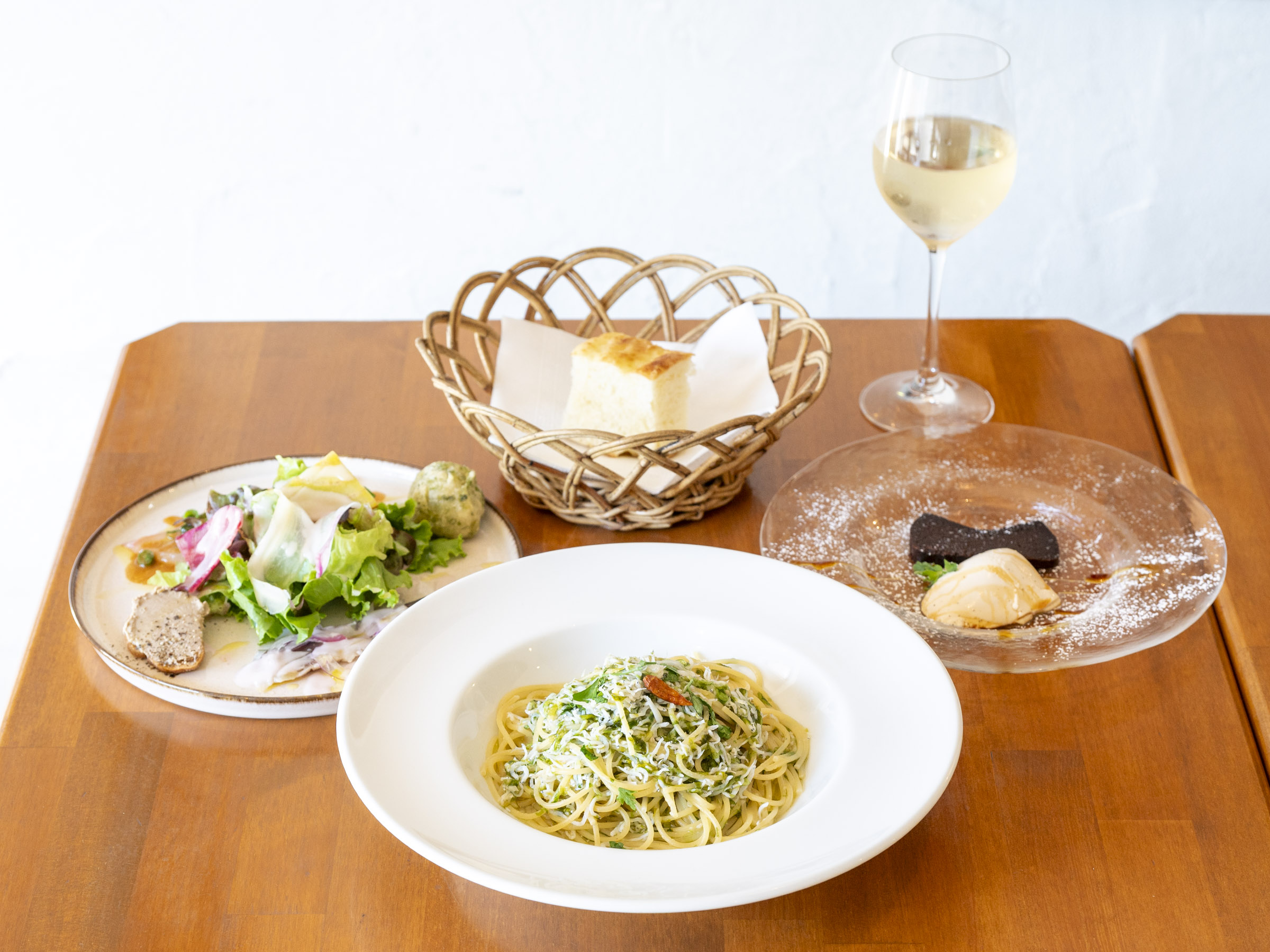 ランチタイムは予約でほぼ満席という人気のイタリアンです。魚介の香りあふれるパスタや色とりどりの前菜、選べるデザートまで楽しめるランチコースが人気の秘密。