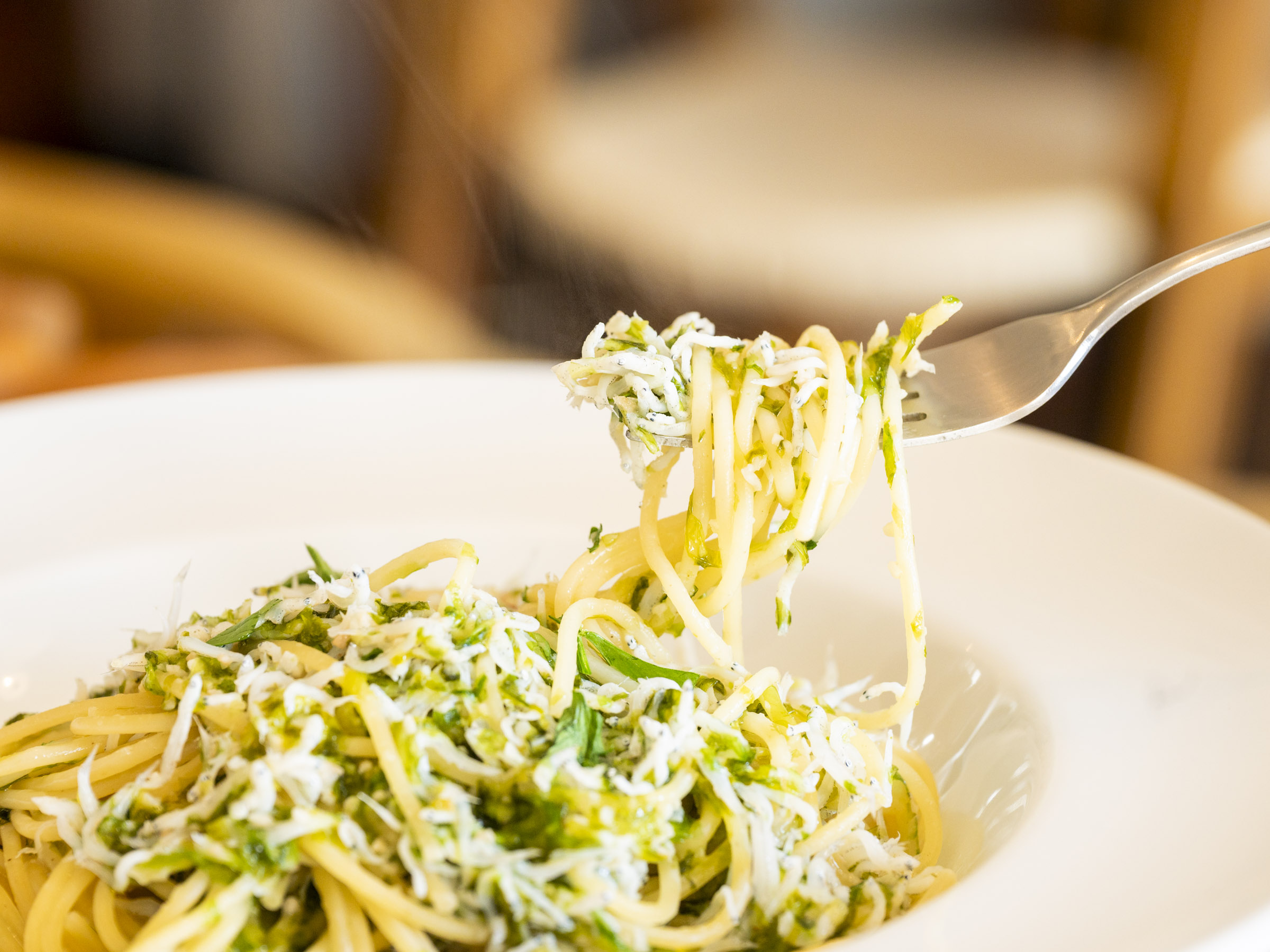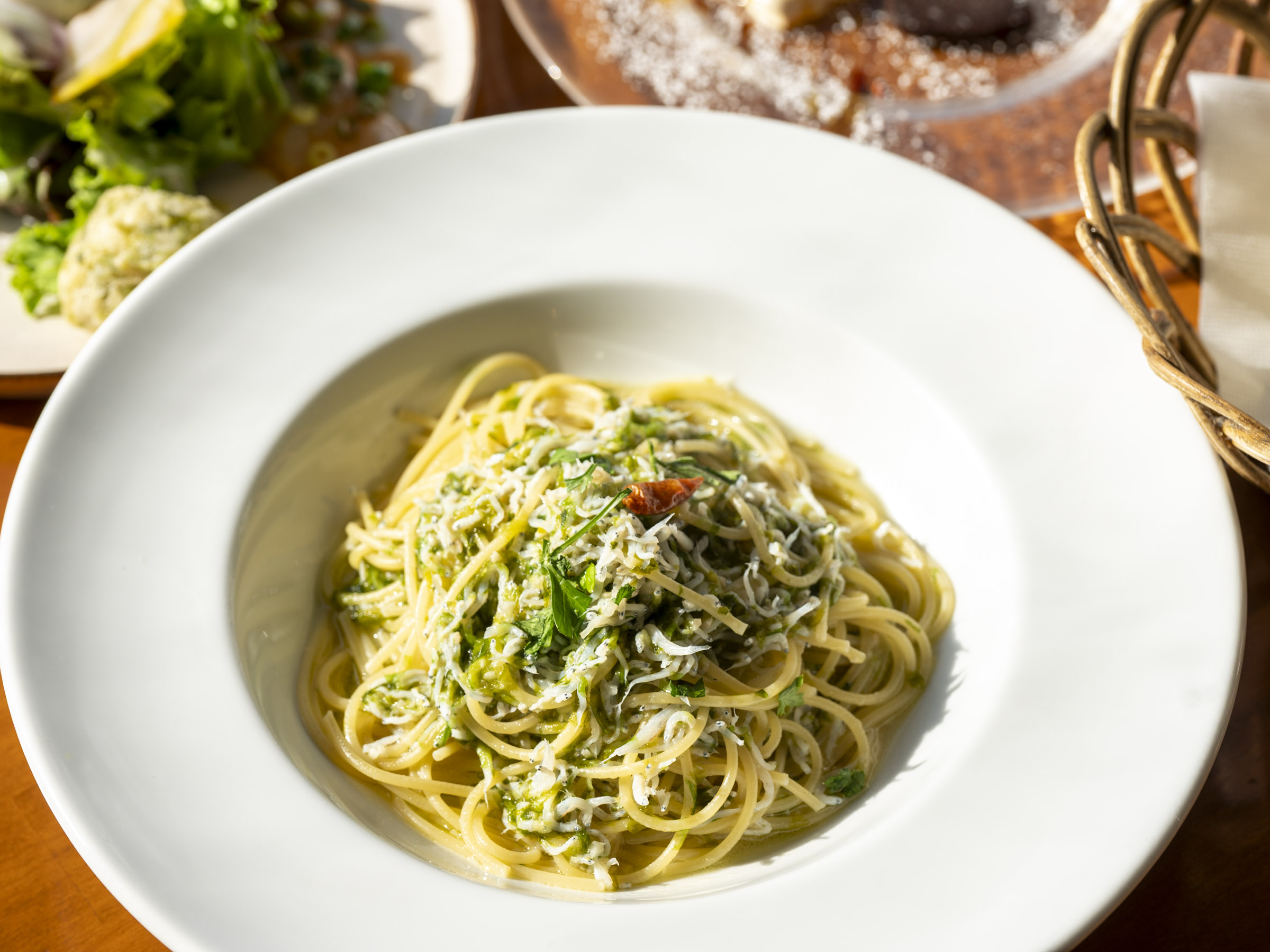 この日のパスタは、5種類用意されていました。その中から「シラスと青のりのペペロンチーノ」をオーダー。