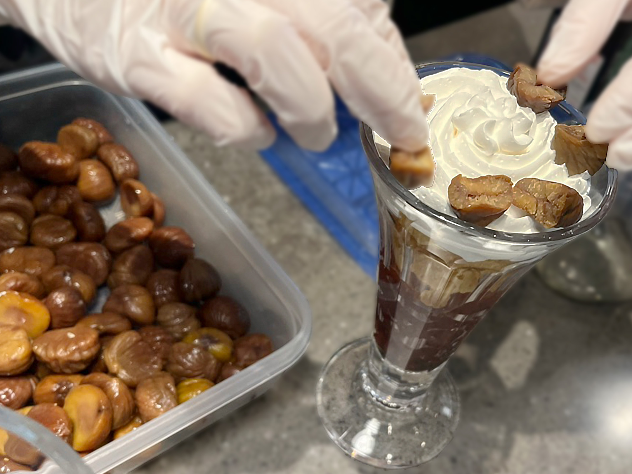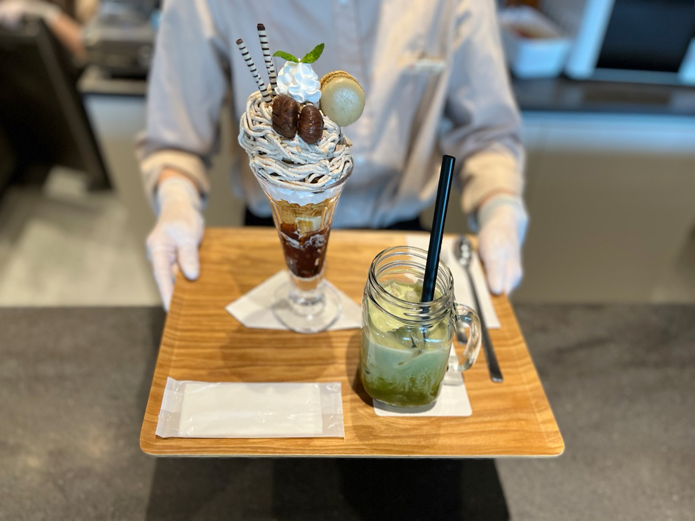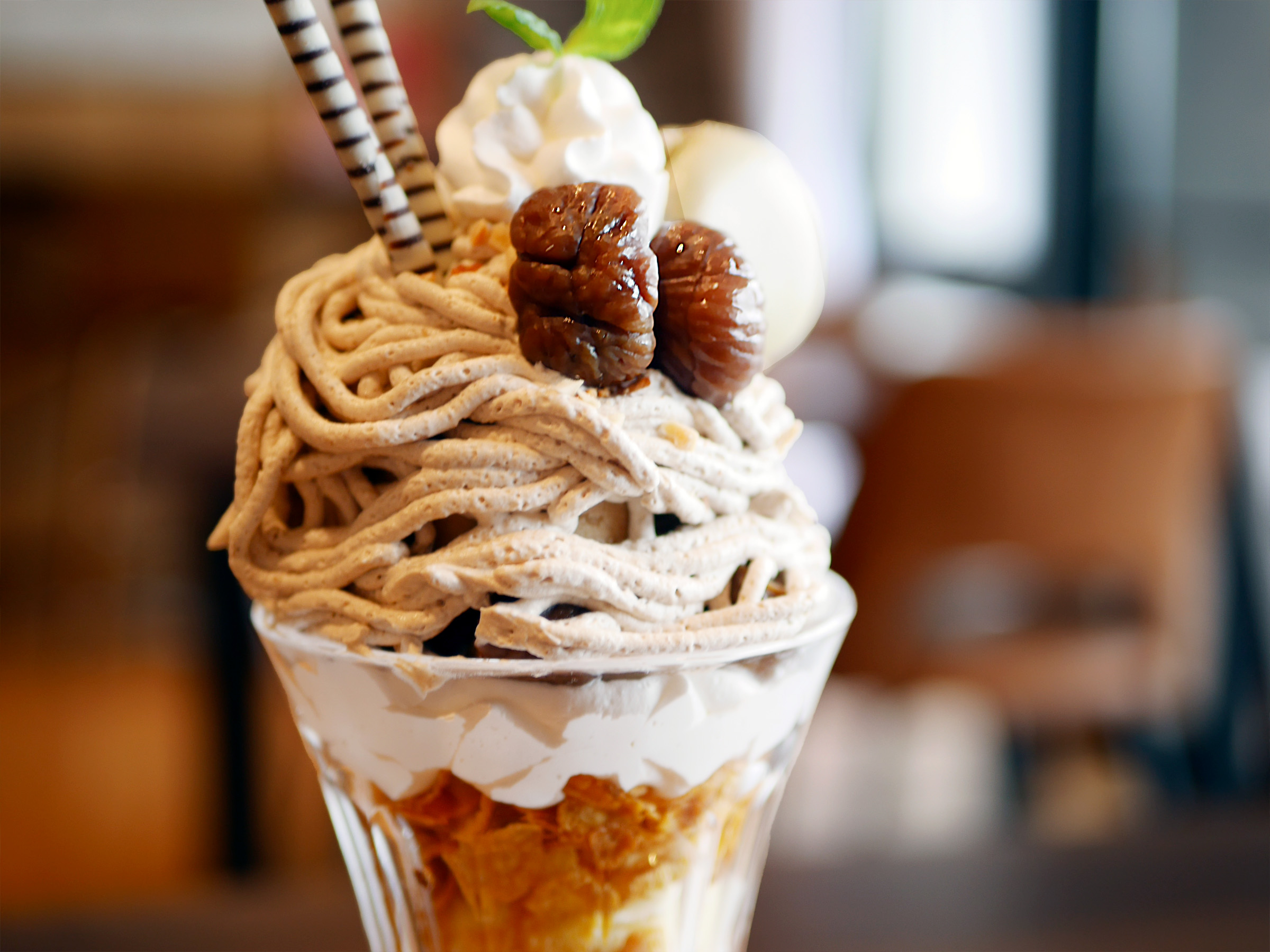 濃厚な栗の香ばしさをまとったマロンホイップに、ほっくりとした栗が並び、ひんやり広がるマロンアイス──。グラスの中で美しく重なる層を崩すたび、栗の異なる味わいを堪能。