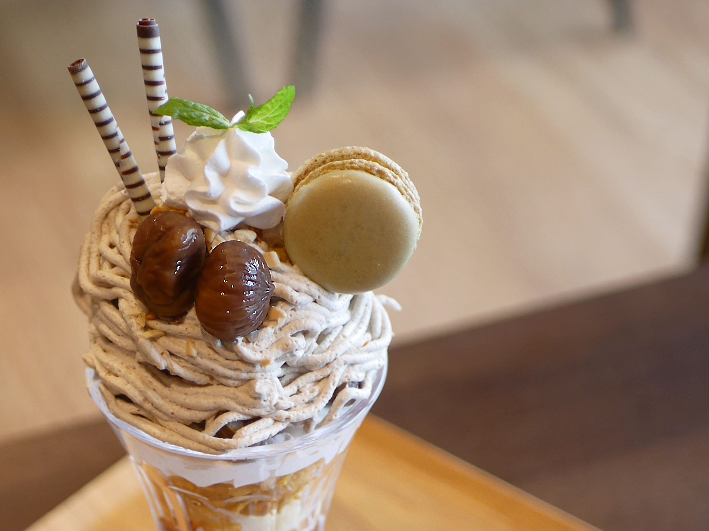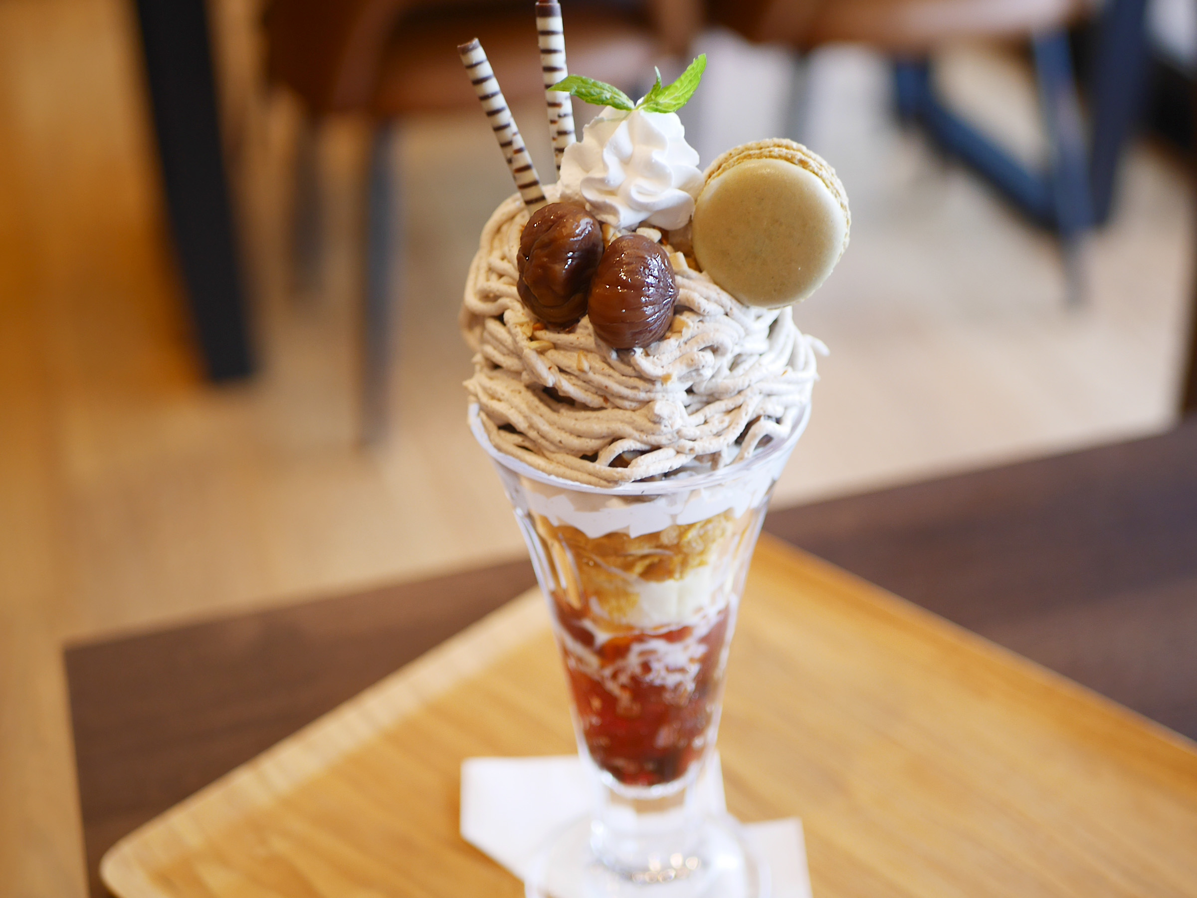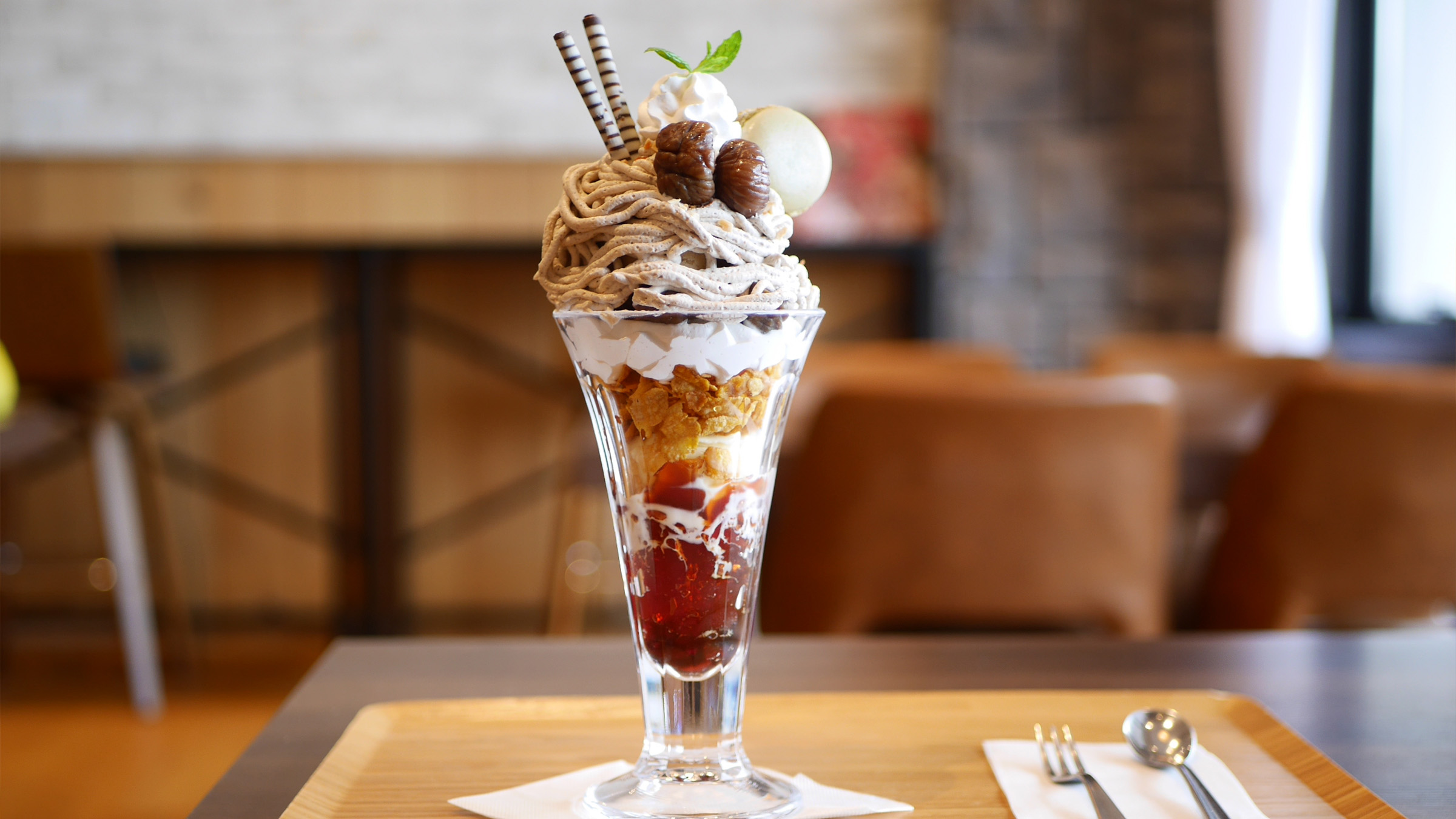 「マゼラン湘南佐島 Book café」の季節限定「マロンパフェ(1210円税込)」は、栗の自然な甘みと多彩な食感をゆっくり味わえる贅沢な一品です。