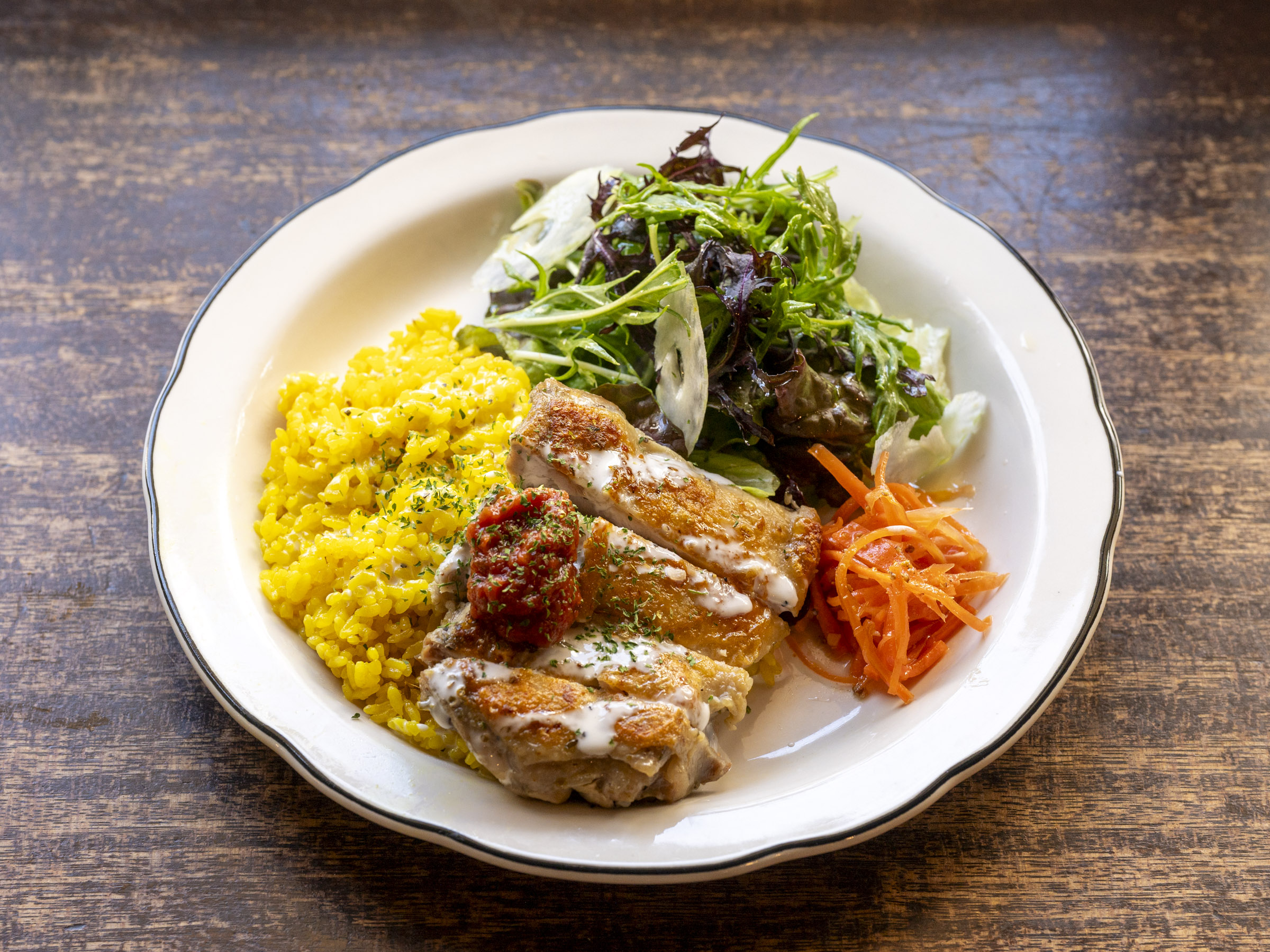 サニーレタス、カラシナ、ルッコラ、そしてニンジンのラペと、たっぷりの野菜も魅力。ランチタイムはフライドポテトも選べ、どちらもボリューム満点。