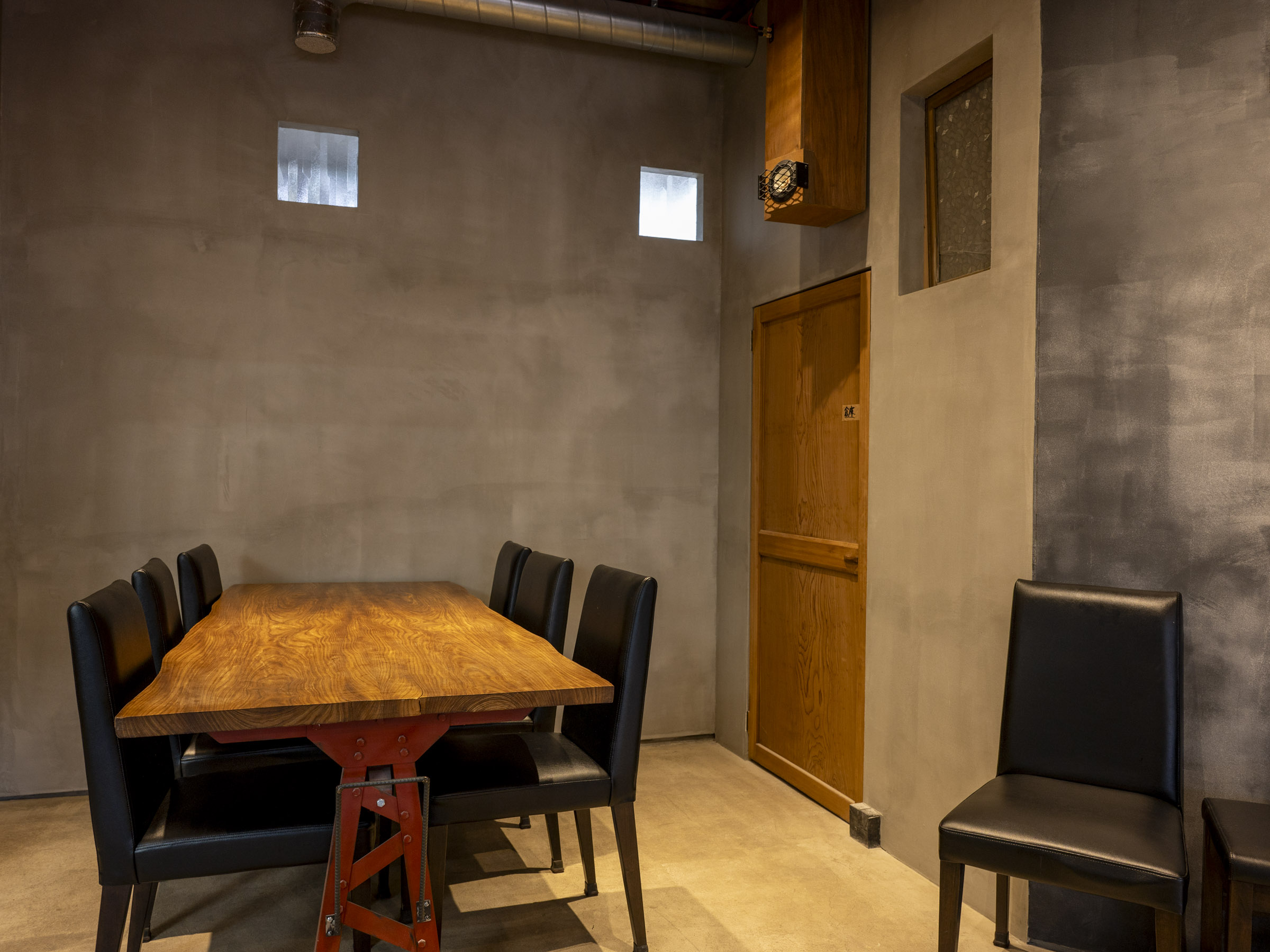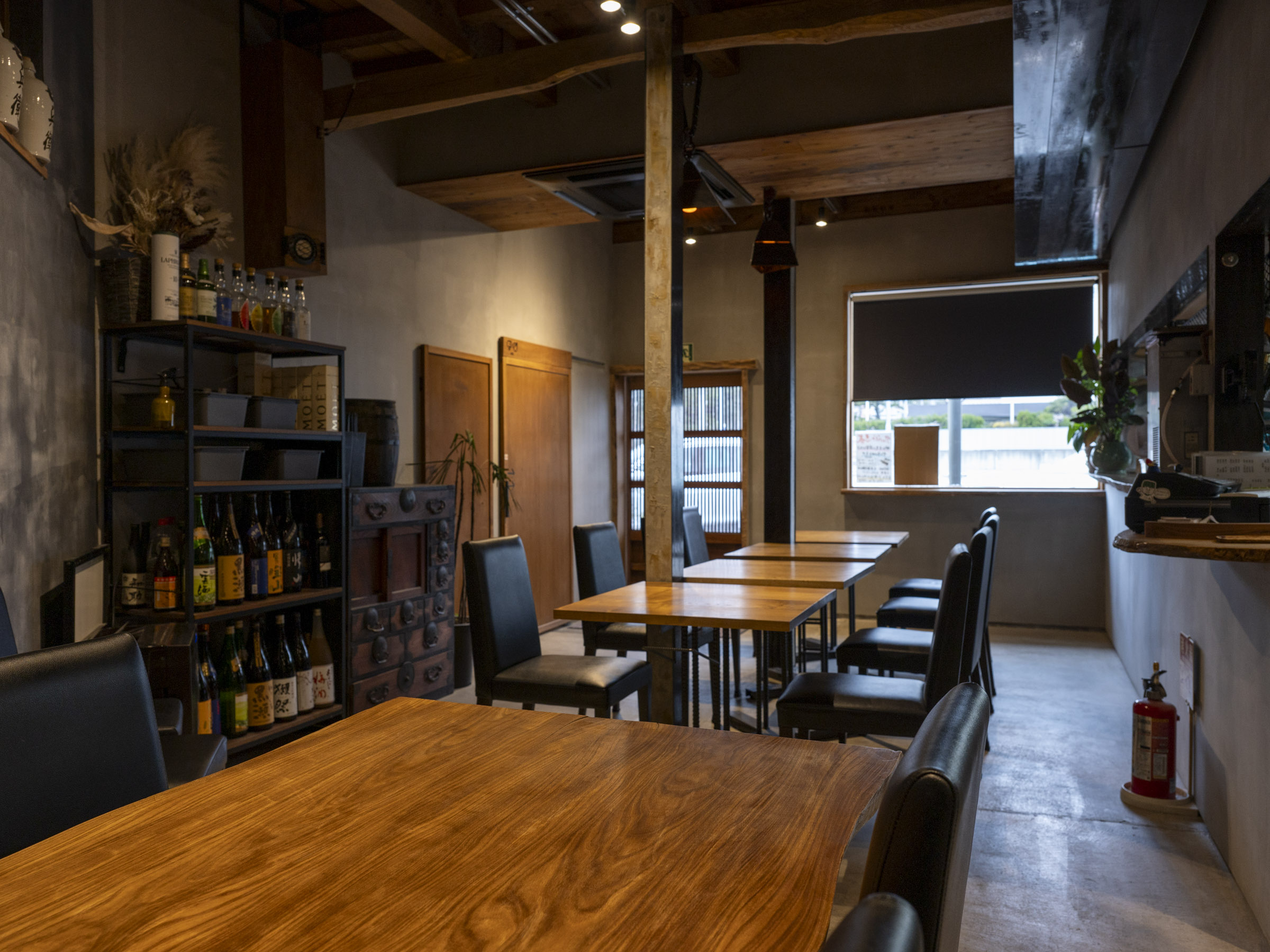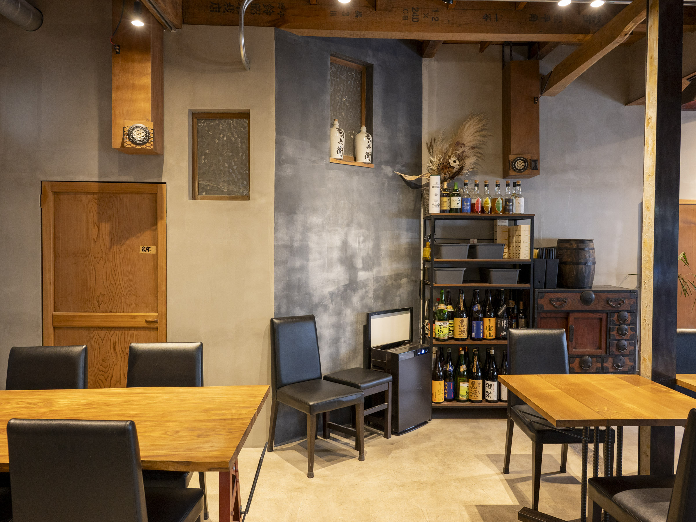 徹底したリノベーションで守谷さんの趣味を打ち出しています。セメントの灰色を基調に、机の木材、黒い椅子が並ぶ空間は落ち着いた雰囲気を醸し出しています。