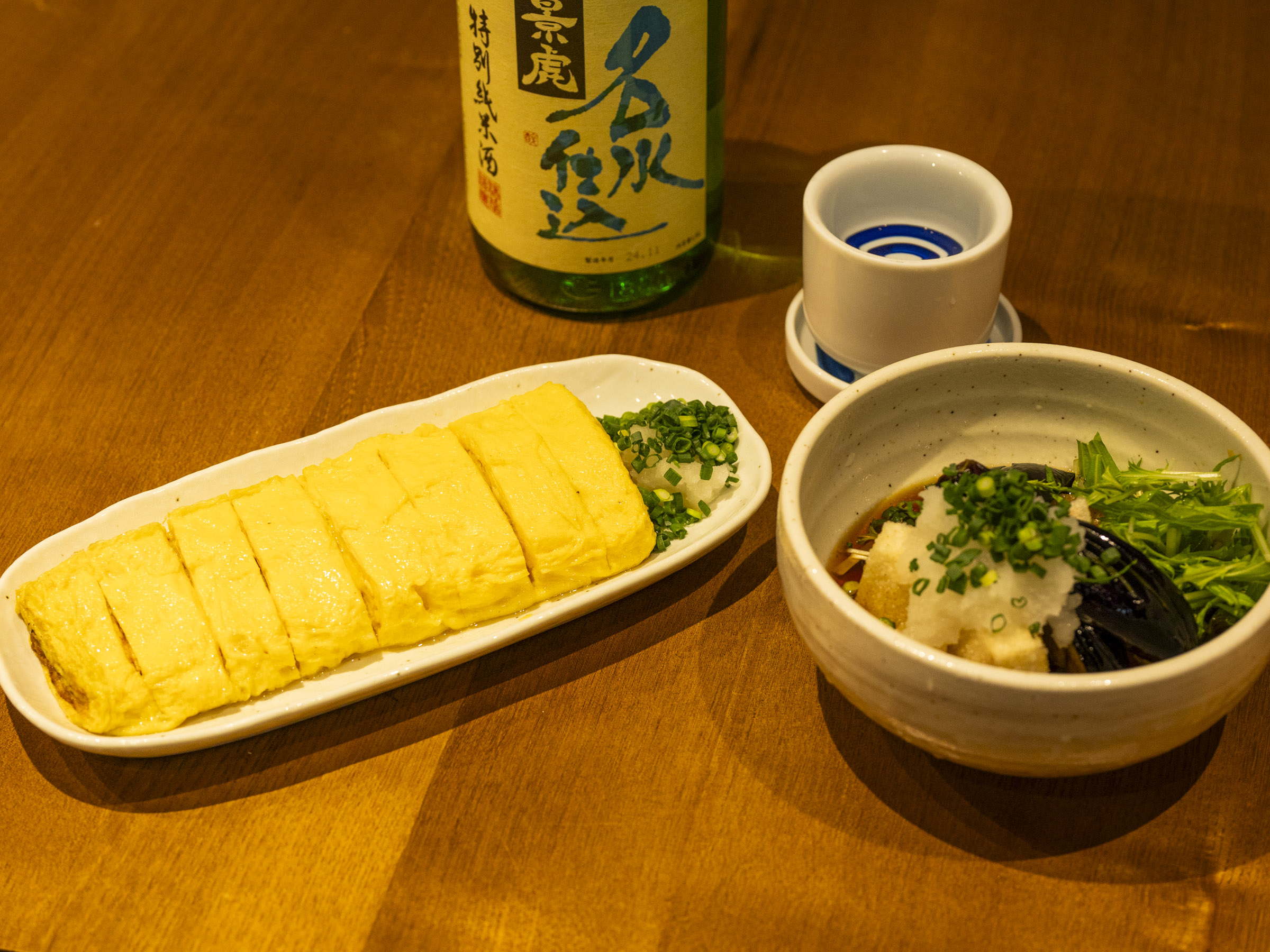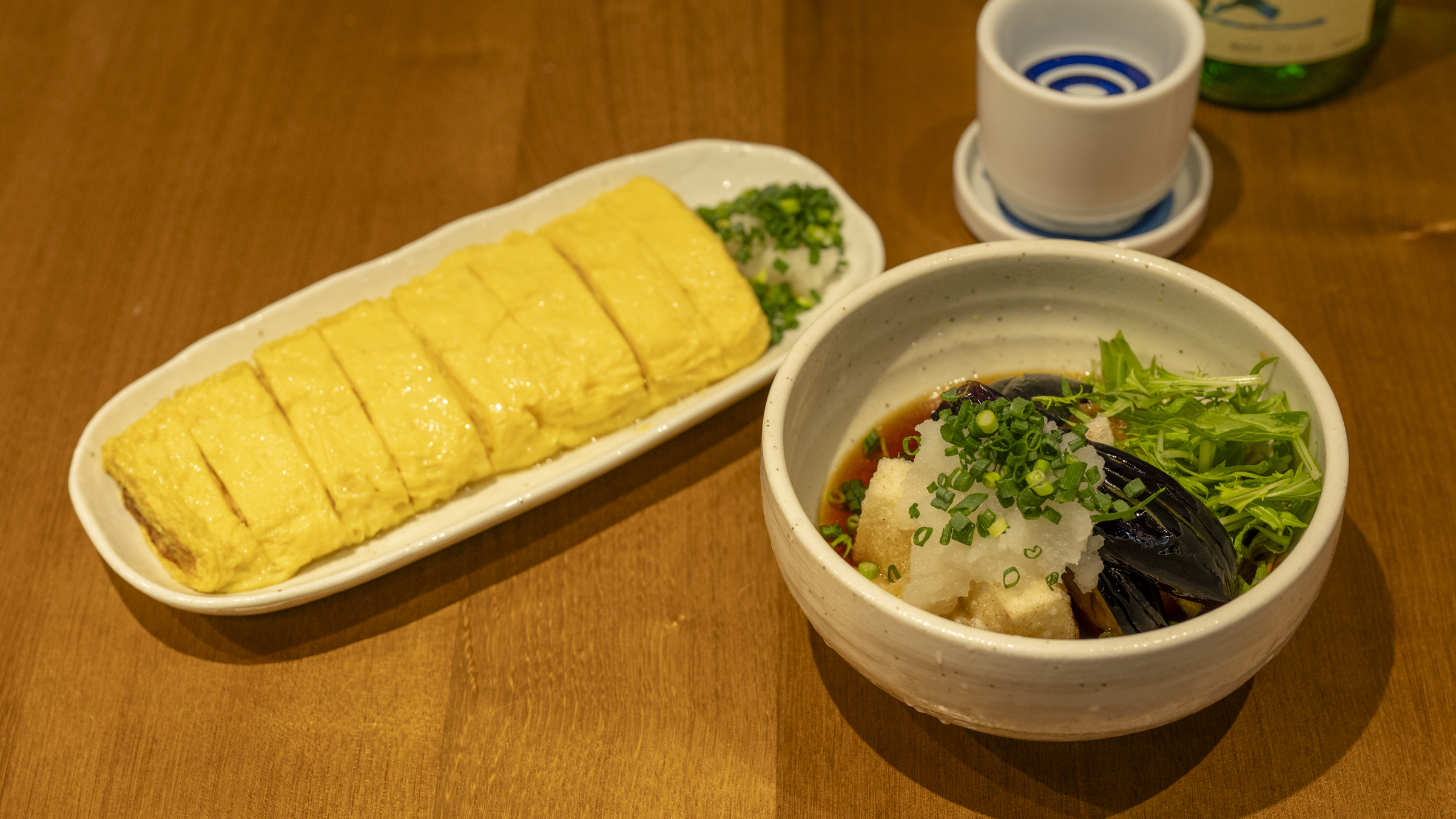 人気の「だし巻き卵」(850円)と「お餅とナスの揚げ出し」(880円)をいただきました。まずはそのボリュームにびっくり。「だし巻き卵」はLLサイズの卵を5個使っているそうです。