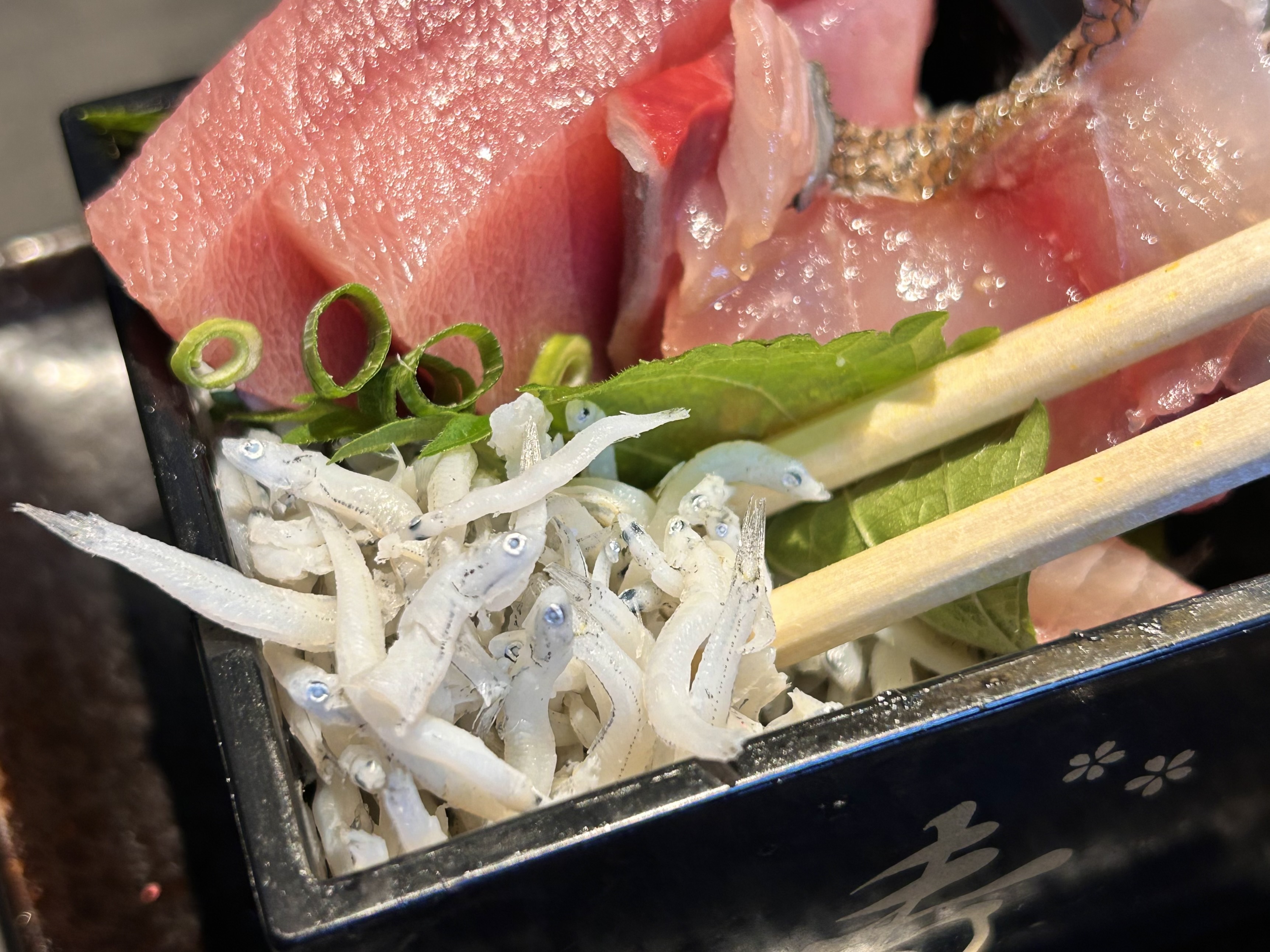 刺身を堪能すると、思いがけないサプライズが待っています。千切り大根の代わりに顔を出すのはふわふわの釜揚げシラスです。