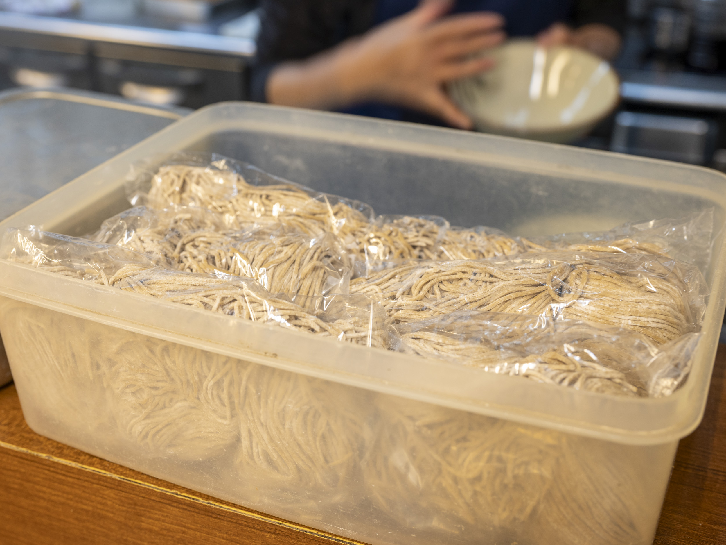 もりそばは注文ごとに、一人前ずつ茹で、氷水でしめて出しています。茹で時間は約90秒。