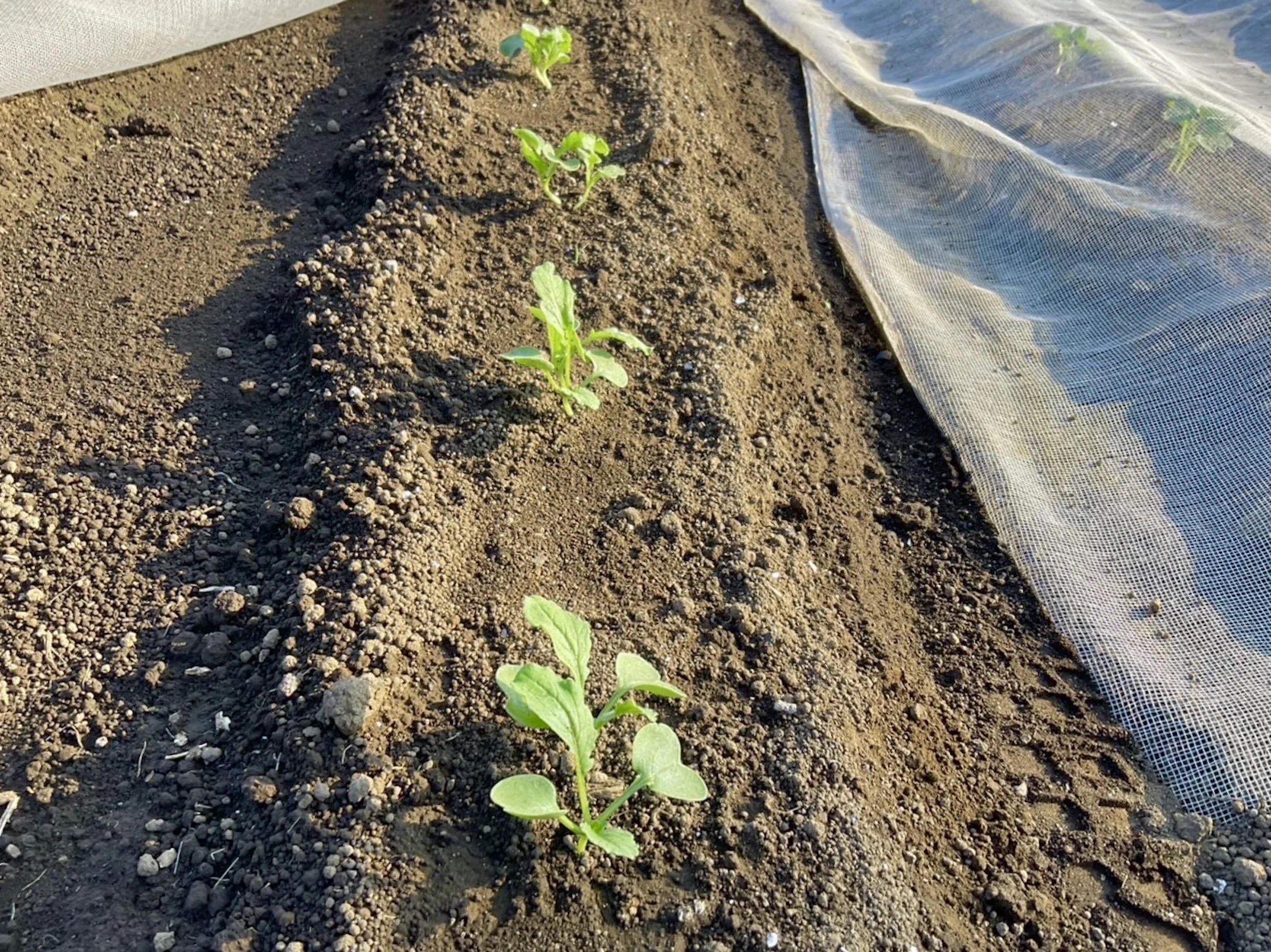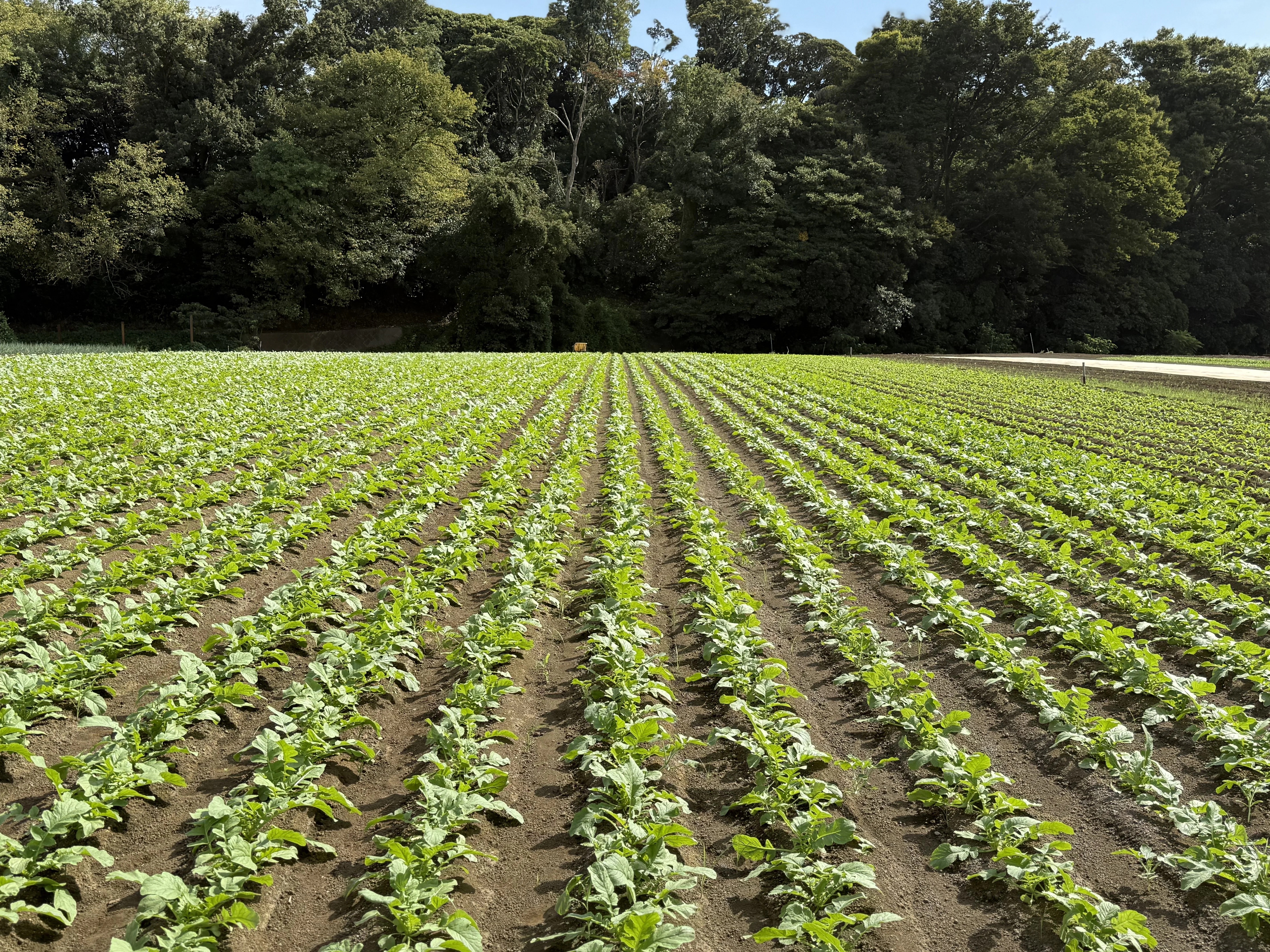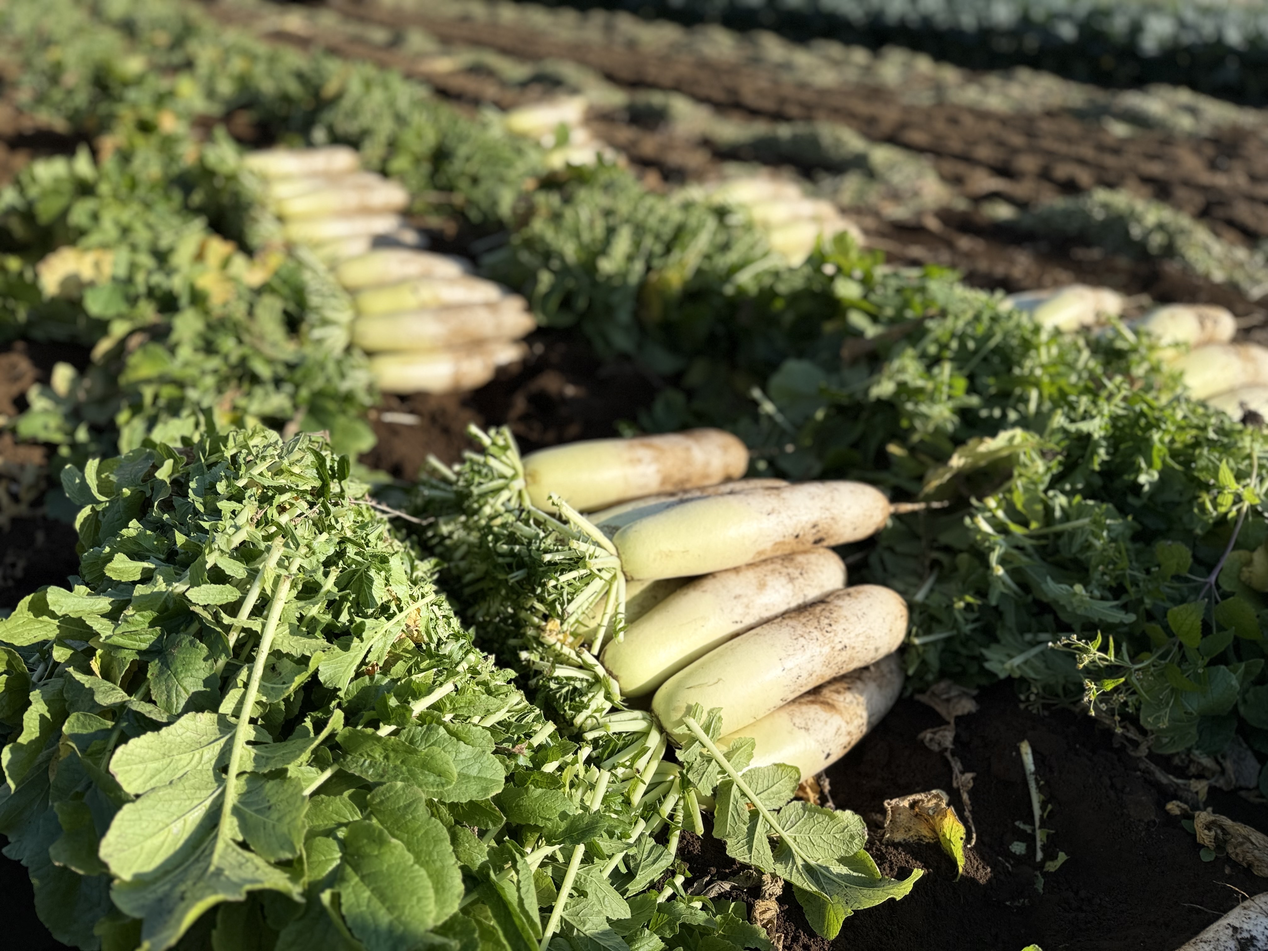 加藤農園の畑では、冬の冷たい空気の中でも大根がすくすくと育ち、8月末の種まきから迎えた今がまさに収穫の最盛期を迎えています。