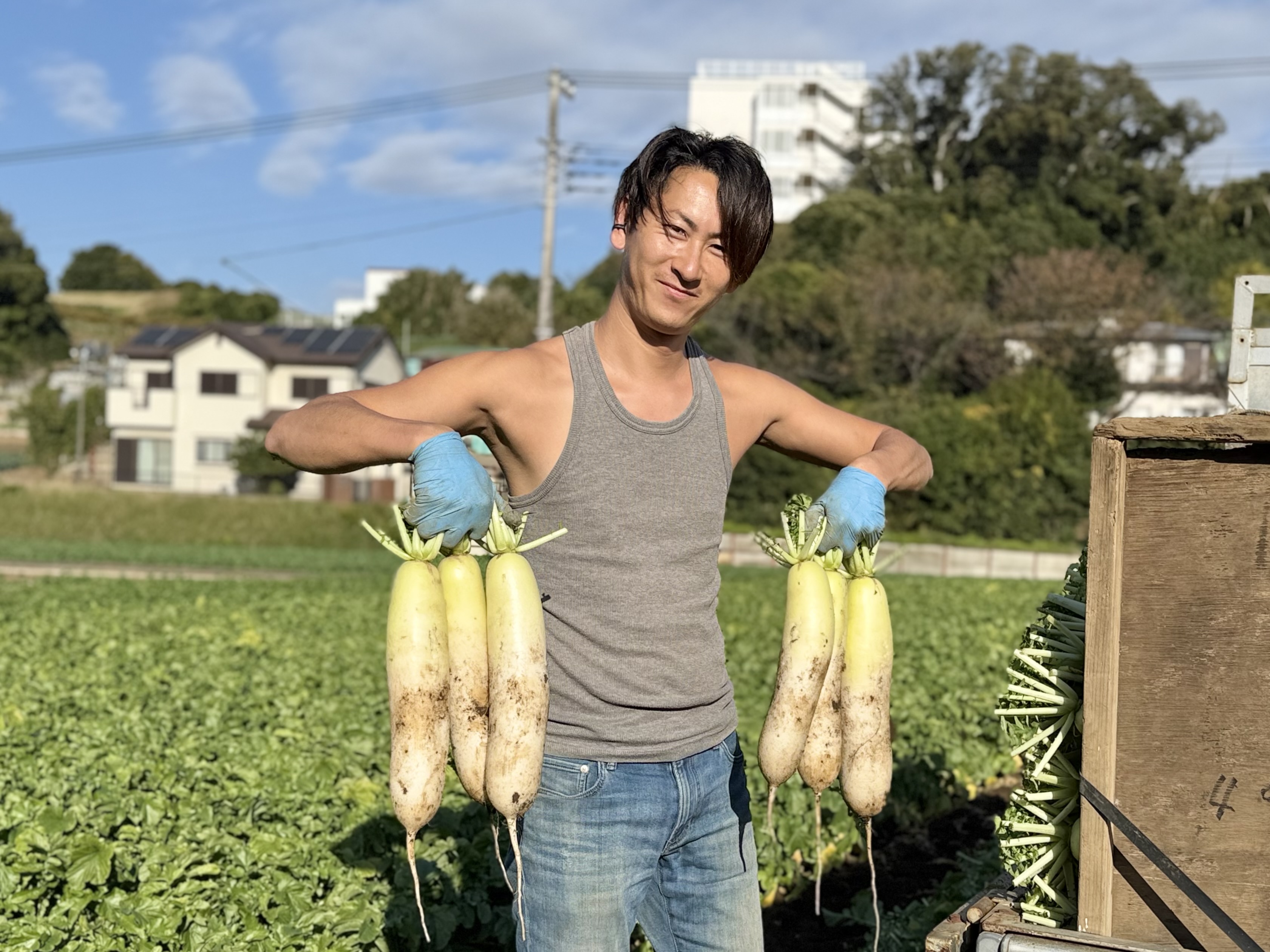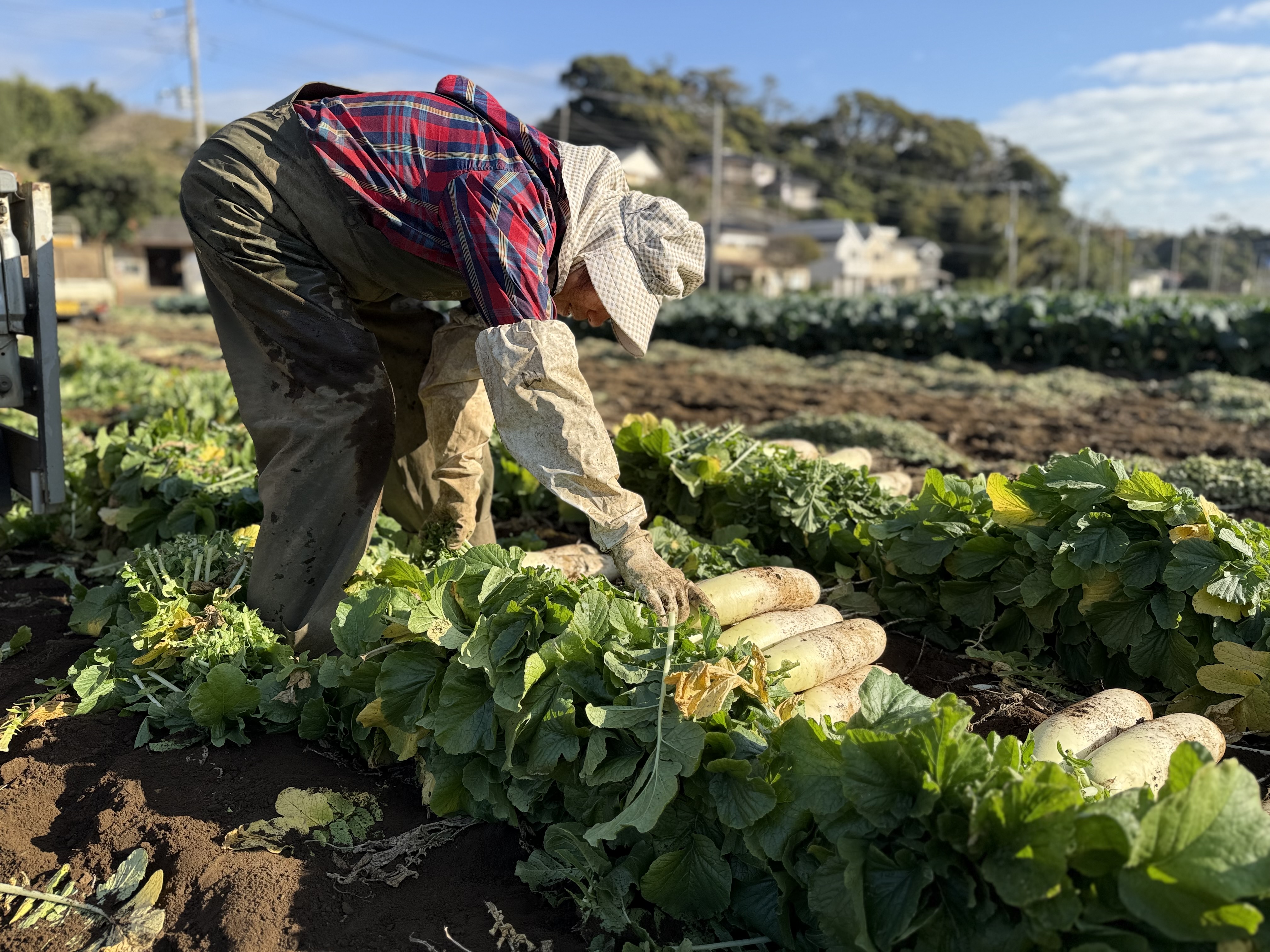 大根がいちばん美味しく育った“その瞬間”を見極めて、収穫のタイミングを決めています。収穫は、立ち上がったり、しゃがんだりをひたすら繰り返す重労働。腰にも腕にも負担がかかりますが、それでも加藤農園が手を止めることはありません。そこにはいつも、「おいしい大根を届けたい」という揺るぎない願いがあります