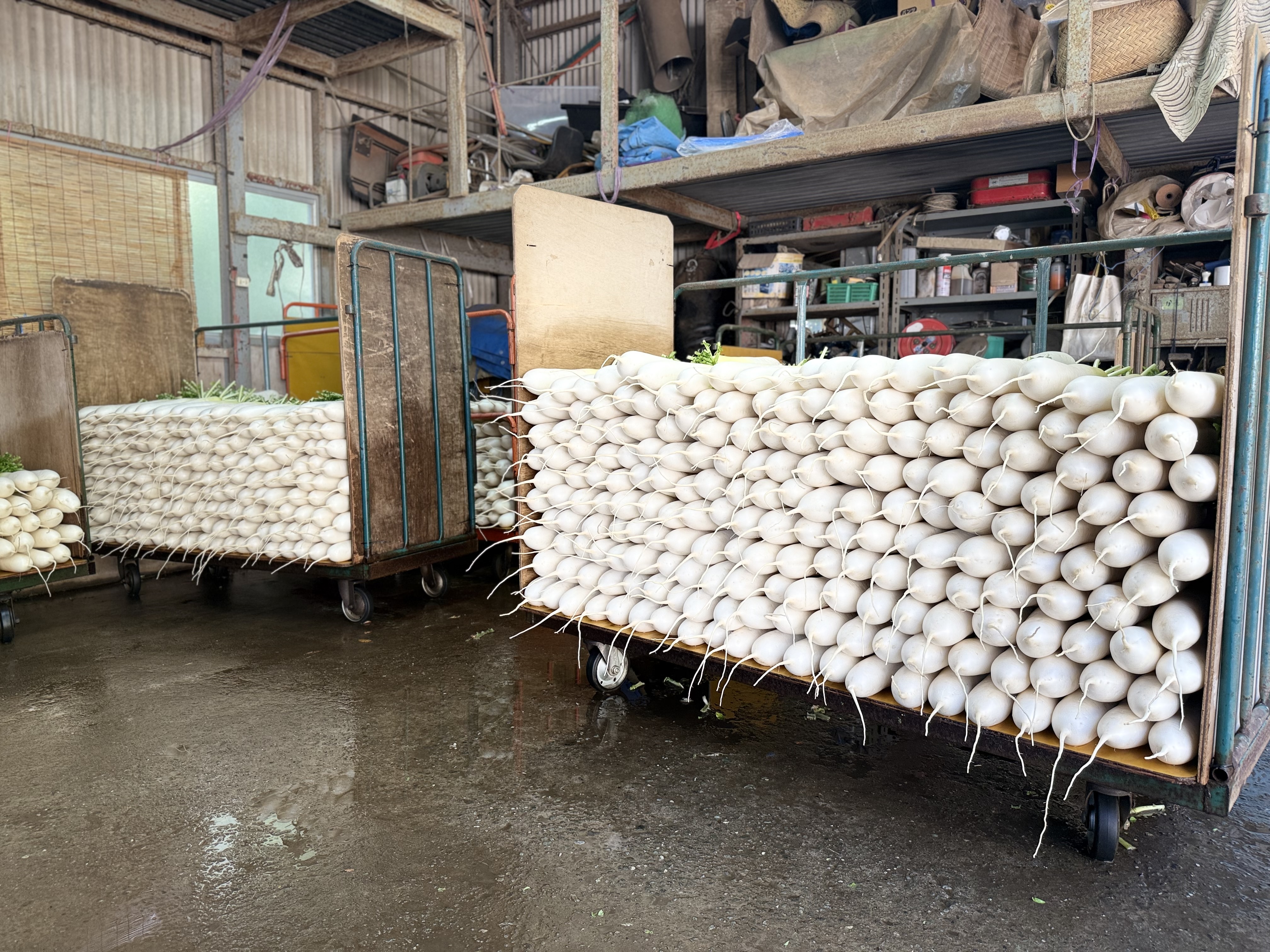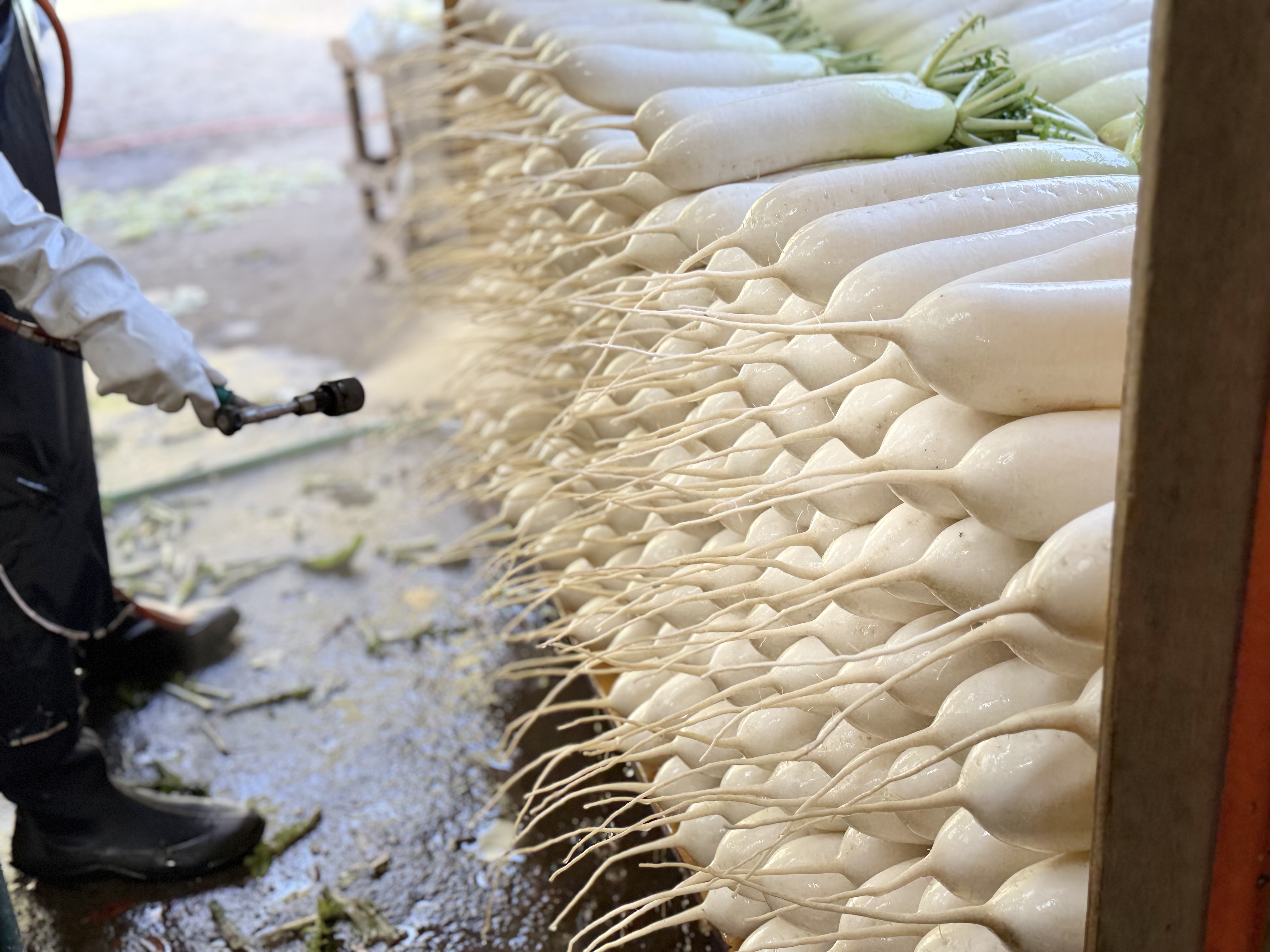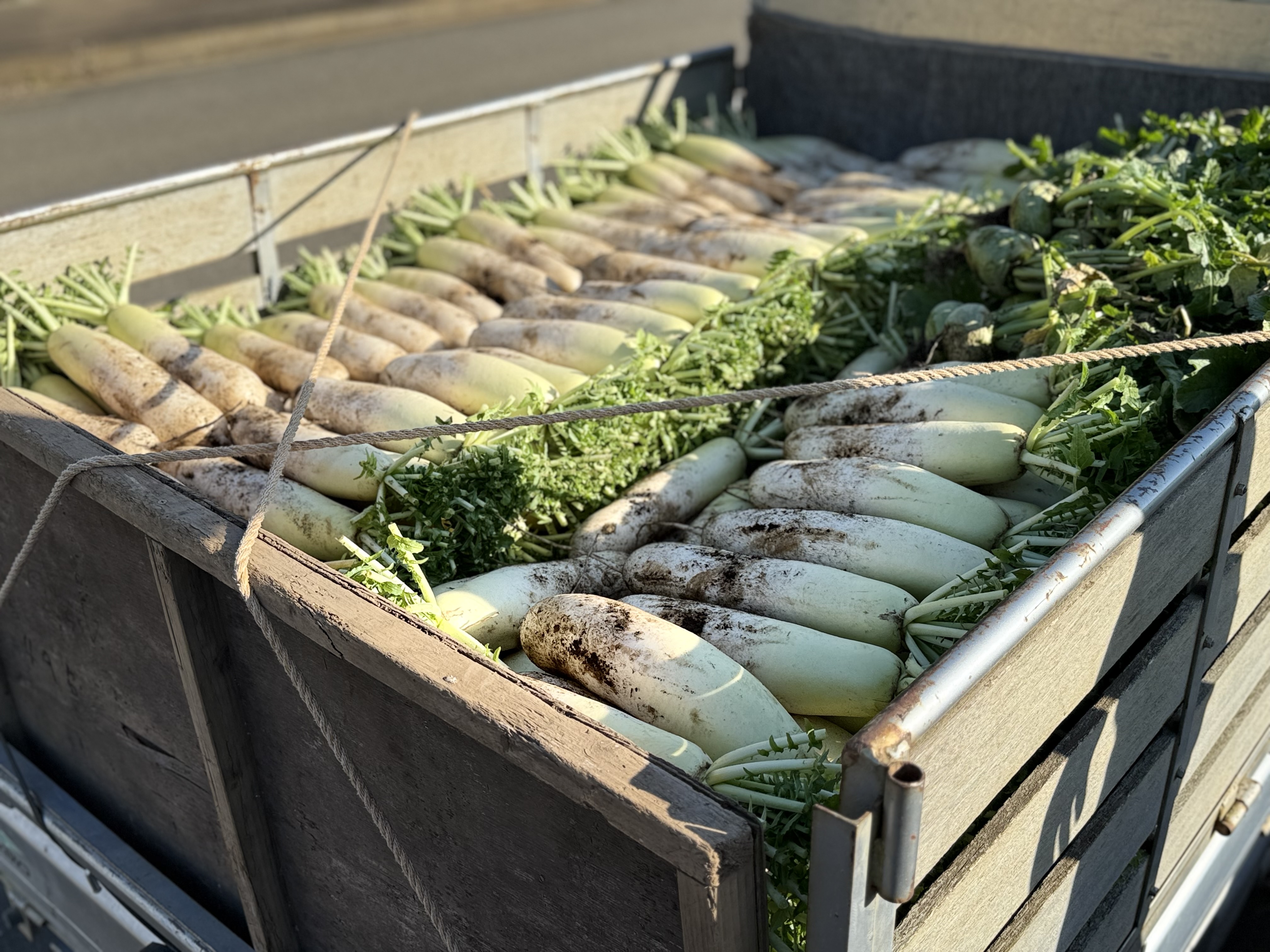機械を通った後でも、大根は必ず1本ずつ手に取り、状態を丁寧にチェック。形・重さ・表面のきれいさを確かめながら、規格に合わせて積み上げていきます。少し曲がっているものや、皮に小さな斑点があるものは、味にはまったく問題がありません。むしろ、自然の中でのびのび育った証でもあります。しかし市場の基準に照らすと“規格外”となり、一般の流通には乗せられません。