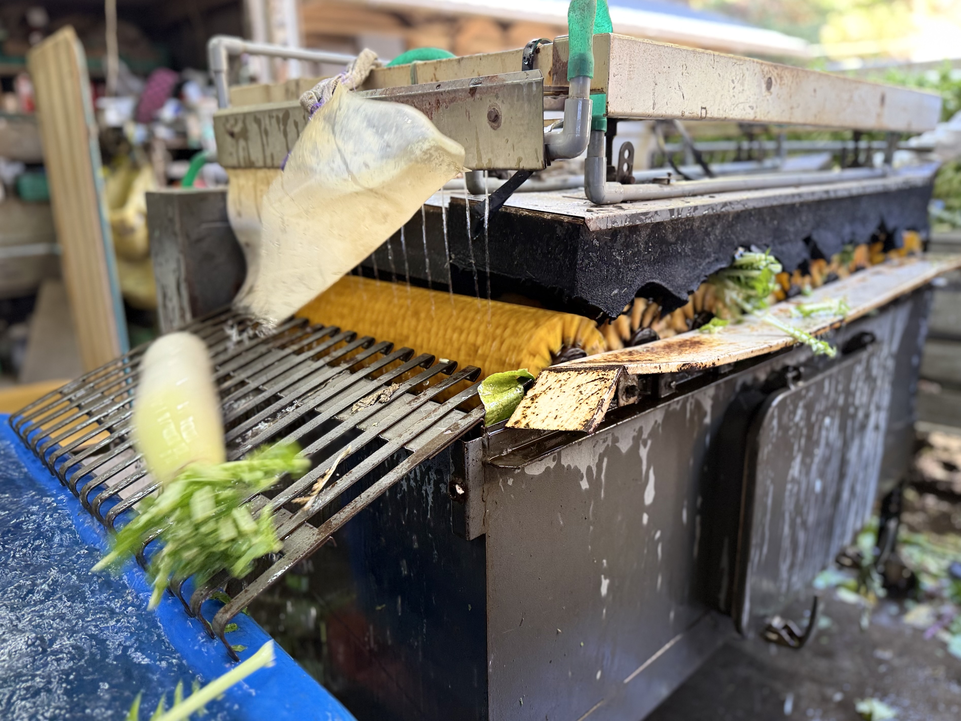 それを毎日、数千本単位で収穫する農家にとって、すべてを手洗いするのは現実的ではありません。そこで専用の大根洗浄機が活躍します。