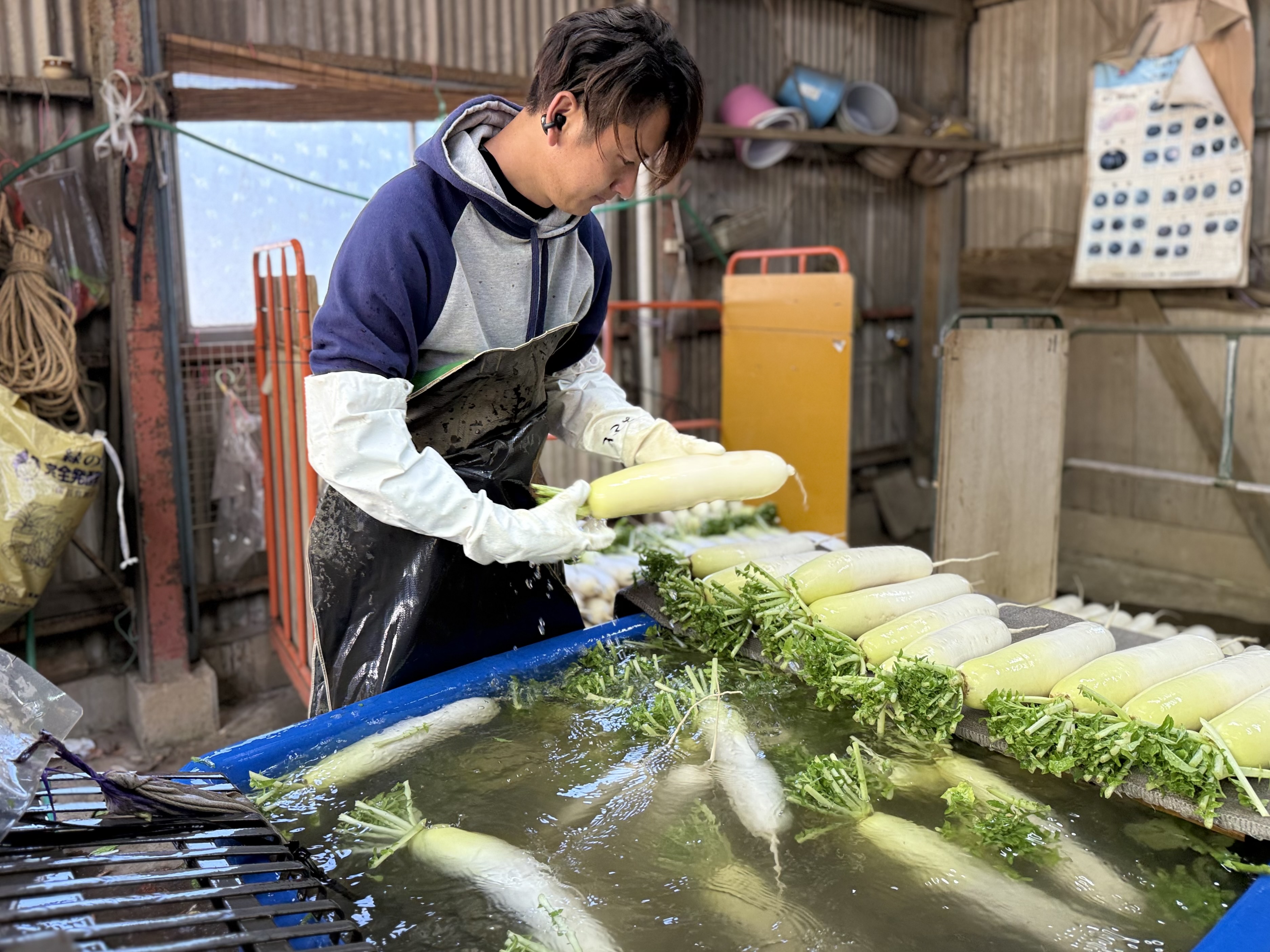 三浦半島の畑に冬の冷たい風が吹き抜ける早朝、大根の収穫の最盛期を迎えています。1日2000本もの大根を土から引き抜く力強い手作業、そして白さを磨き上げる丁寧な洗浄工程に密着しました。