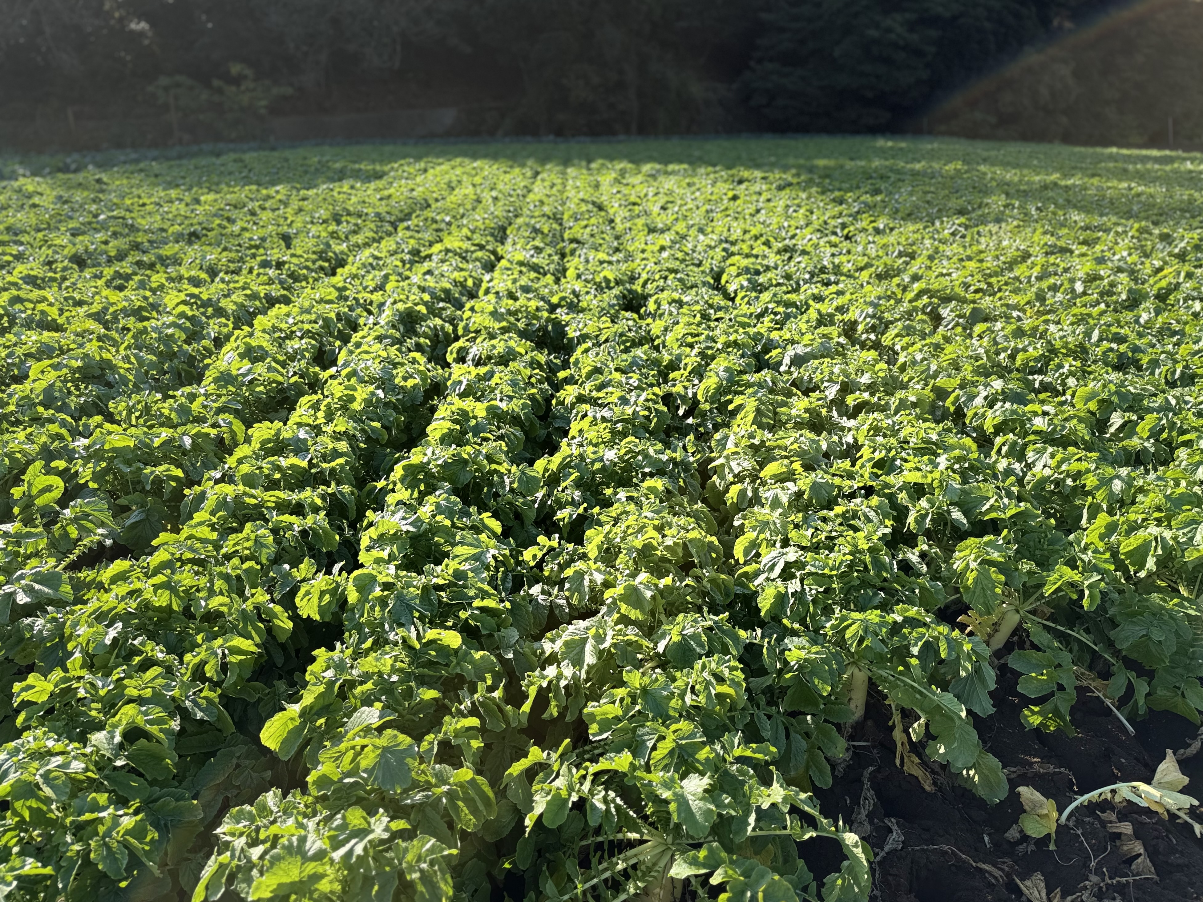 畑の葉は大きく広がり、どの株も堂々と地面を押し上げています。