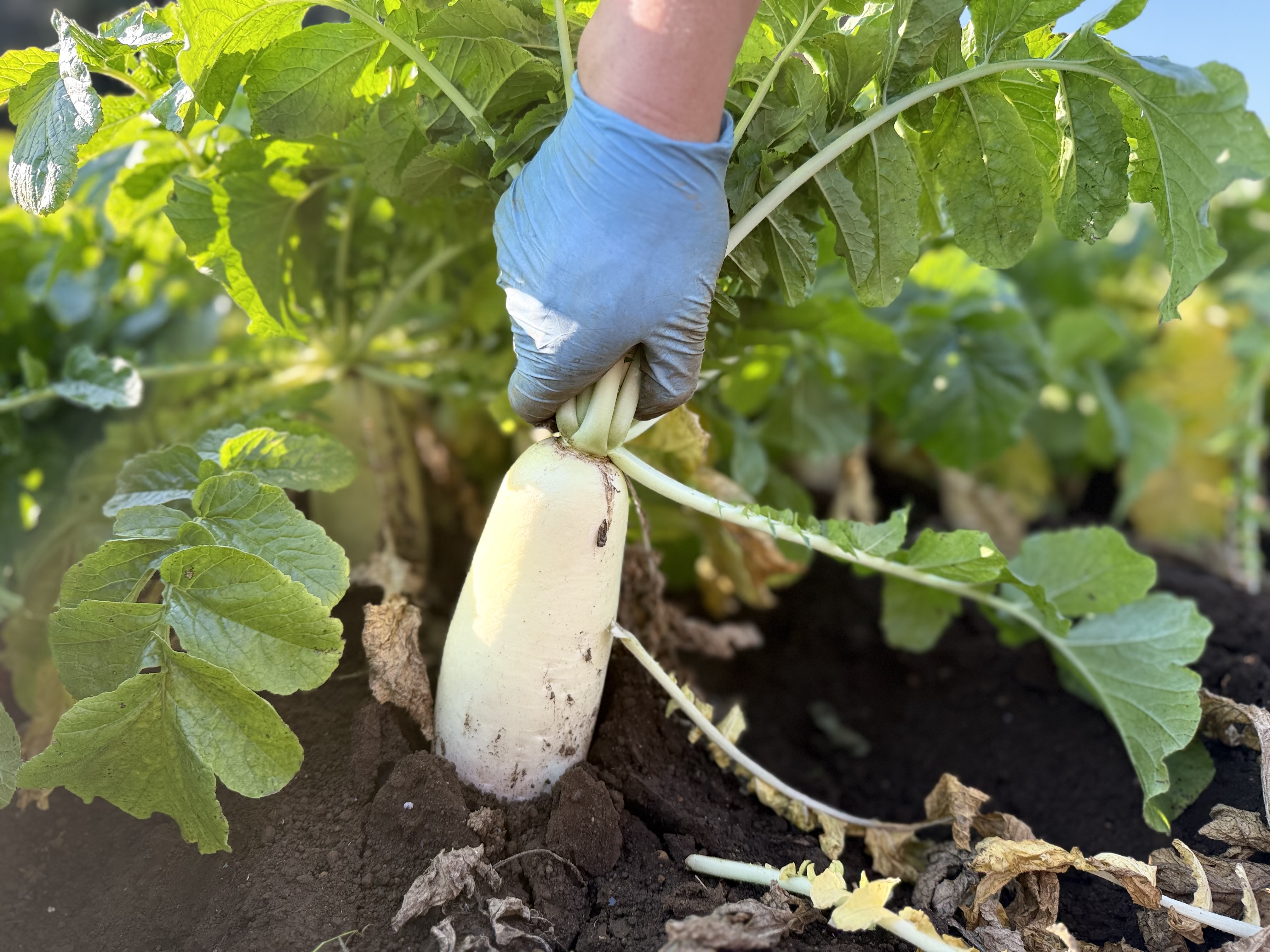 葉をかき分けると、土の中に白い大根の肩がのぞき、出番を今か今かと待っているようです。葉元をそっとつかんで引くと、「ポッ」と音がするように、きれいに抜けていきます。