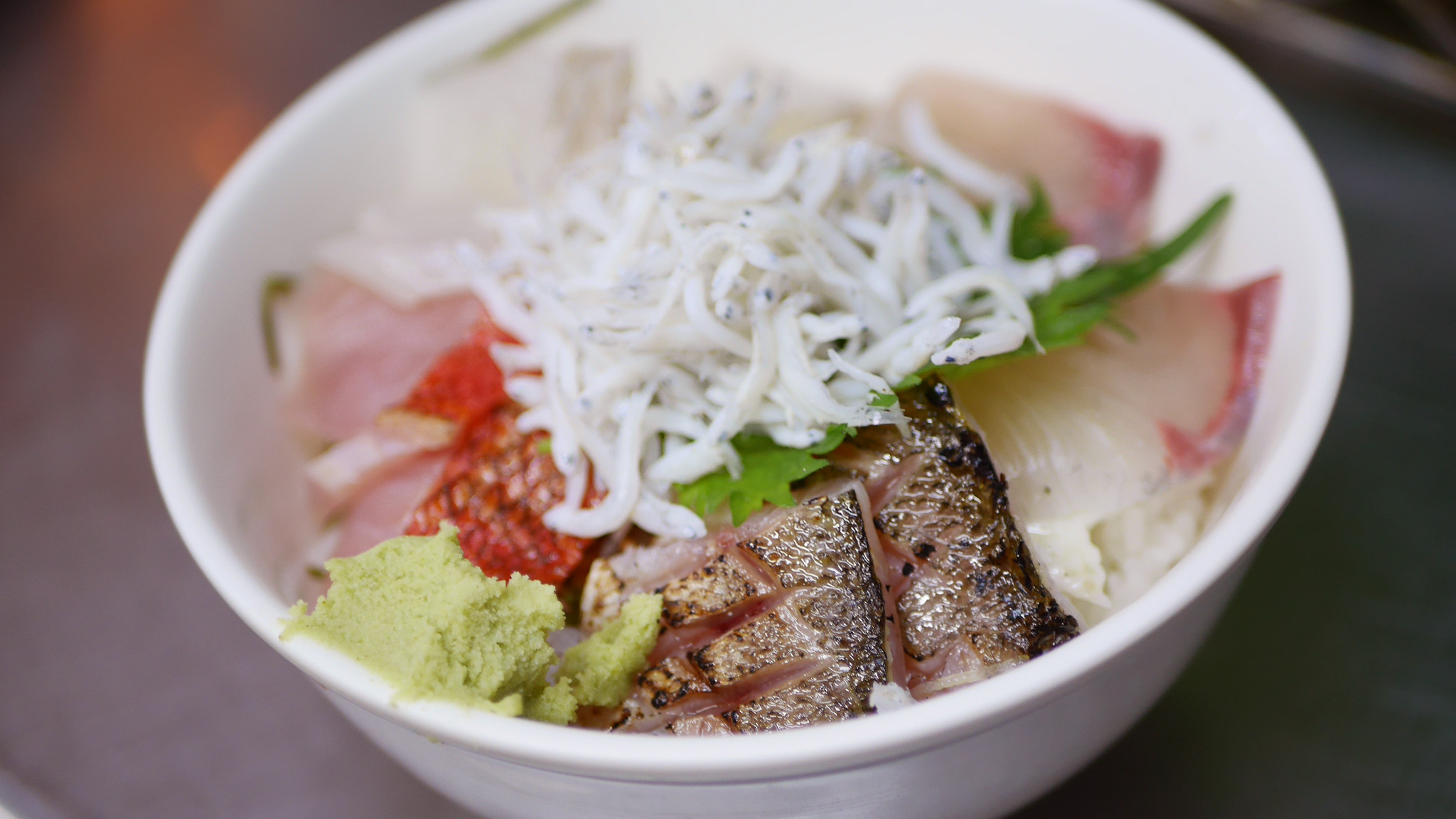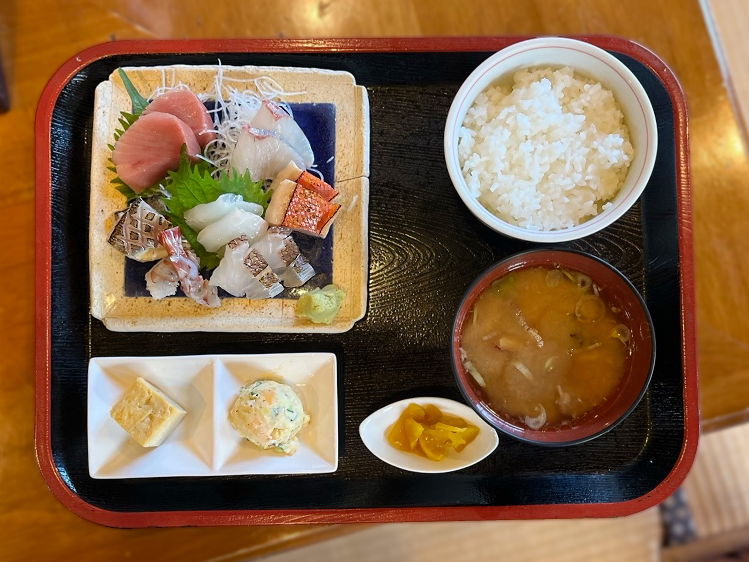 添えられる厚焼き卵はふっくら甘く、ポテトサラダは粒マスタードの酸味が効いた野菜具だくさんの味わい。さらに、キンメダイや真鯛のあらをじっくり煮込んだ味噌汁は、魚の深いコクが溶け込んだ特別な一杯です。