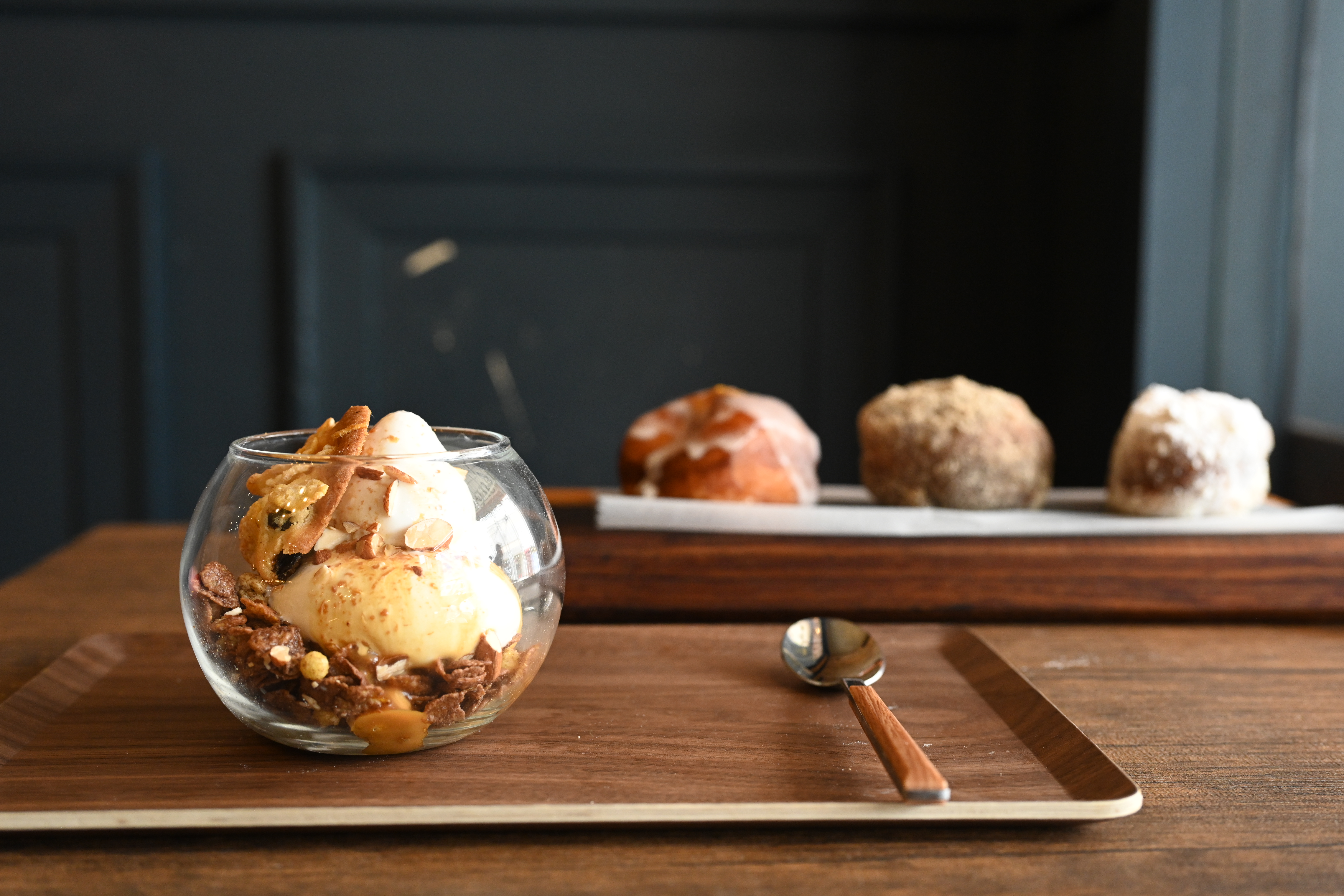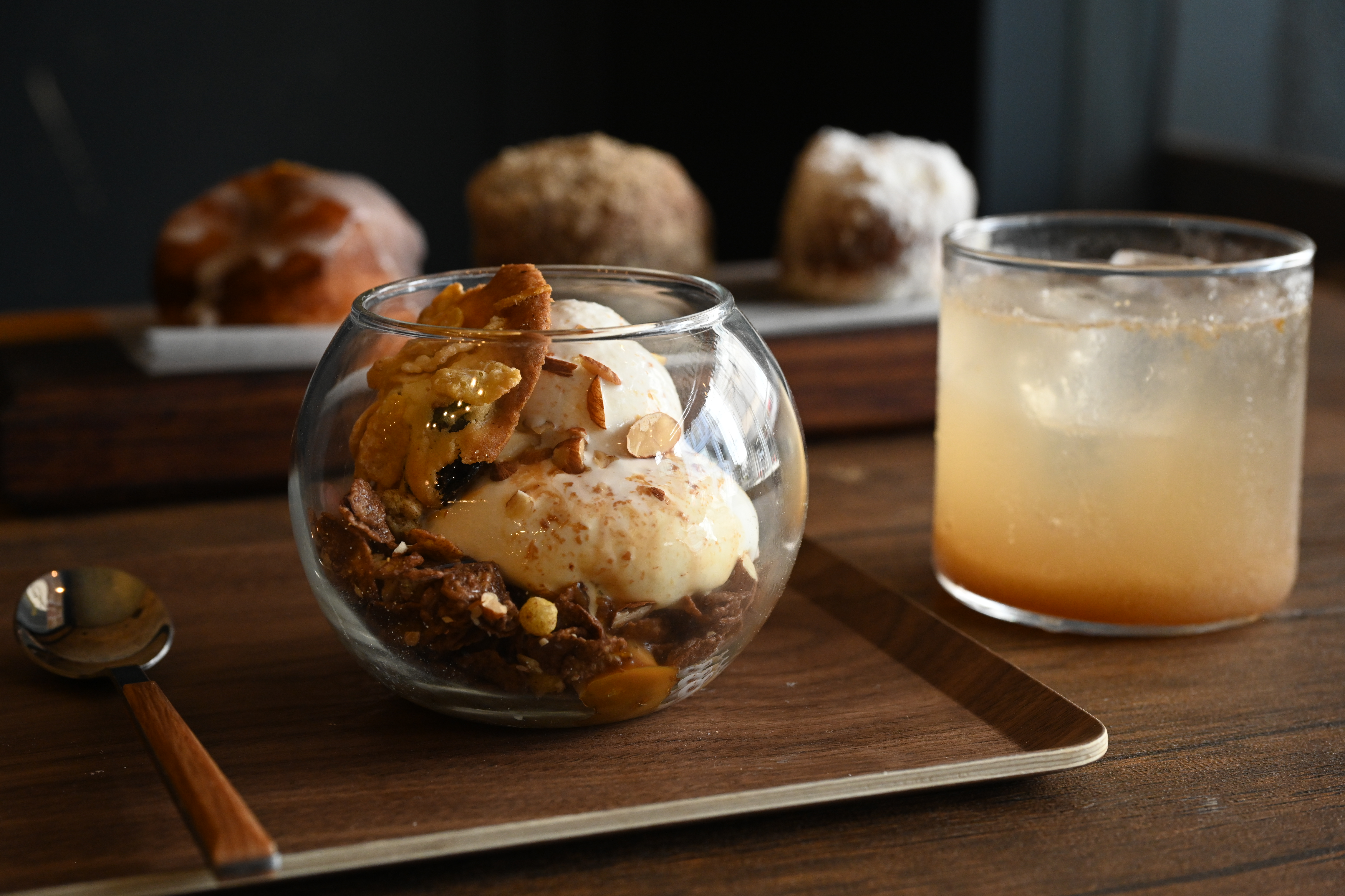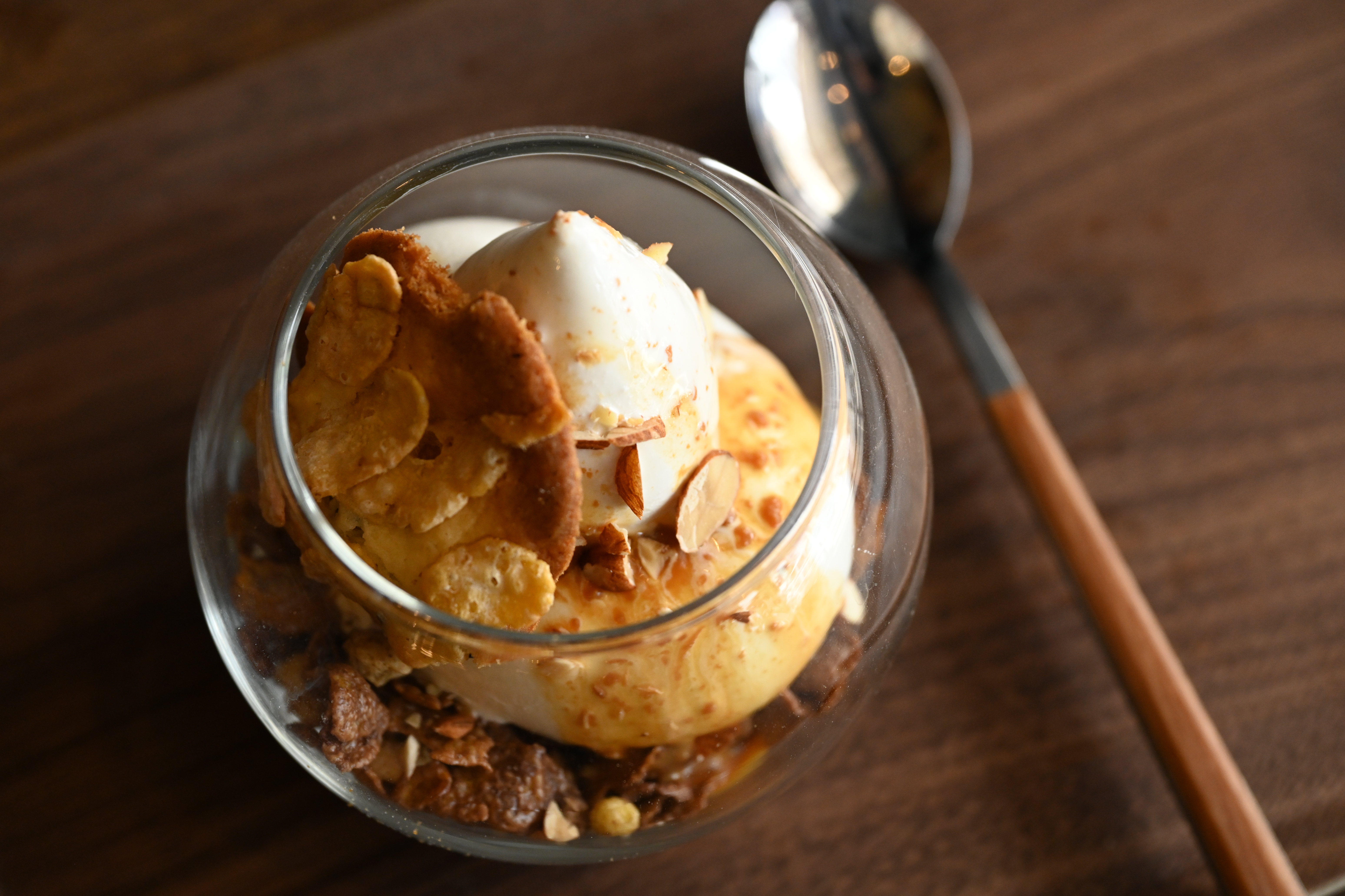 「北海道牛乳で作ったミルキーでフレッシュな味わいのソフトクリームに自家製のキャラメルソースをかけて、アーモンドクラッシュを散らししています。一番下には、苦味のあるチョコレートグラノーラとアーモンドを敷いて甘さを抑え、コーンフレークとレーズンのクッキーを加えて軽やかさを出しました。甘すぎず、ザクザクと楽しい食感で幅広い年代の方に好評です」