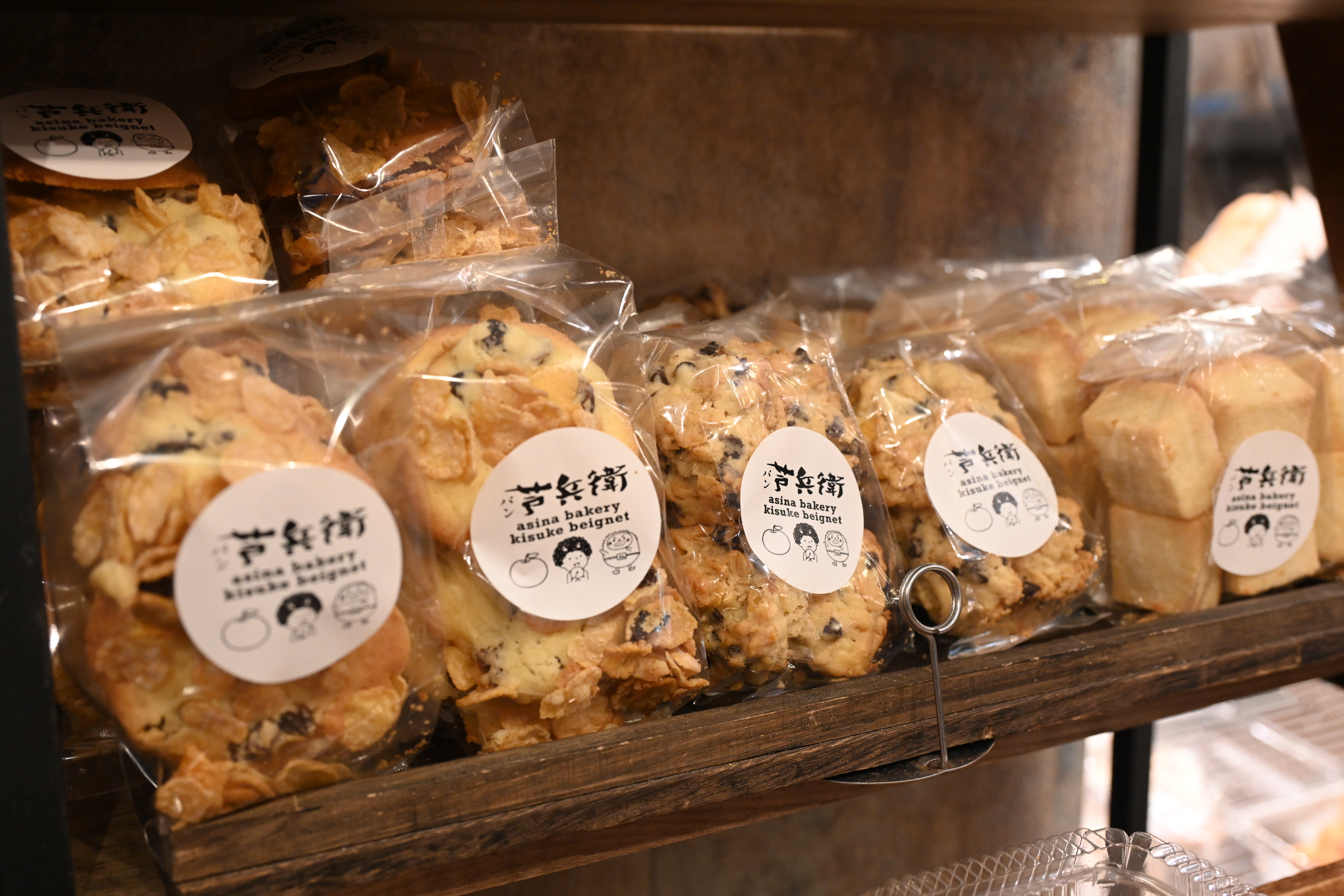 横須賀の人気パン屋「「芦名ベーカリー芦兵衛」が手がける「鬼助ベニエ」。カウンターのケースには、看板商品の揚げドーナツ「ベニエ」をはじめ個性豊かなパンや焼き菓子がずらり。惣菜系からスイーツ系まで常時80種類ほどが並び、どれを食べようか迷ってしまいます。