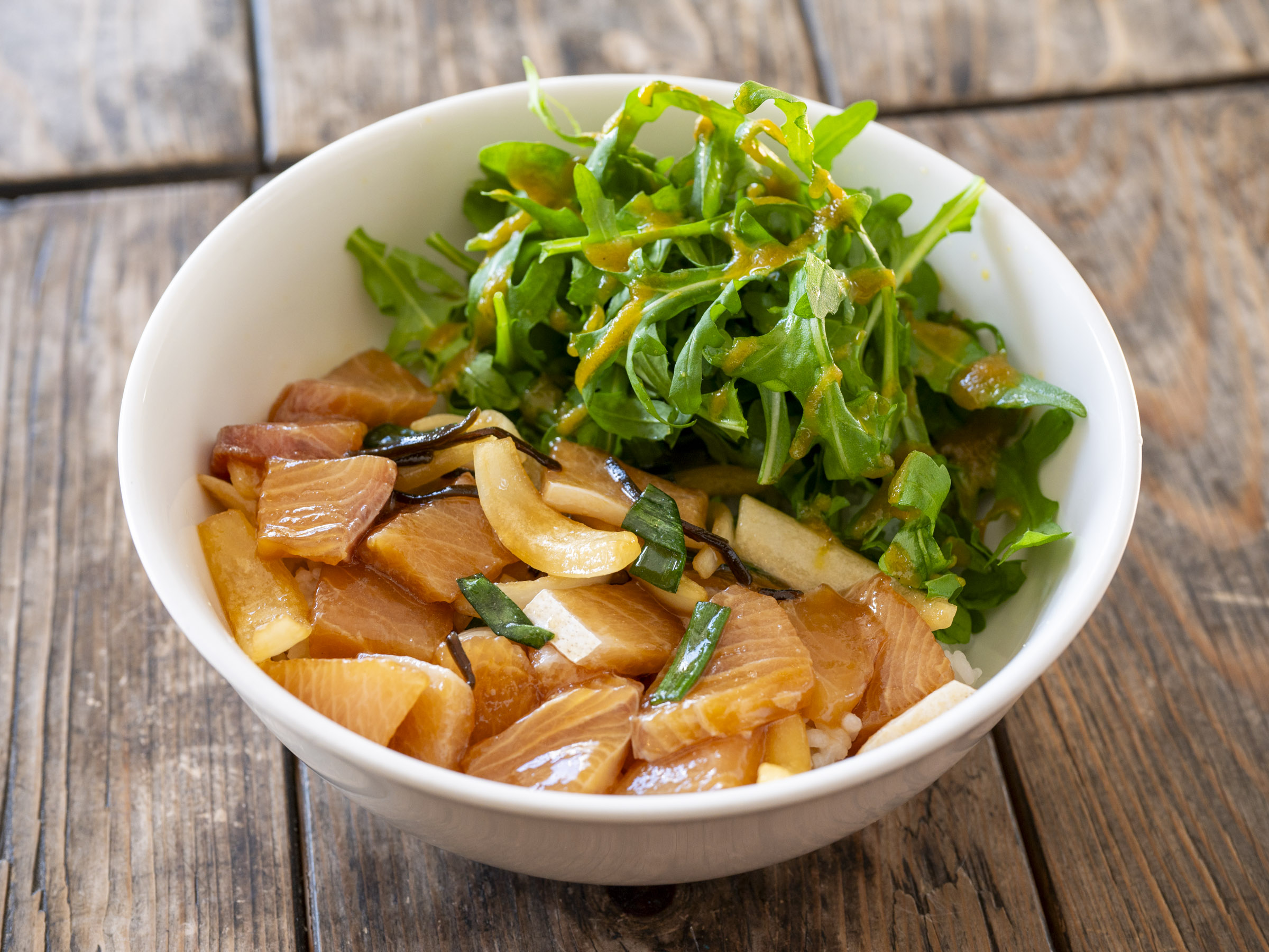 旬の魚を使った「ポキ丼」(1,430円〜 時価)もフィッシュアンドチップスと並ぶ看板メニューです。この日の魚はブリとコショウダイ。