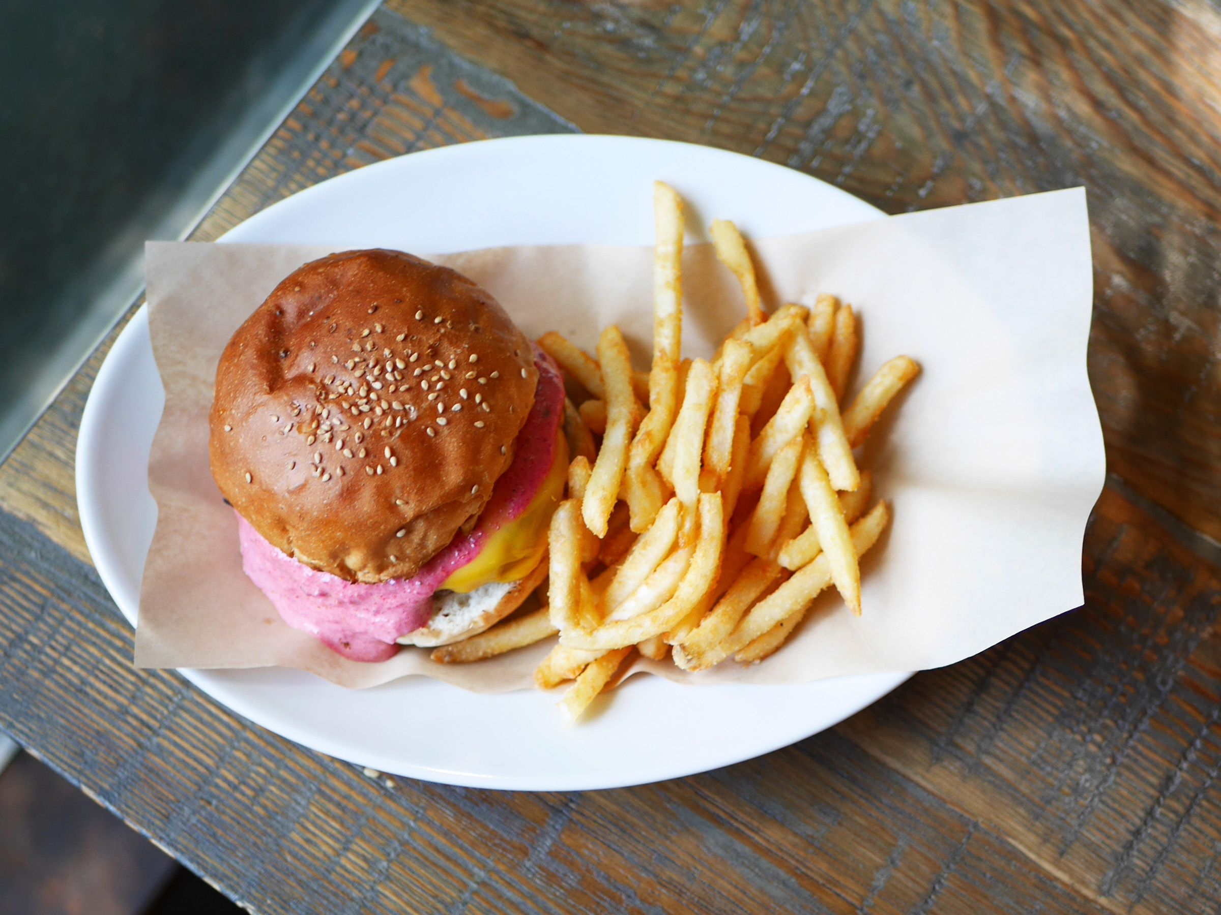 鮮やかなビーツのピンク、自家製ソースが特徴の人気メニュー「サニーサイドバーガー(2200円税込)」。驚くのは、ローストしたビーツの甘みと酸味が重なり、超粗挽きのビーフパティがさっぱりと感じられ、絶妙にマッチします。