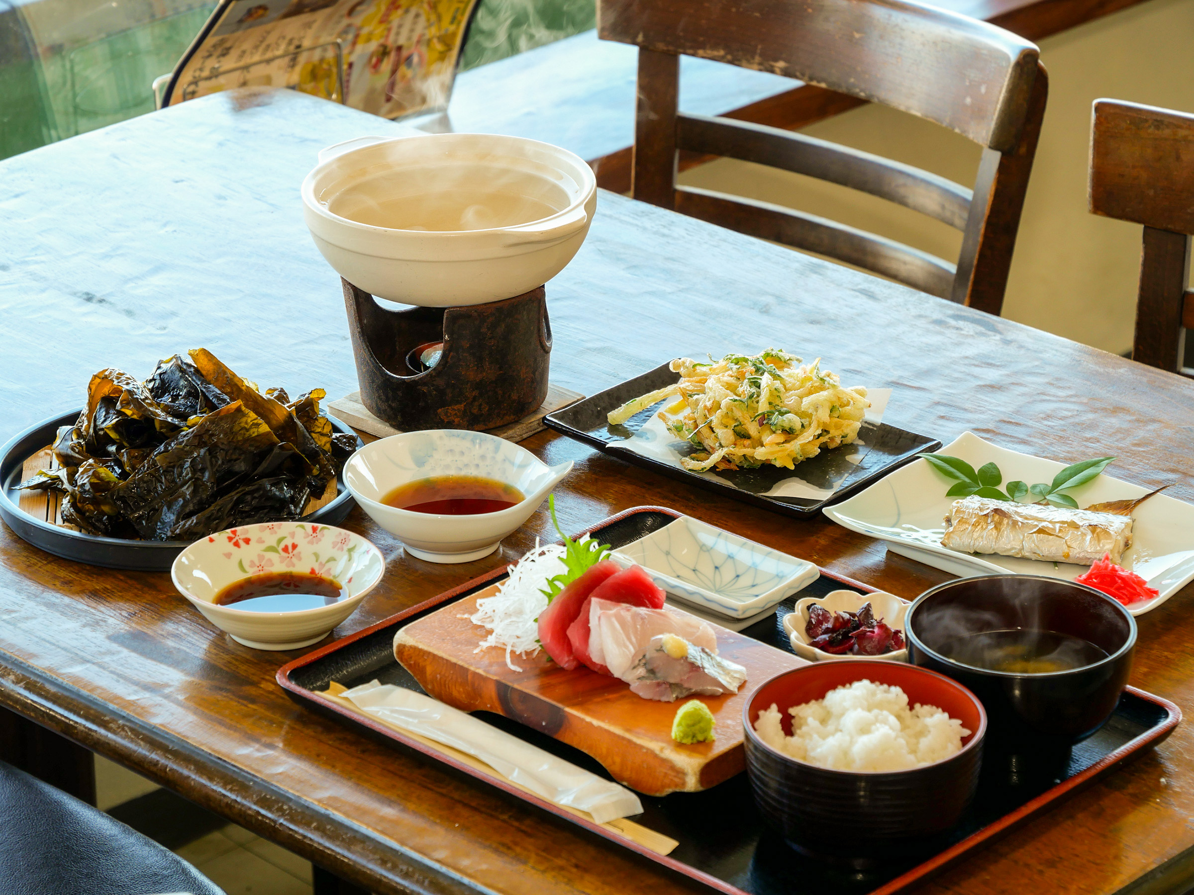 一番人気はランチタイムの「おまかせB定食」(1,980円)。金田湾の魚介類を使っており、刺身、煮魚or焼き魚、揚げ物、その他一品がセットになっています。どれにしようか悩んだら、これに決まりです。
